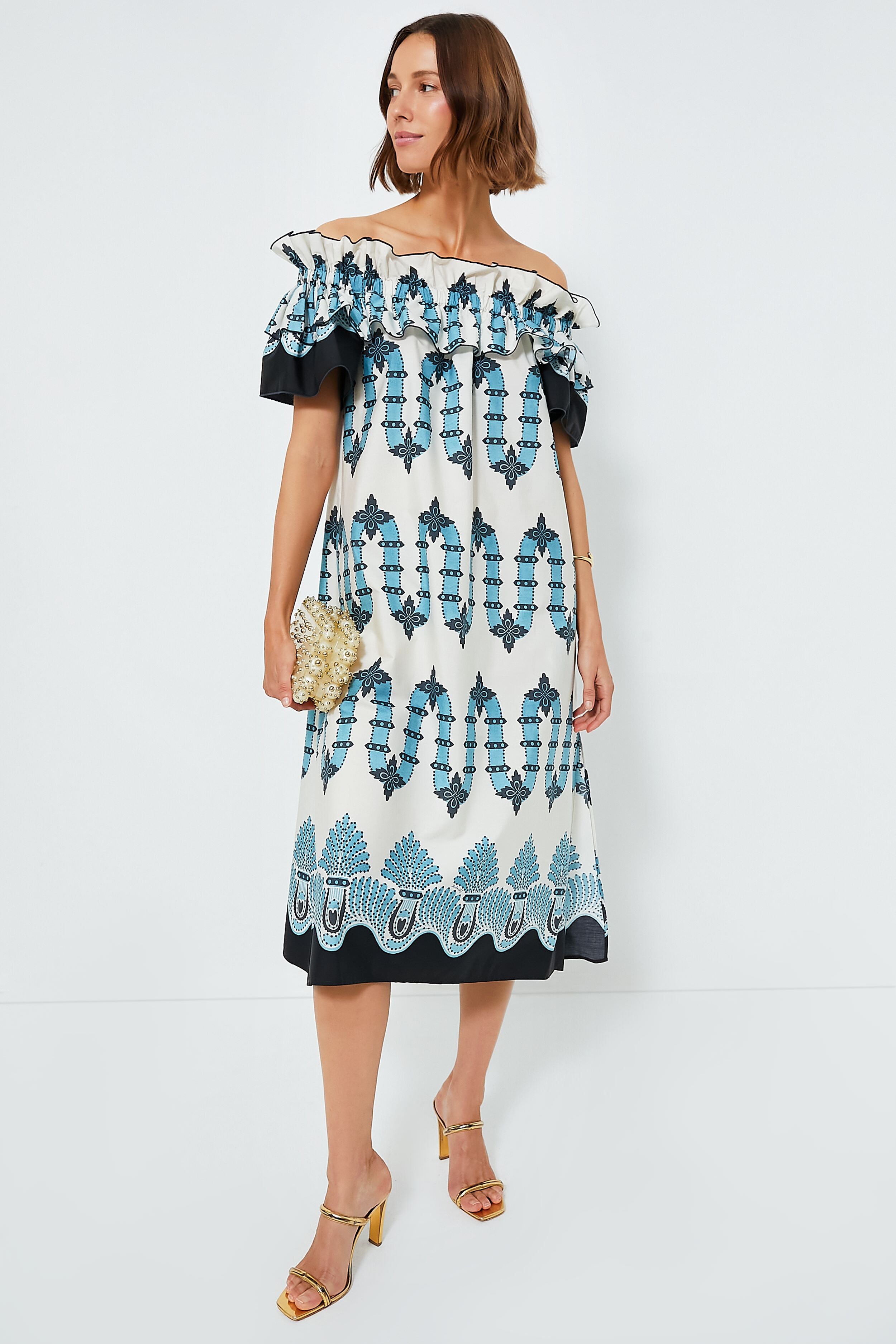 Black Rococo Floral Illustration Buttoned Midi Dress