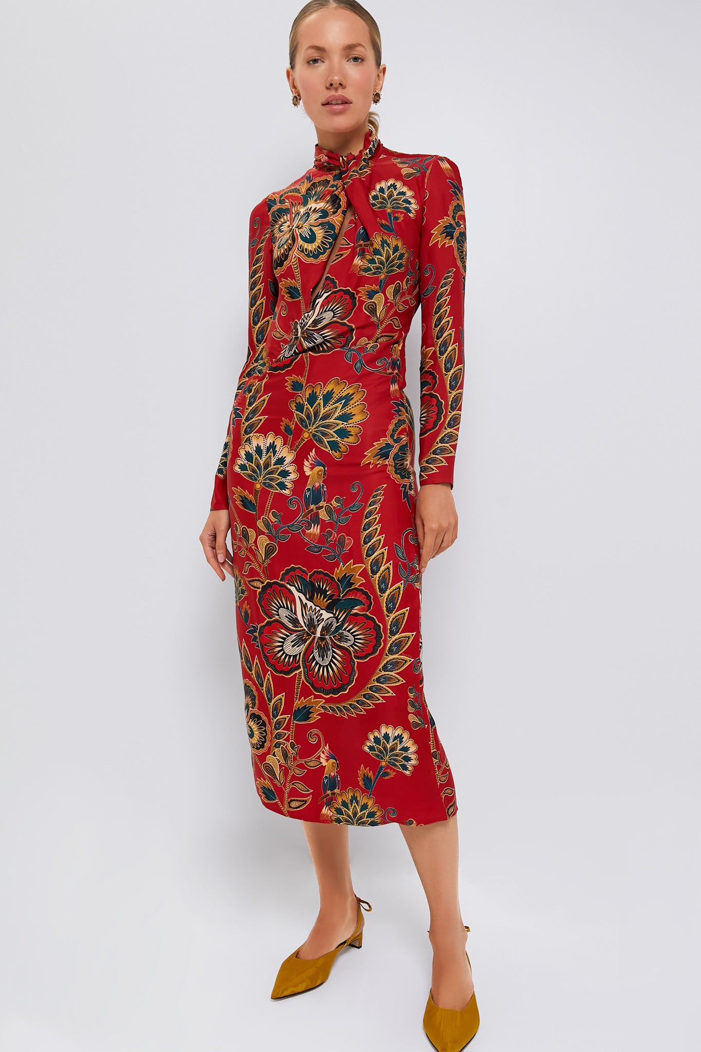 Red Floral Cutout Long Sleeve Midi Dress