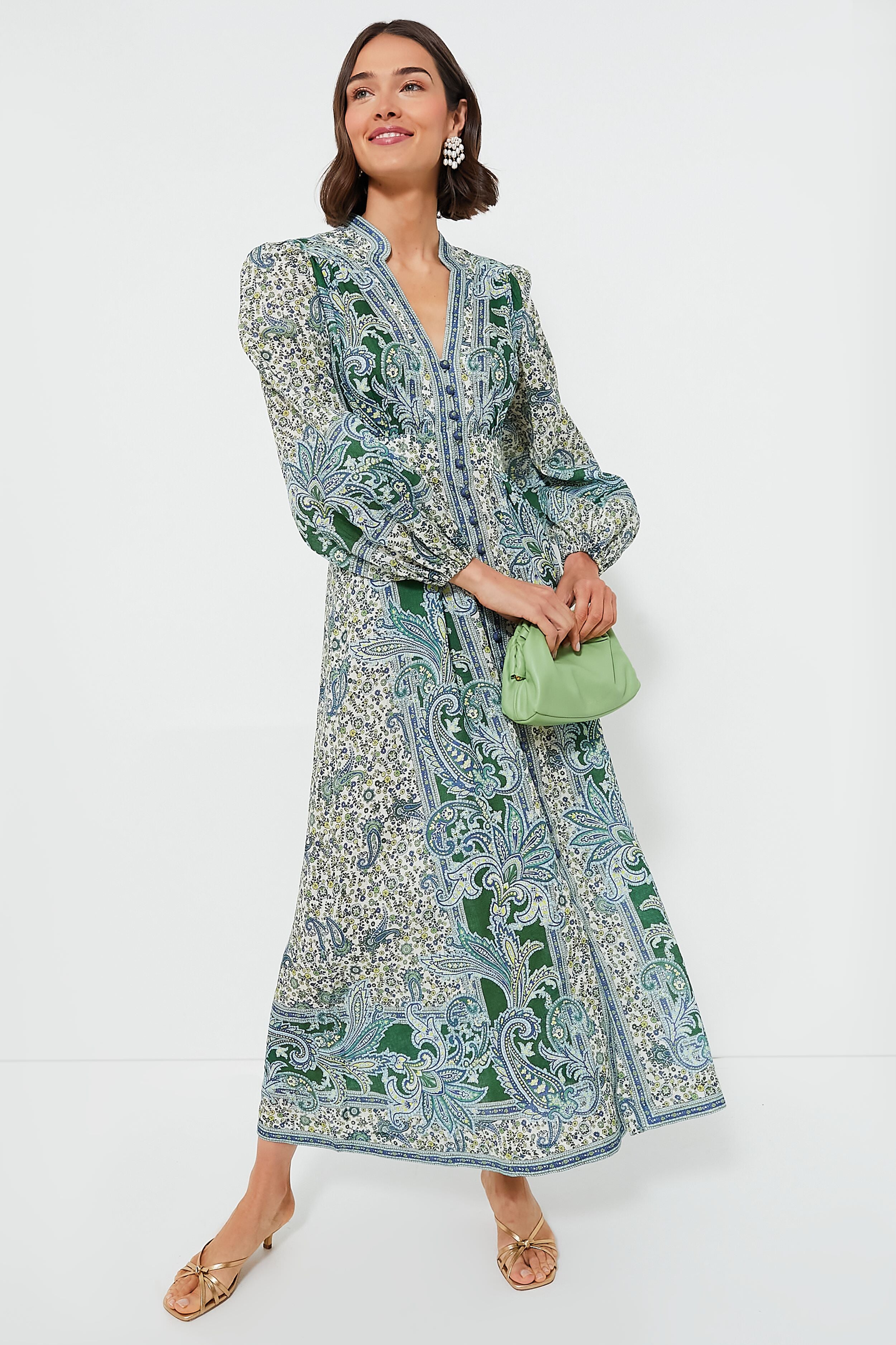 Green Paisley Ottie Plunge Midi Dress