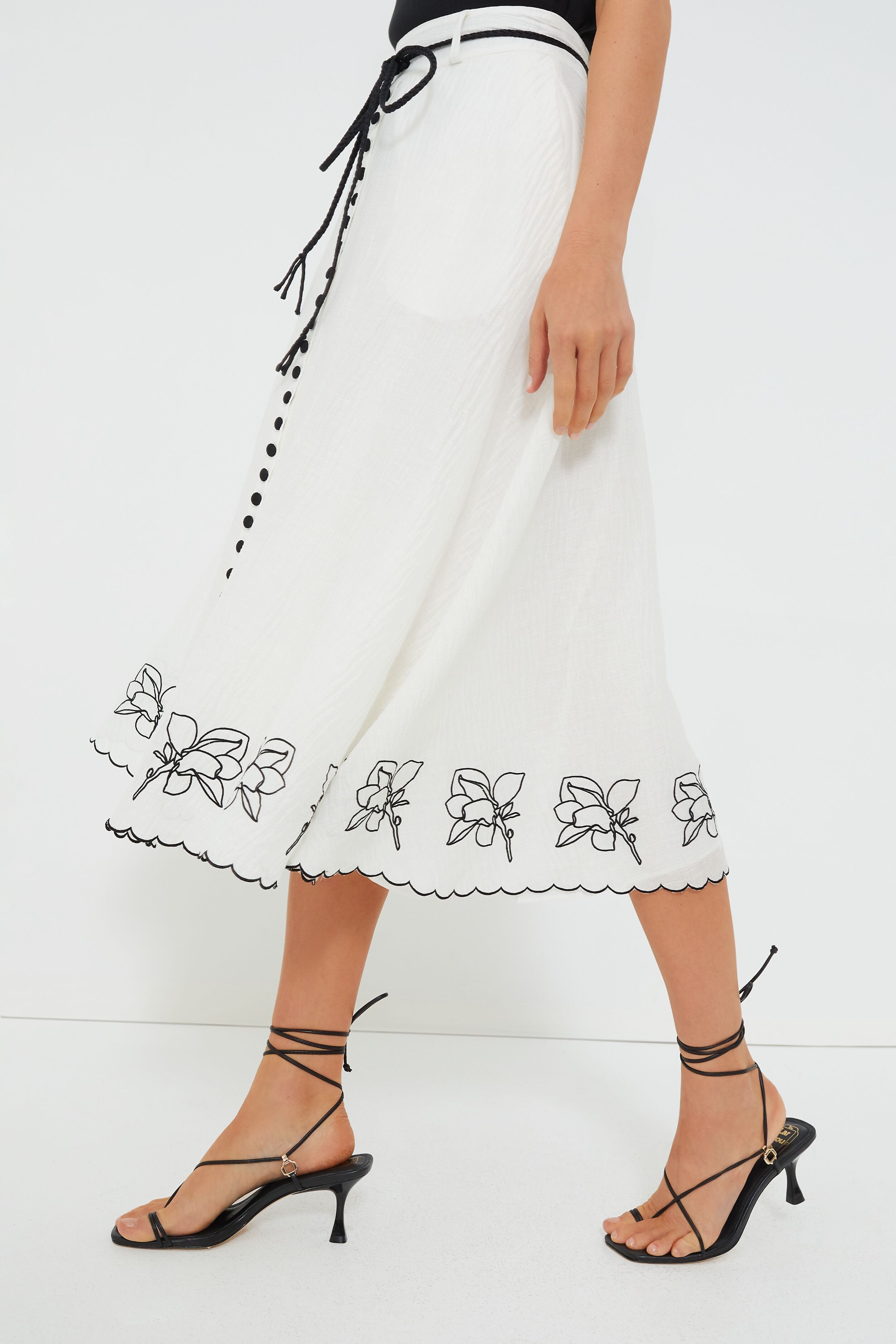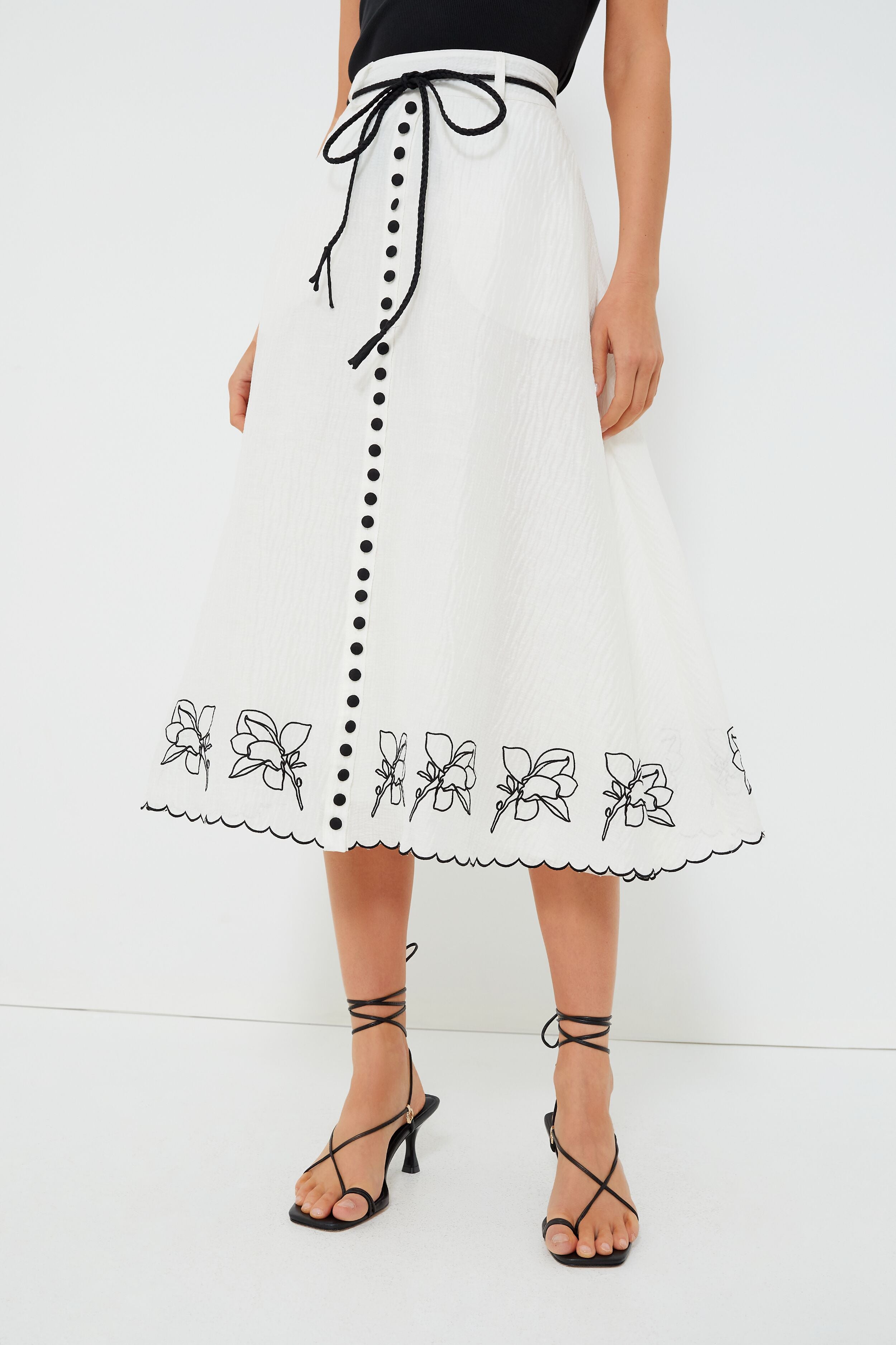 You will be poised and elegant in the Alba Black Grace Silk Linen Skirt. This midi is a full circle skirt. made from an airy silk linen blend with embroidered detailing along the scalloped hem. The self-tie waist allows for a perfect fit. and the front button placket is classic and cute. Pair with a simple black turtleneck. or with the Alba Black Gabriella Silk Linen Shirt for an unforgettable matching set.