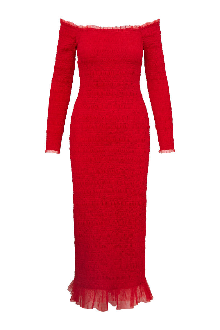Introducing the Avelle Dress. Designed from an easy and festive smocked tulle fabric. this sophisticated midi dress makes her debut. The bodycon piece begins with off-the-shoulder sleeves with delicate tulle ruffles at the openings. Ruffles line the neckline before falling to a figure-hugging bodice that flows to a pencil skirt with delicate ruffles at the hem for a spirited finish.