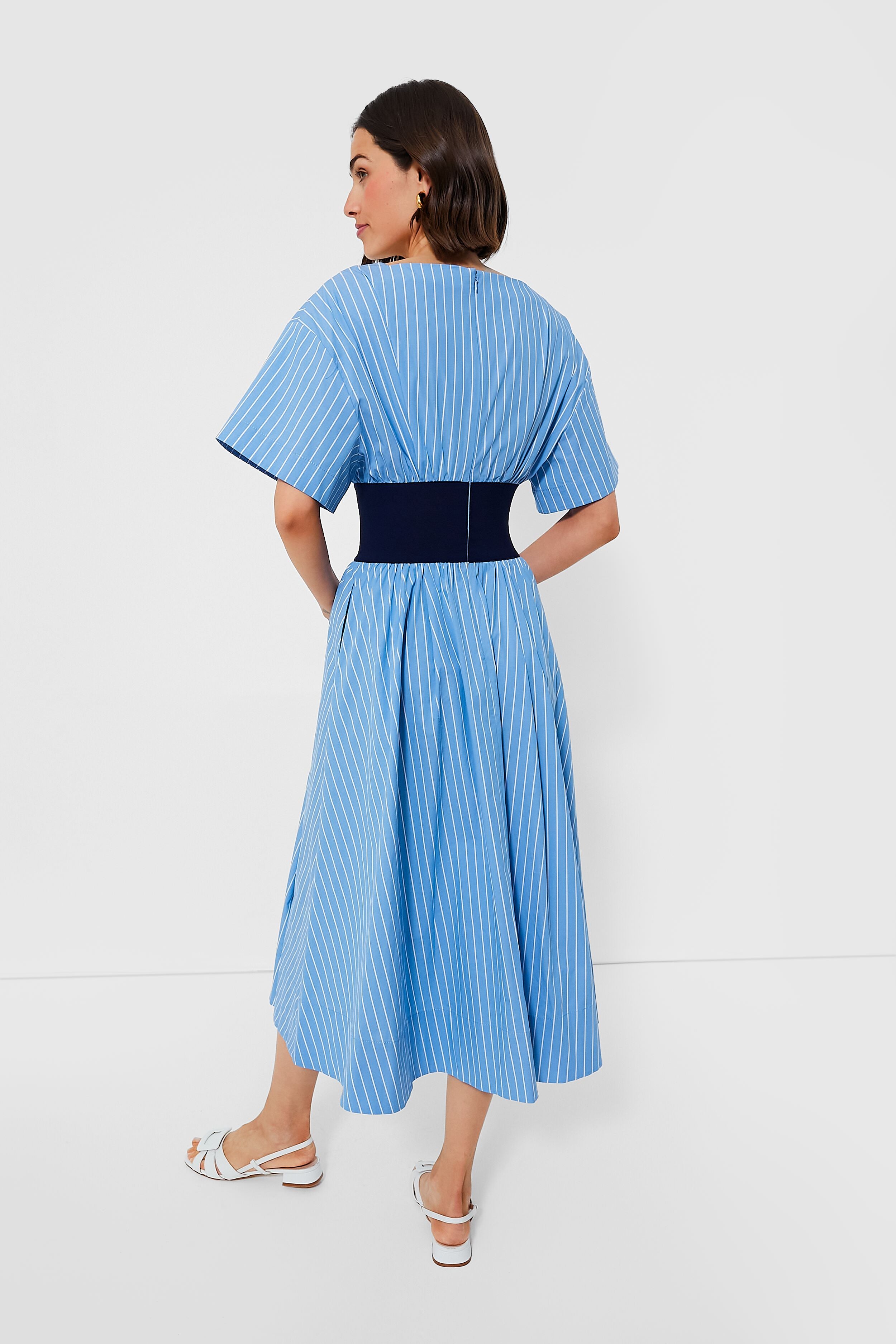 This eye-catching number takes your everyday staple wardrobe to the next level. The Azure Pinstripe Amy Dress features a high square neckline. short sleeves. and a wide elastic waistband. This maxi nods to a shirt dress with the classic pinstripe cotton fabric. but adds unique and elevated details. Pair with ballet flats are sandals!