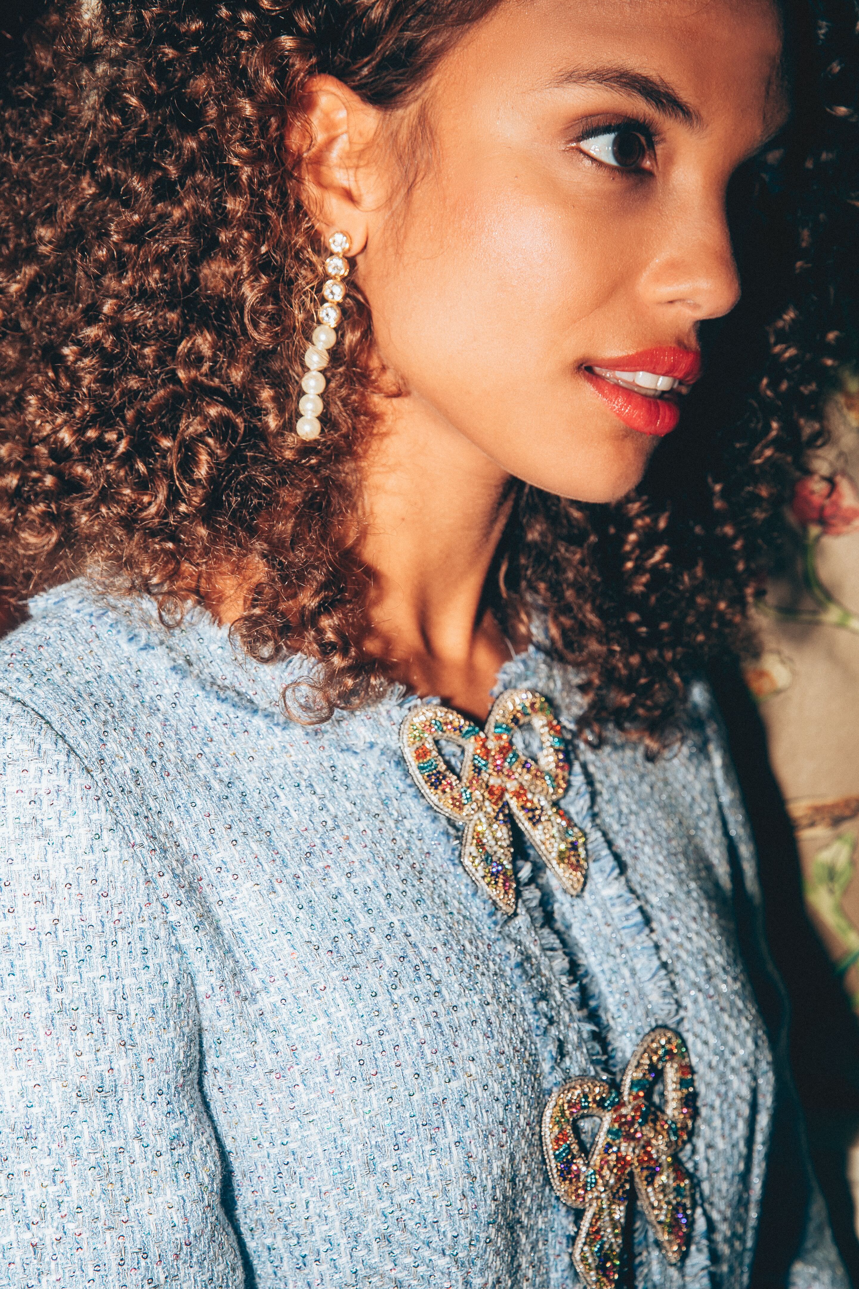 The Baby Blue Camille Bows Short-B Dress features an alluring split neckline held together by three decorative bows in a subtly-sequined blue tweed. Each embellishment is densely hand-embroidered with multicolor crystals and beads to create a unique trompe l'oeil effect. This chic mini features a fitted bust that flows into an A-line skirt that epitomizes elegance. An instant holiday party stunner. just add bold heels and accessories for a chic. classy look.
