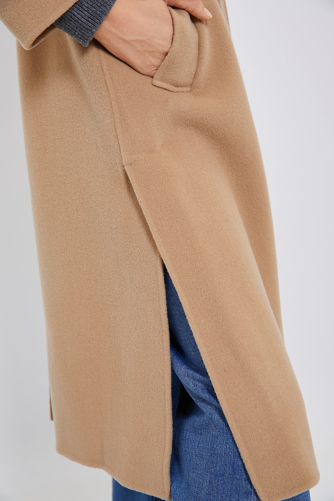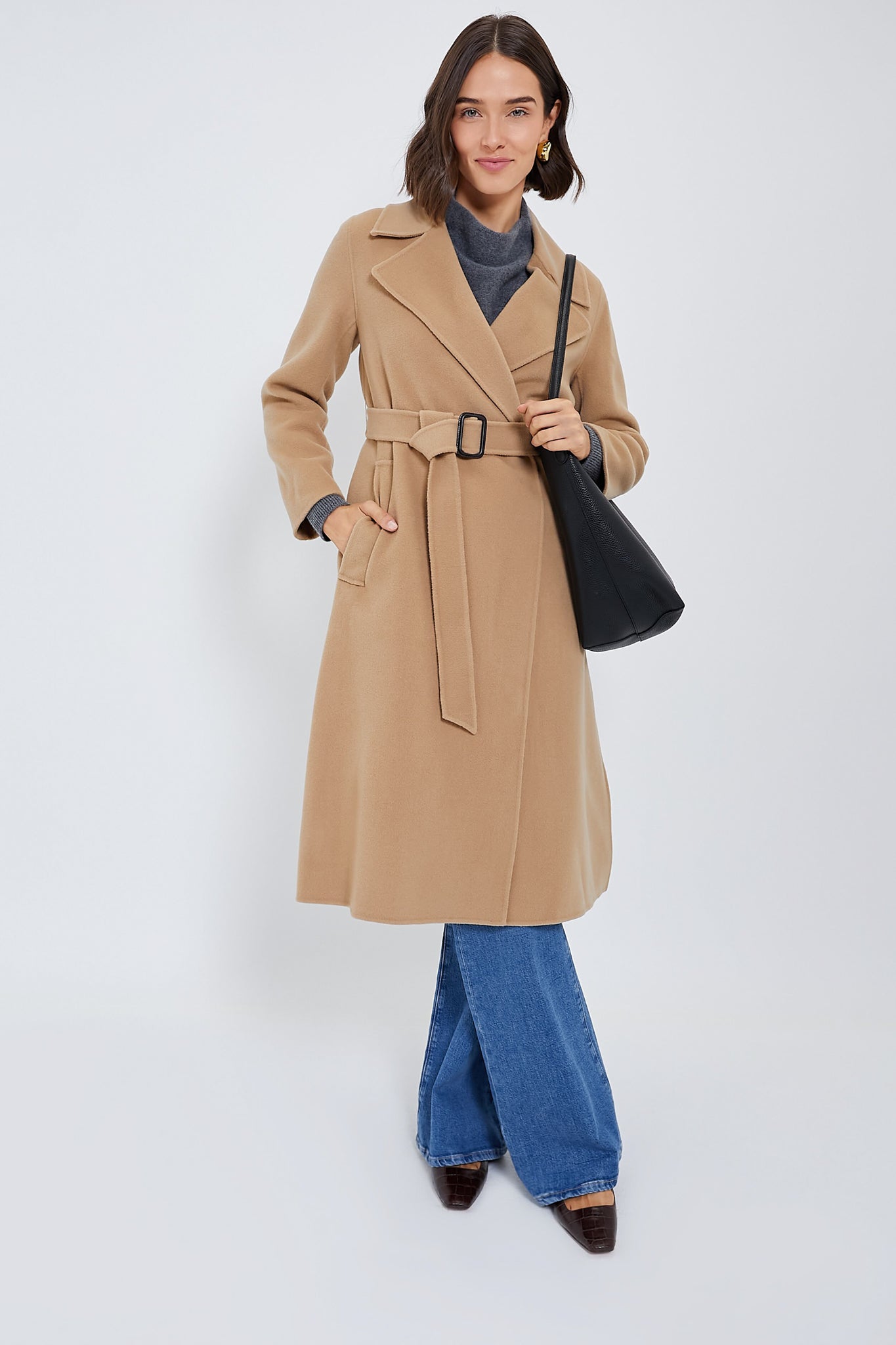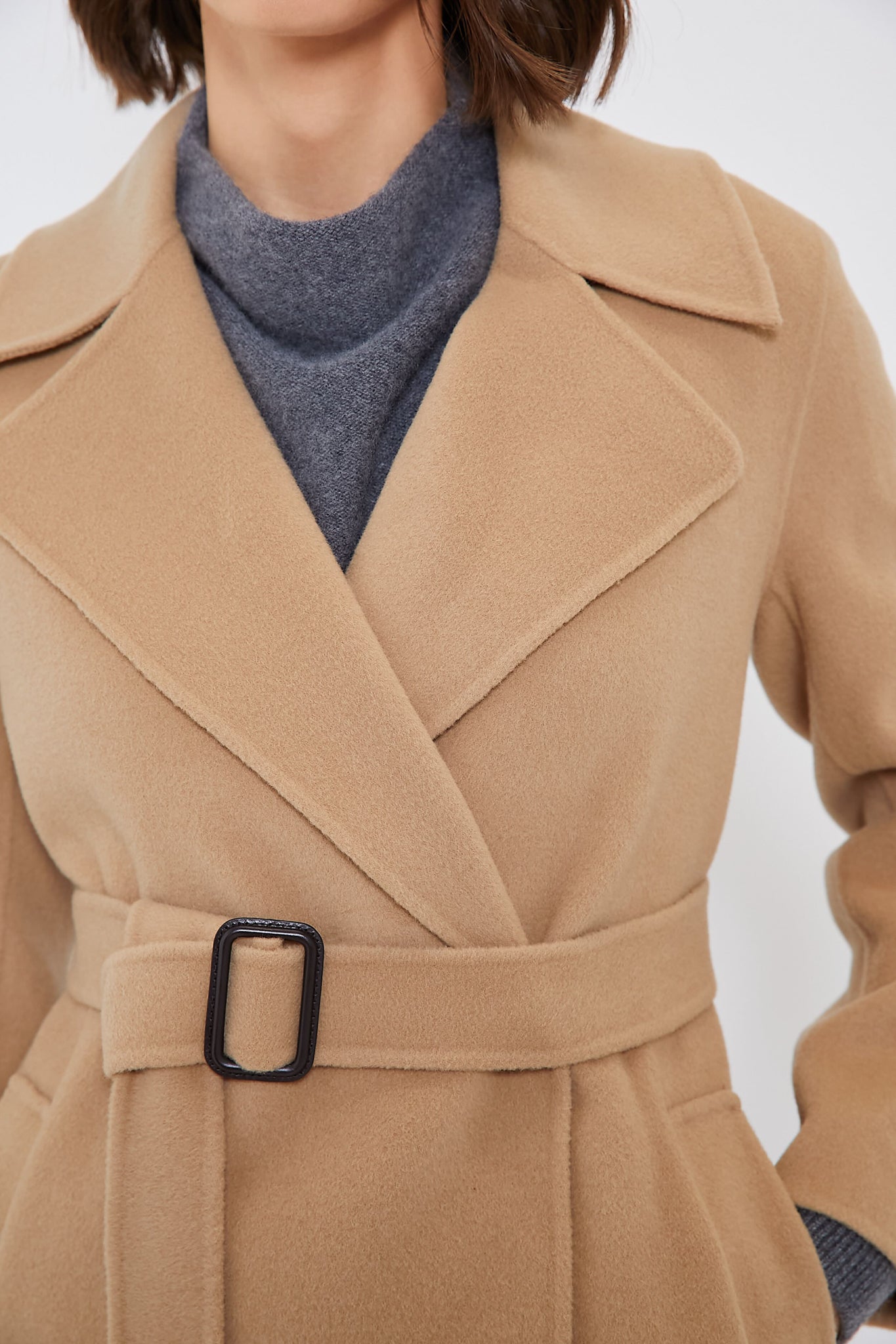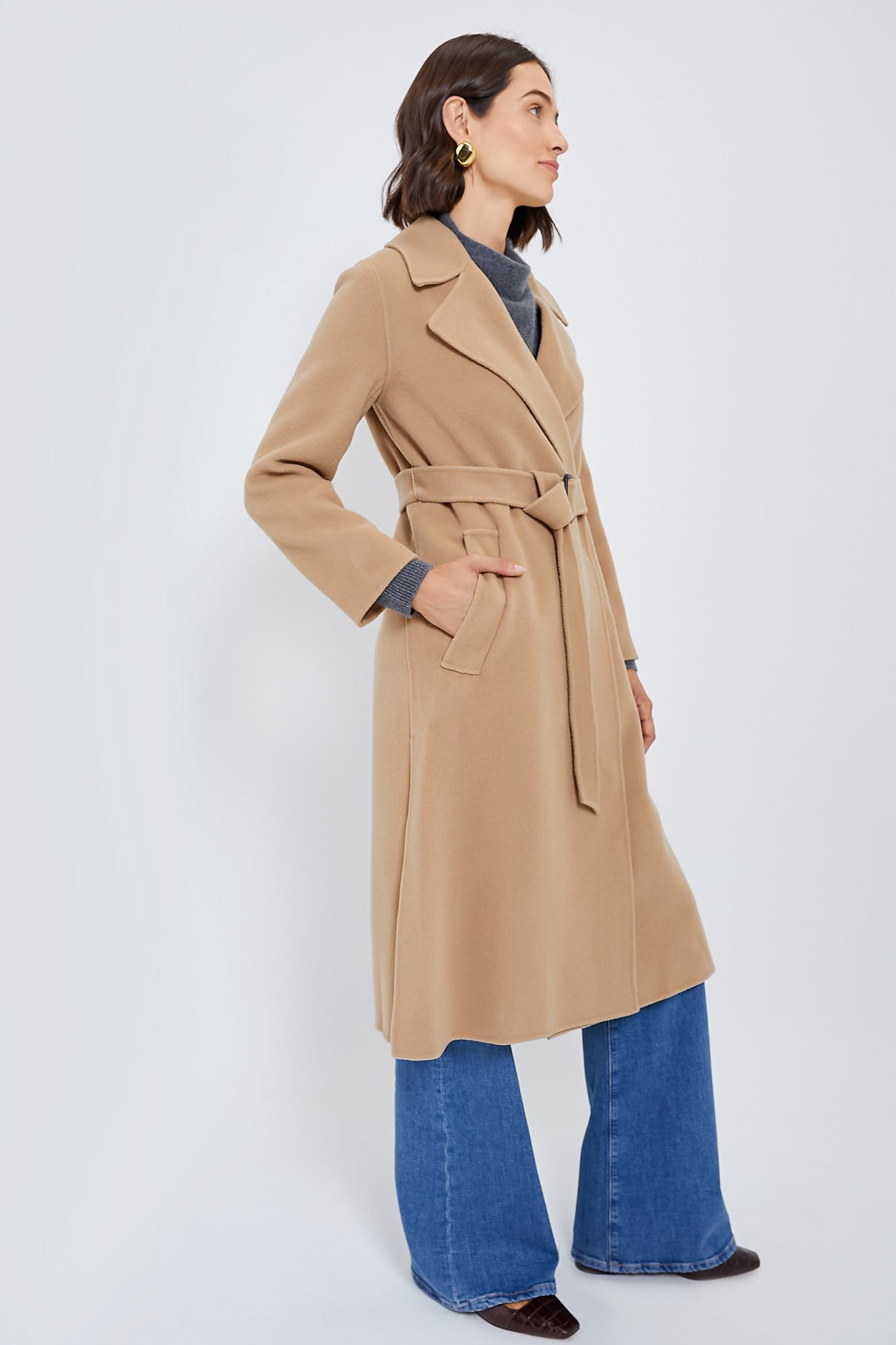 Crafted from a luxurious double-faced pure wool fabric. the Beige Manu Coat has us craving cold weather days. This wraparound silhouette boasts a wide lapel collar. long sleeves and welt side pockets. Finished with an adjustable belt for a look that's equally fashionable as it is functional — making this an easy number to pull out of the closet on short notice. Style with go-to denim and sleek boots for an effortlessly chic outfit formula.