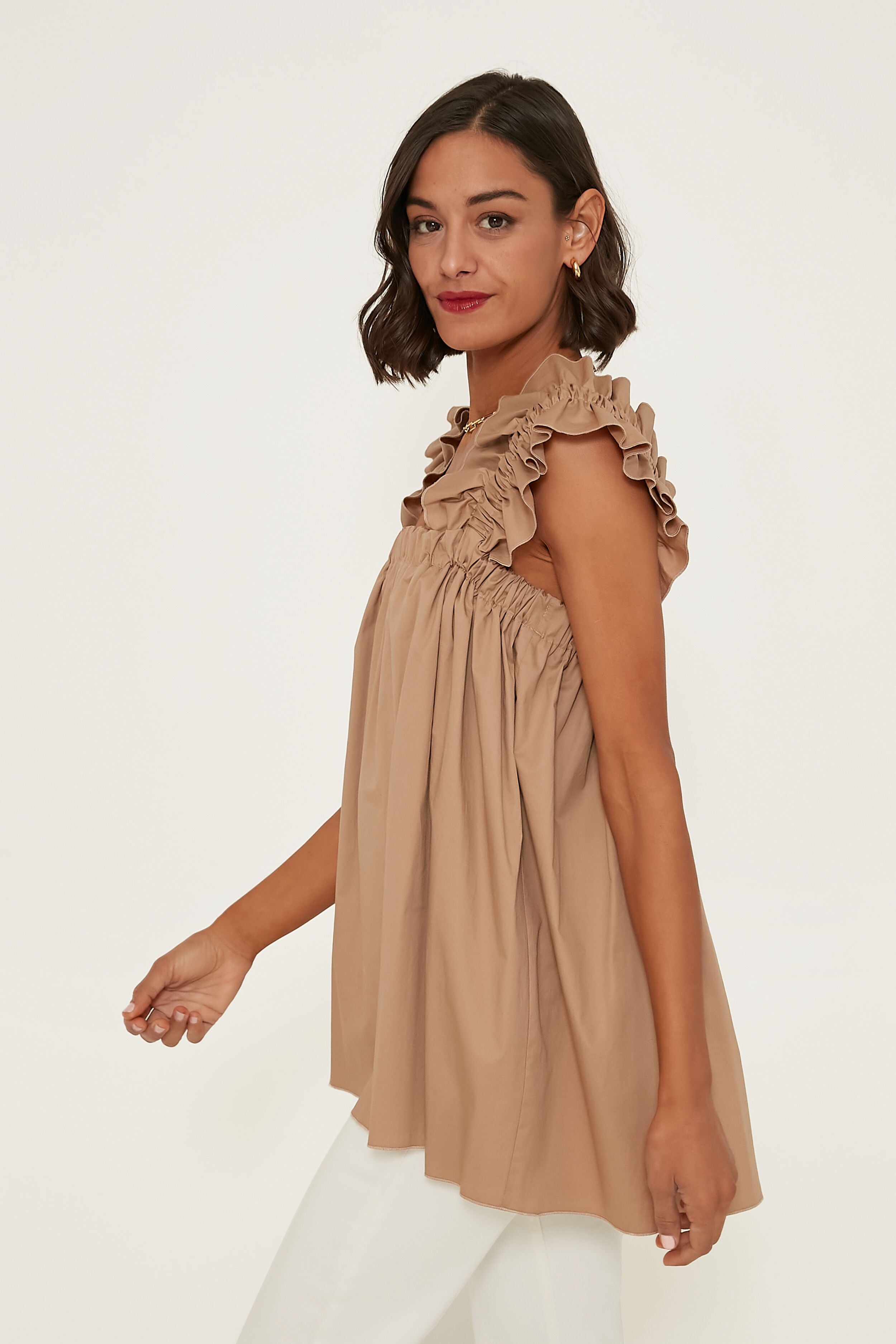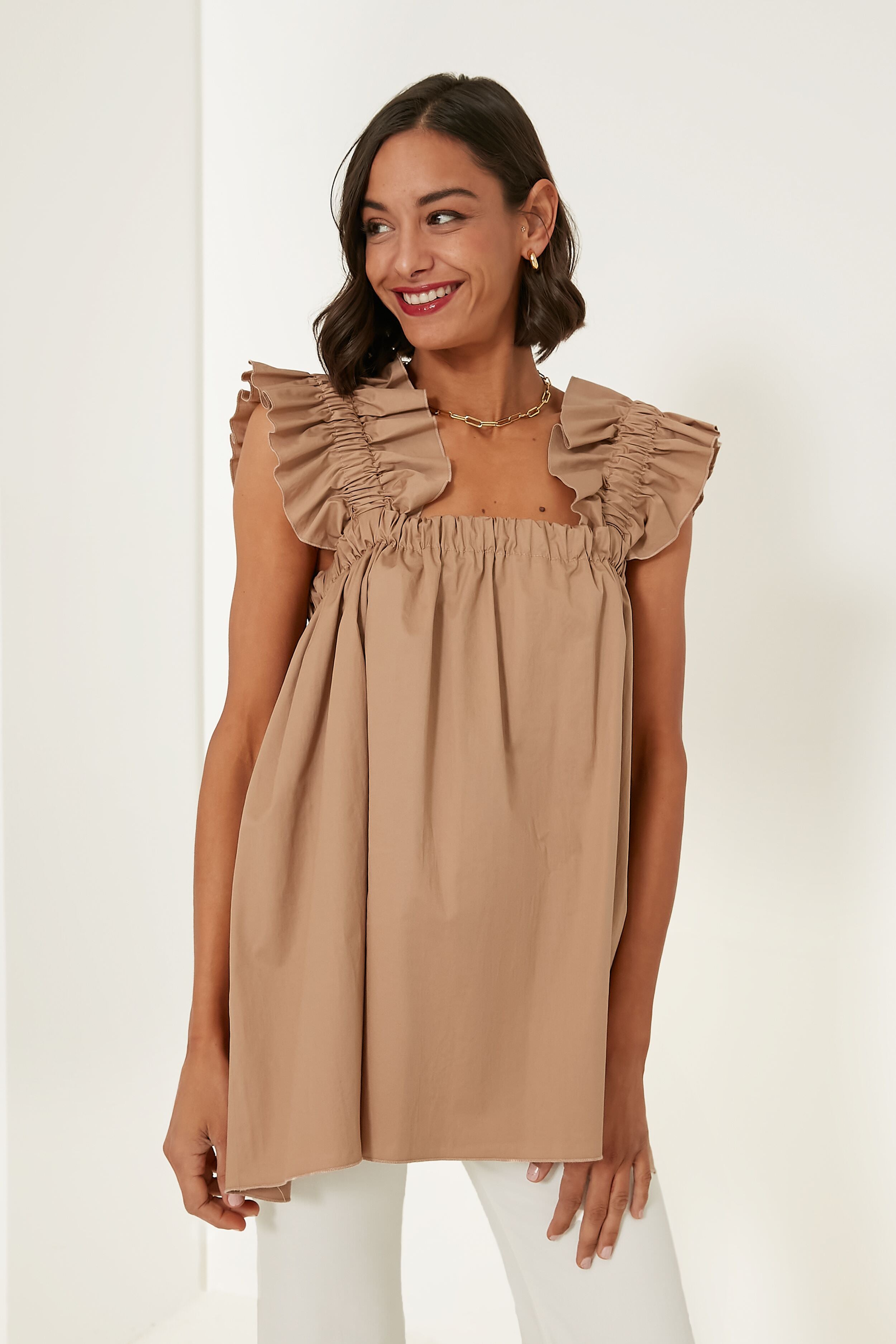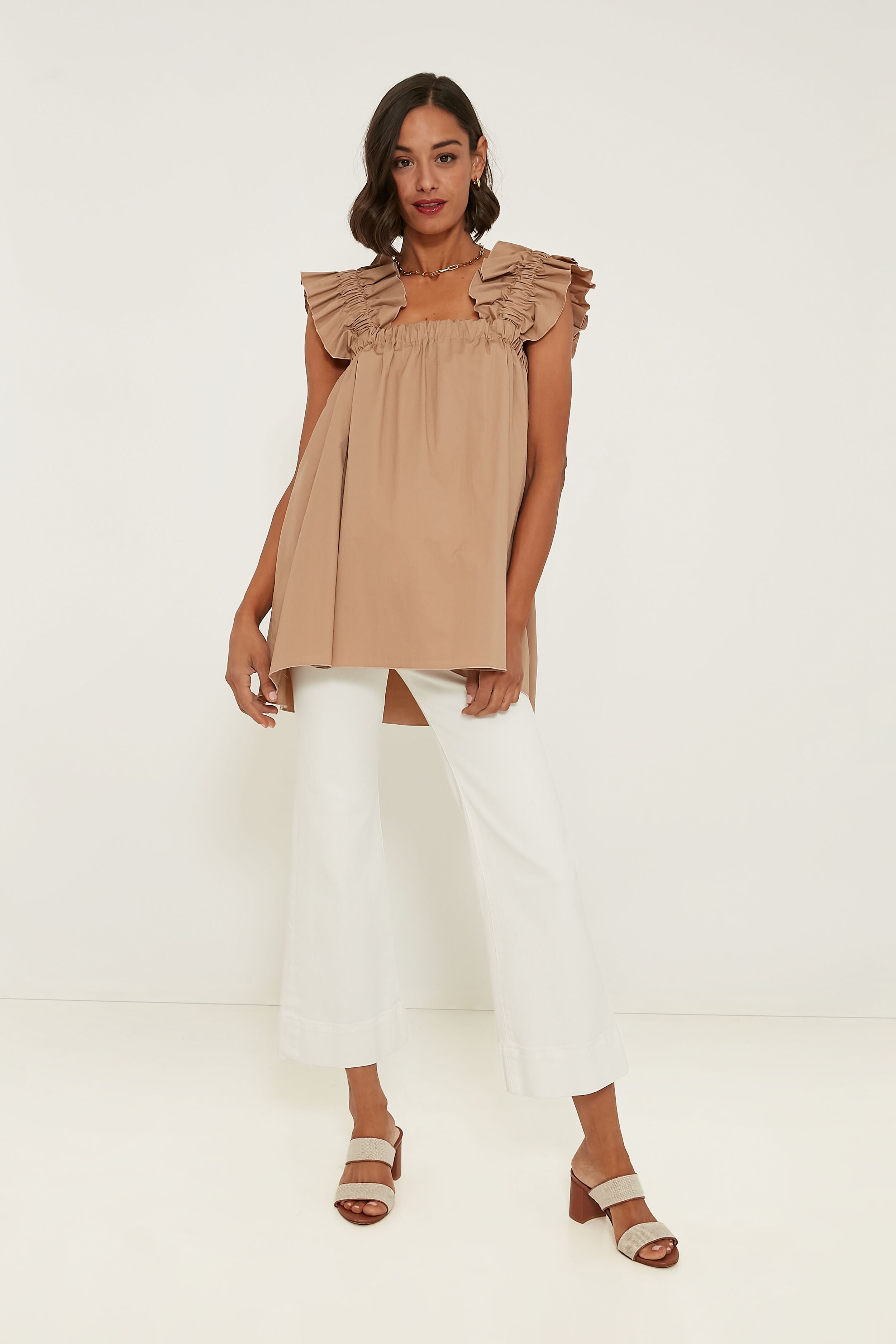 We can't help but think of days spent in the sunshine in the Beige Maya Long Top with its feminine silhouette and chic colorway. Crisp cotton with a touch of stretch takes this silhouette up a notch. and the fun and flirty oversized ruffles at the shoulders keep things light. This breezy. A-line tank is a necessity when the days get hot — it is so effortless that all you have to do is style with white denim. sandals. and sunnies for a casual-cool look.