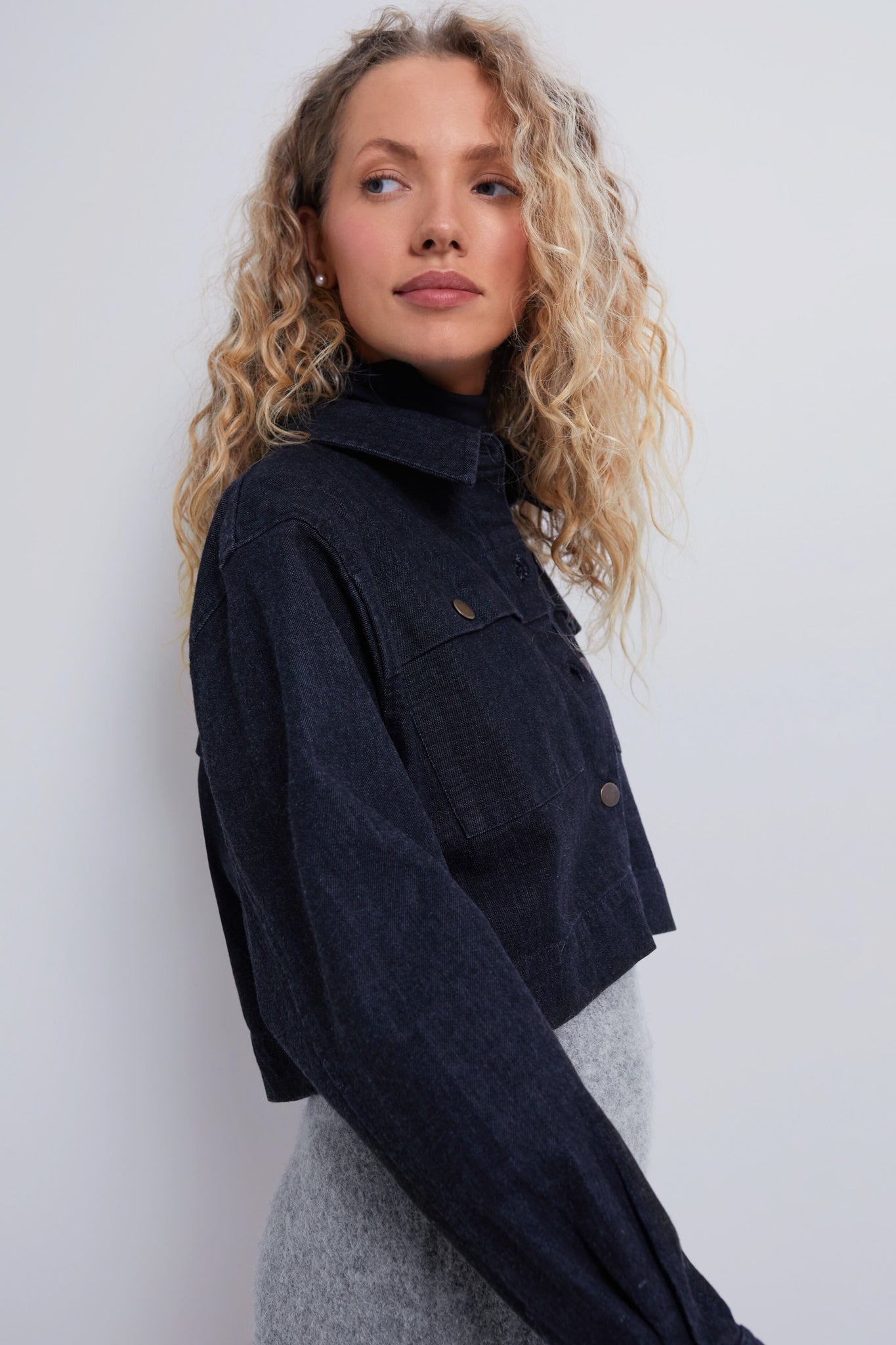 The Dean Black Denim Jacket by Cleobella is a sleek cropped denim jacket that effortlessly adds an edgy touch to your outfits. It is designed with a high quality denim. a front button closure. and flap side pockets. Pair with denim pants for a coordinated set. or with an A-line mini and ballet flats.