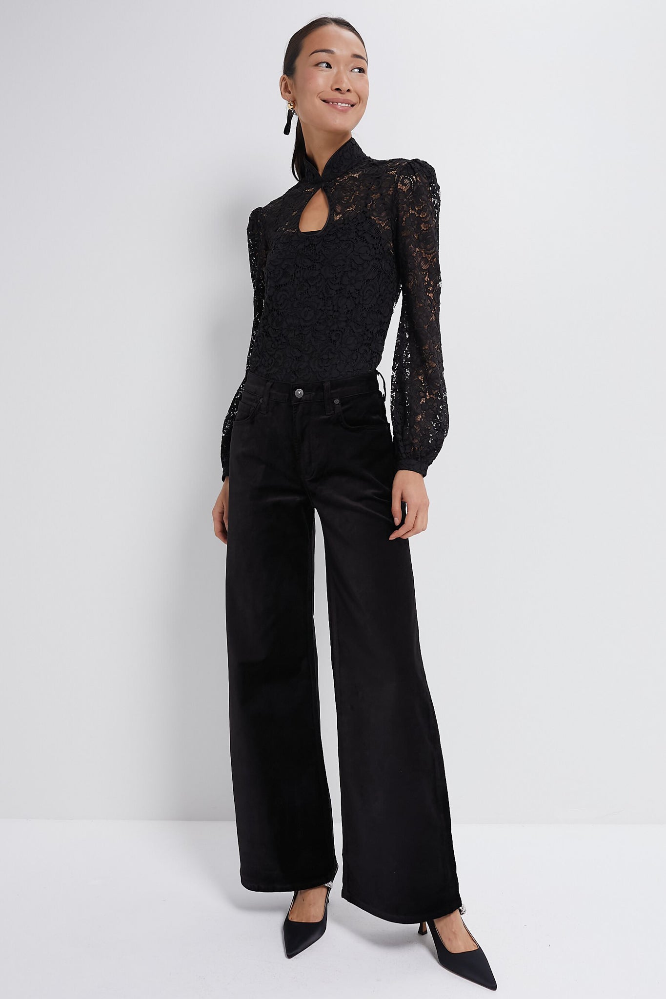 The Domino Top in Black is crafted from elegant Guipure lace. showcasing a delicate floral pattern that exudes timeless sophistication. This long-sleeved top features a high neck and a graceful keyhole neckline. while the sleeves are gathered at the cuffs. offering a subtle yet stylish detail that enhances the overall femininity of the piece. Perfect for elevating any look. we are styling it with a mini skirt and heels or black pants and boots.