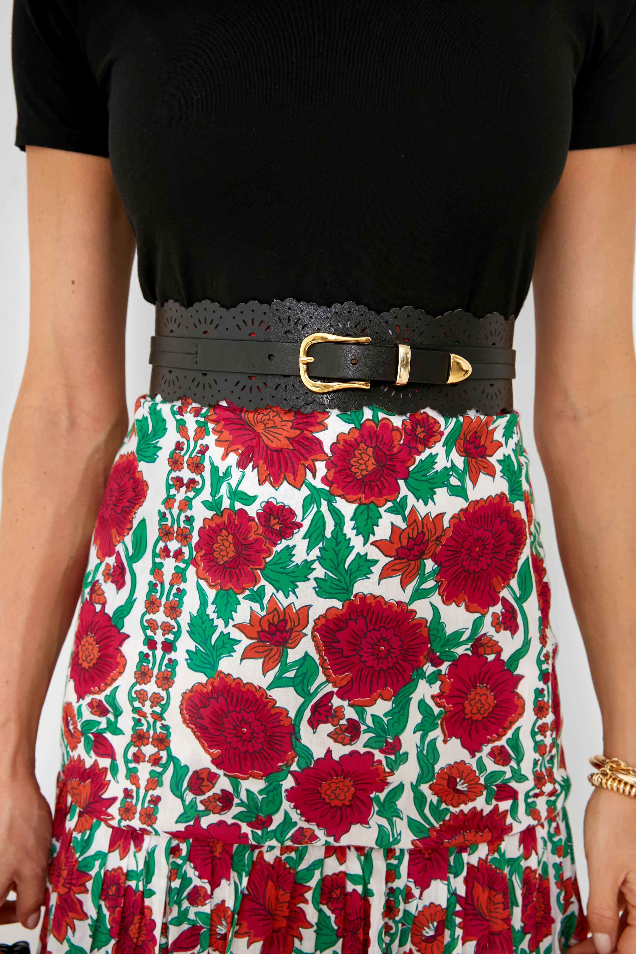 The Black Iris Belt is a super sweet style made of smooth Italian leather woven with scalloped edges and laser cut details. Fastened with gold hardware. this feminine silhouette is a must-have accessory and styling tool in any closet. Intended to be worn on the waist rather than the hips. it is perfect for pairing with flowy dresses and boxy tops to create a cinched-in. flattering figure.