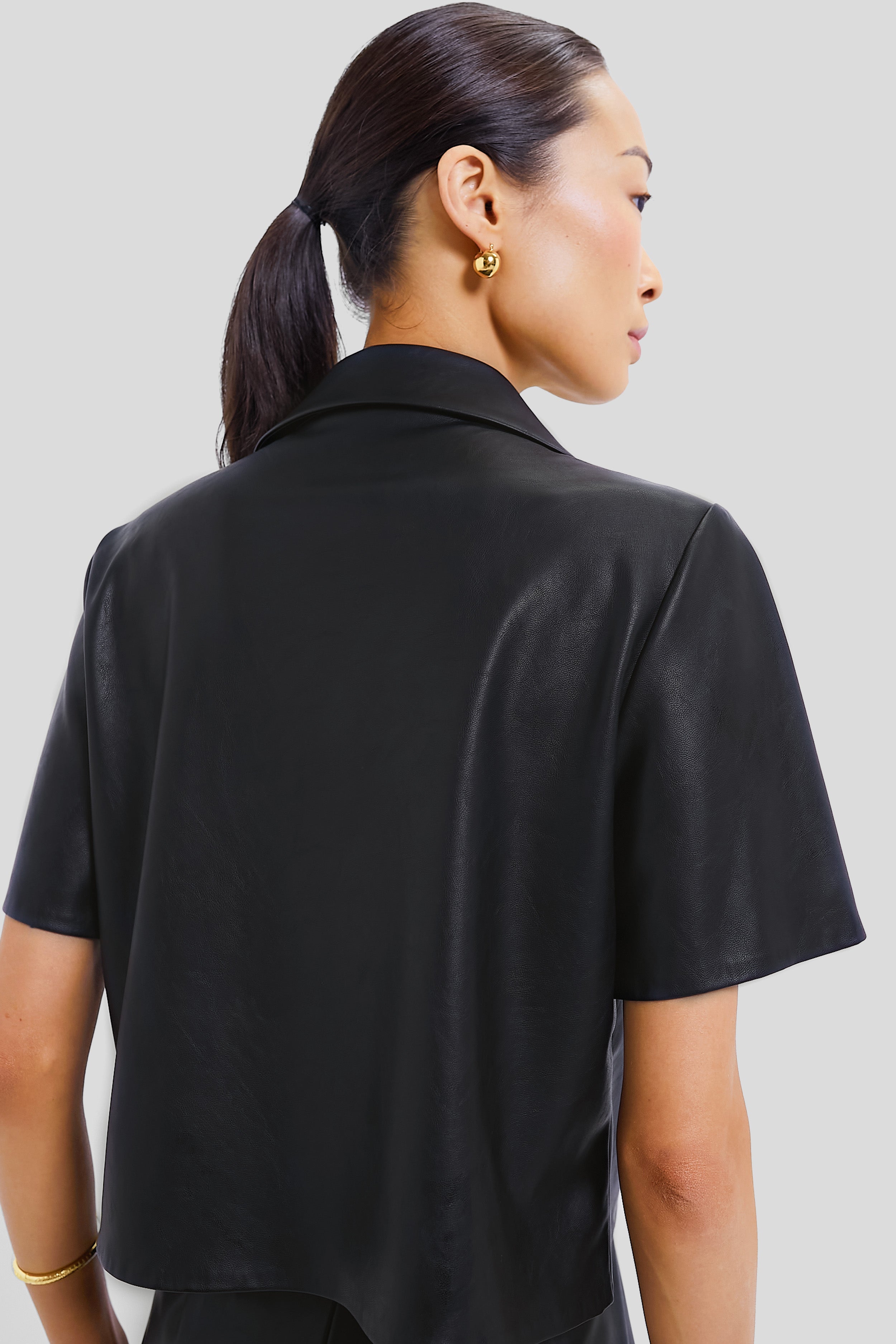 The Black Leather Audrina Top makes you achieve the perfect mix of sweet and edgy. With a boxy fit and slightly cropped silhouette. this charming number offers spread collar and self covered buttons. Pair with your favorite jeans and boots for an everyday chic look or dress it up with a leather skirt and heels for the date night 'fit.