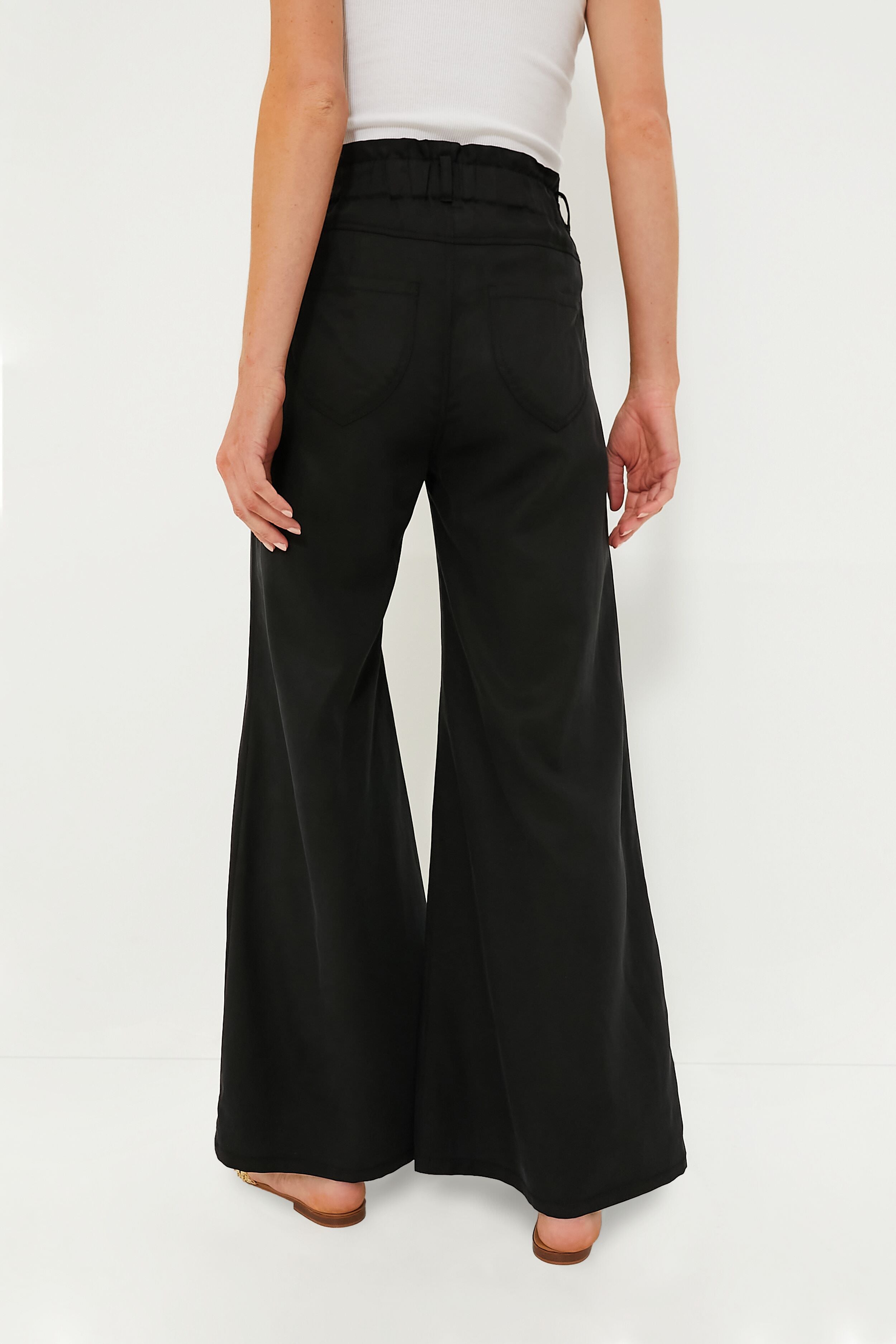 A vintage-inspired bell bottom silhouette. we are loving the retro vibes of the Black Linen Tulip Pants this season. Comfort is the name of the game with these wide leg bottoms — they are pre-broken in for a soft hand feel and nice drape. and the elasticated paper bag waist feels good enough to wear from day to night all year long. Lean into the old school look and pair with a bohemian-inspired blouse or a cool graphic tee. or style with a cozy sweater and sneakers for an off-duty weekend outfit.