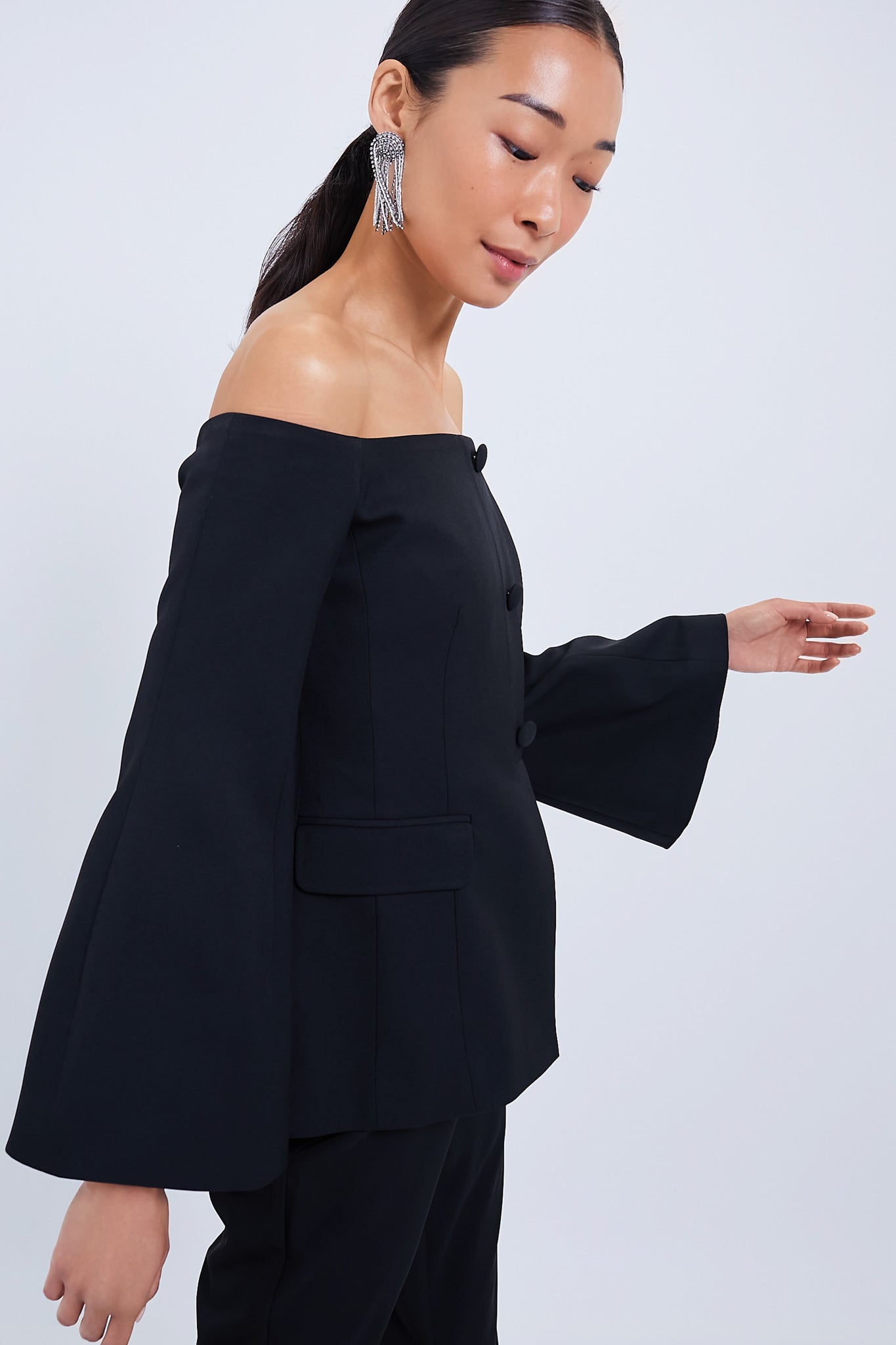 Feel put together and polished for special events in the Black Bria off-the-shoulder blouse. From festive holiday parties to fancy date nights. this off-the-shoulder blouse was designed to stand out for special occasions and year-round wear. Simple yet chic. this flattering silhouette transitions easily from day to night. and can be worn in any climate. Decorated with covered buttons. long bell sleeves. and faux pocket details. this timeless top is one you'll reach for whenever dressing up is a requirement.