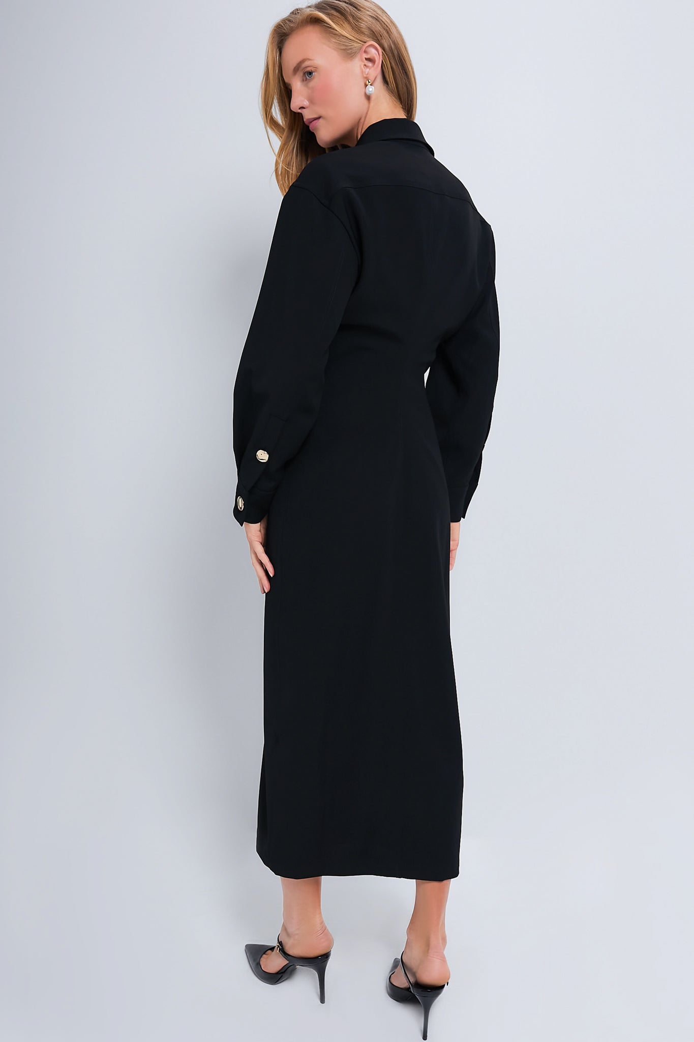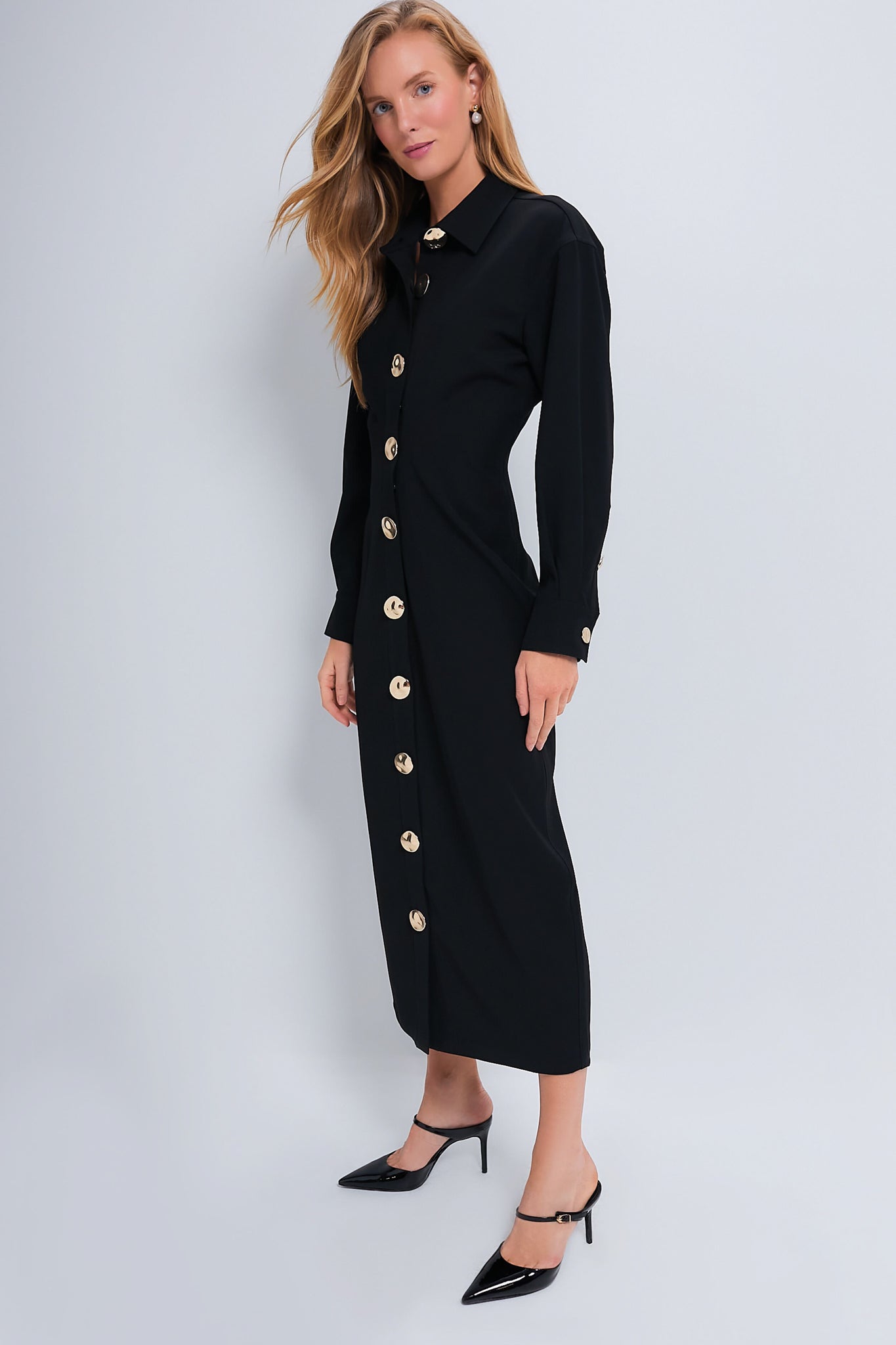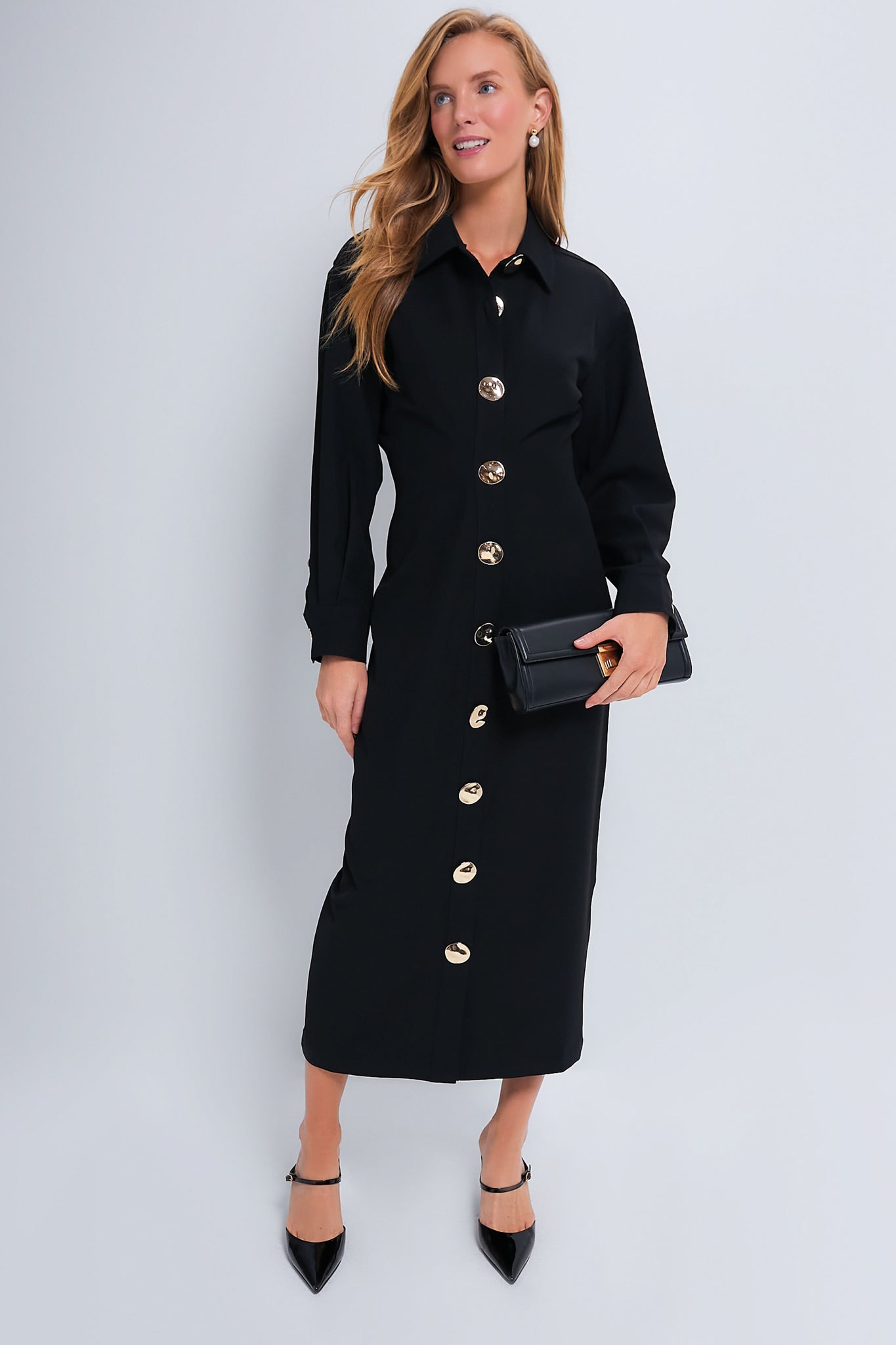 The Petra Dress is a modern take on a classic black dress. Featuring statement gold buttons down the front. a slimming waistline. and midi length wear this for work or play! We chose to style it with heels and a pearl drop earring.