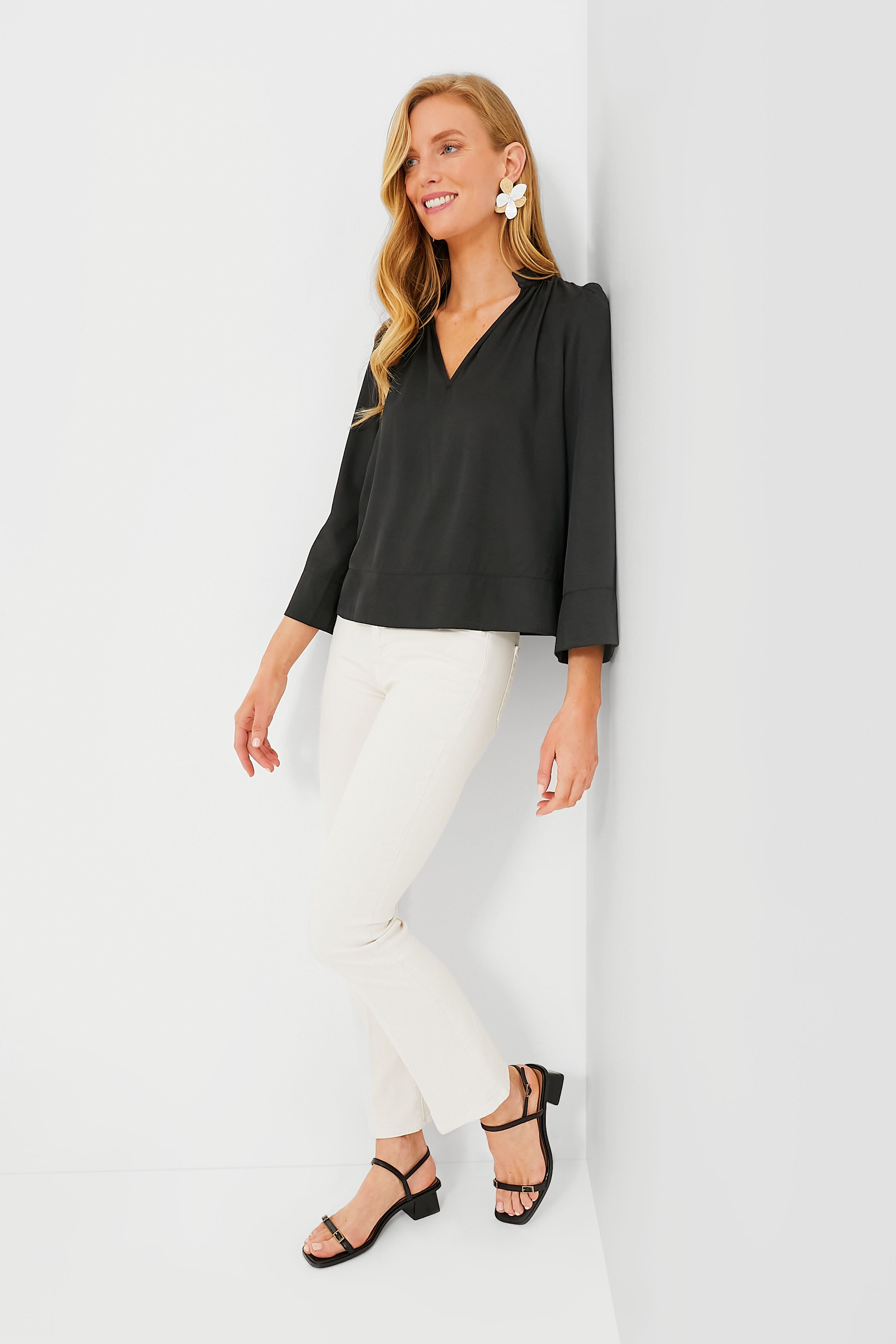 Effortlessly elevated. the Black Phillipa Blouse is a feminine silhouette that can be styled for countless occasions. This top drapes off the body in the most flattering way and features a stand collar with a gathered neckline. bracelet length sleeves. and a lightweight fabric that feels soft to the touch. Opt for light denim and sandals for a glamorous brunch look and swap for trousers and flats for a day in the office.