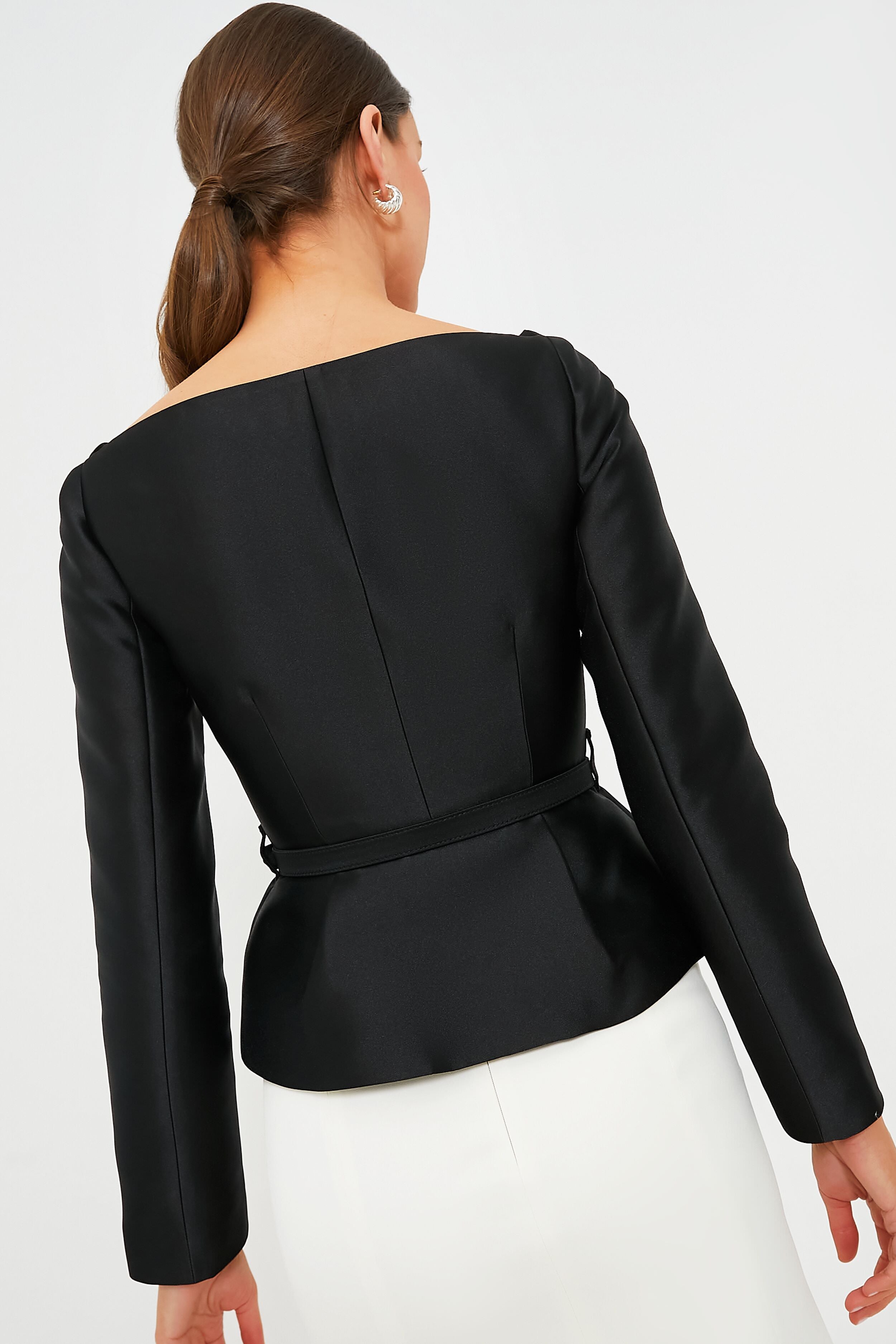 An ode to classical tailoring. Black Taffeta Jacket is perfect for work meetings or date nights alike! Cut from taffeta for its structure and pearlescent sheen. this absolutely chic number boasts a flattering double breasted silhouette with an off shoulder neckline and peplum waist creating a sleek line that can be styled over and over again. We are pairing this with black pants and heels for a cocktail bar. or with a skirt and gold jewelry for a dinner party.