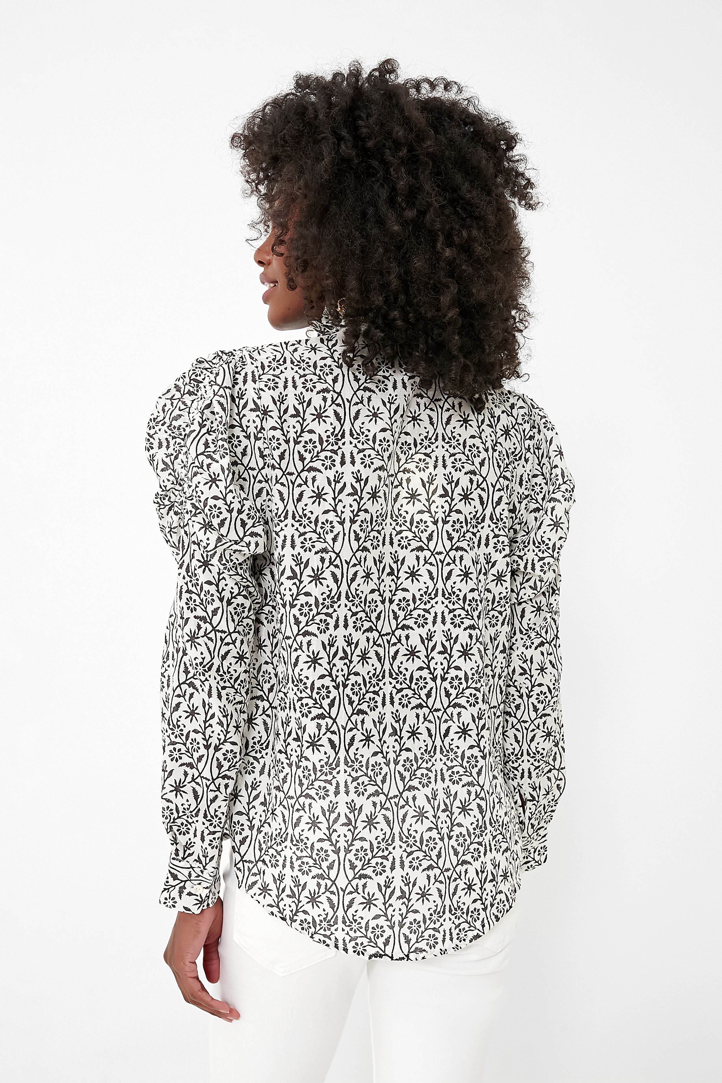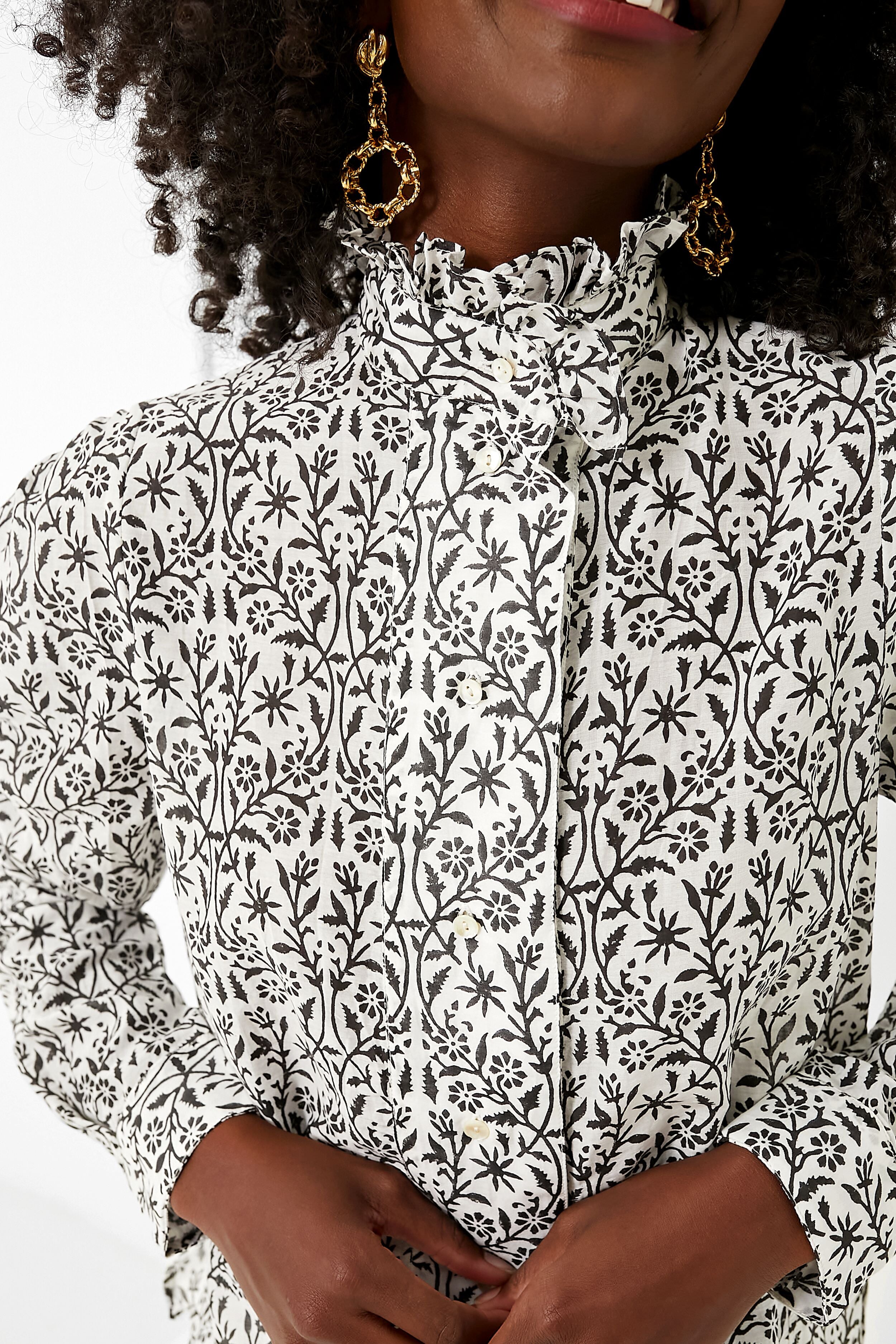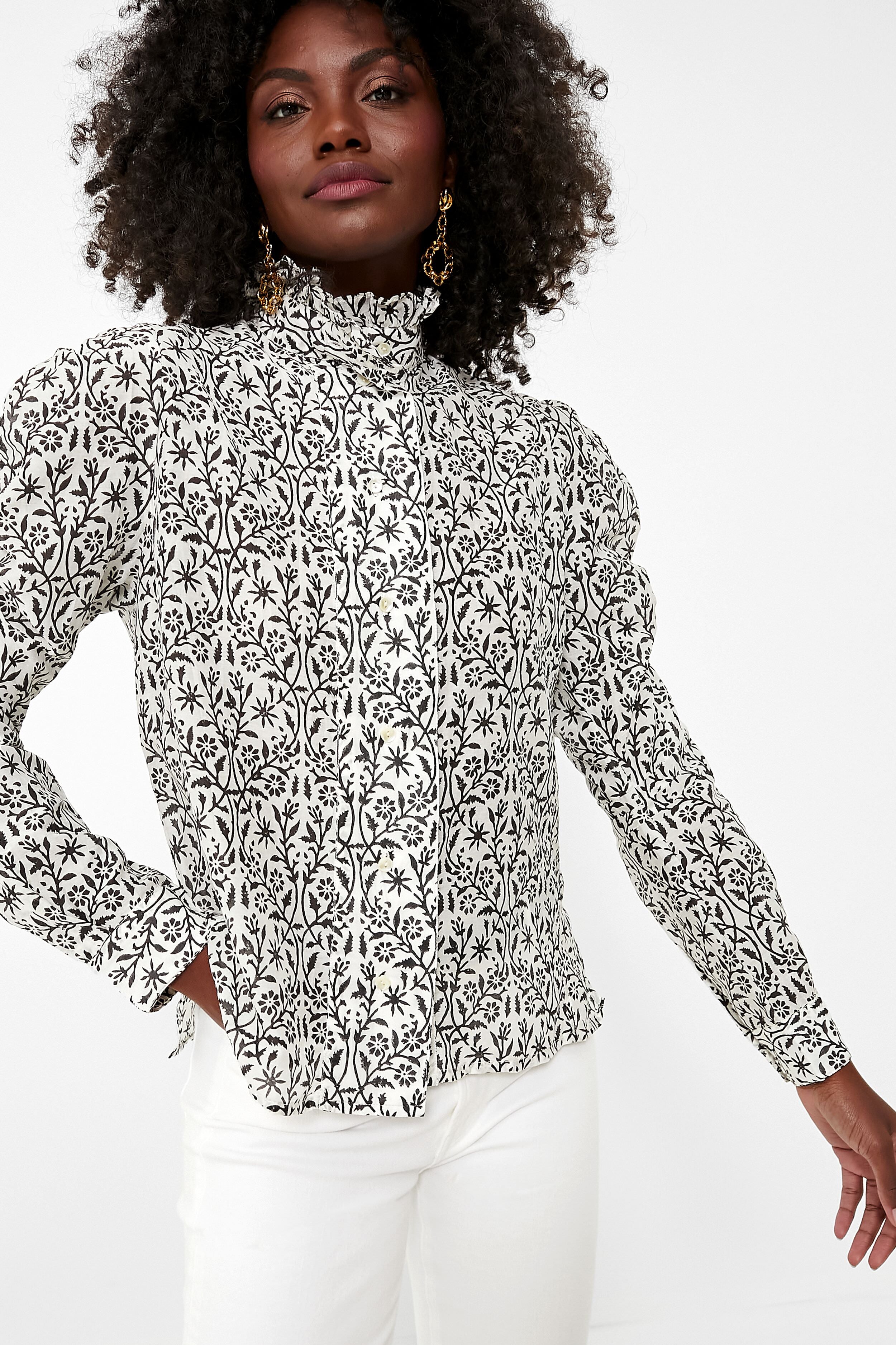 The 18th century-inspired Black Wind Blouse has a beautifully structured silhouette we can't stop thinking about! Featuring a ruffled collar. long gigot sleeves. and a front button placket. this neutral top is a fun twist on the traditional button-down. Made from a crisp cotton poplin. we love the sophisticated drama that the volume in the sleeves adds. Style this piece with high waisted trousers. pumps. and statement earrings for a desk to drinks look. or dress it up with a mini skirt and glitzy clutch for date night.