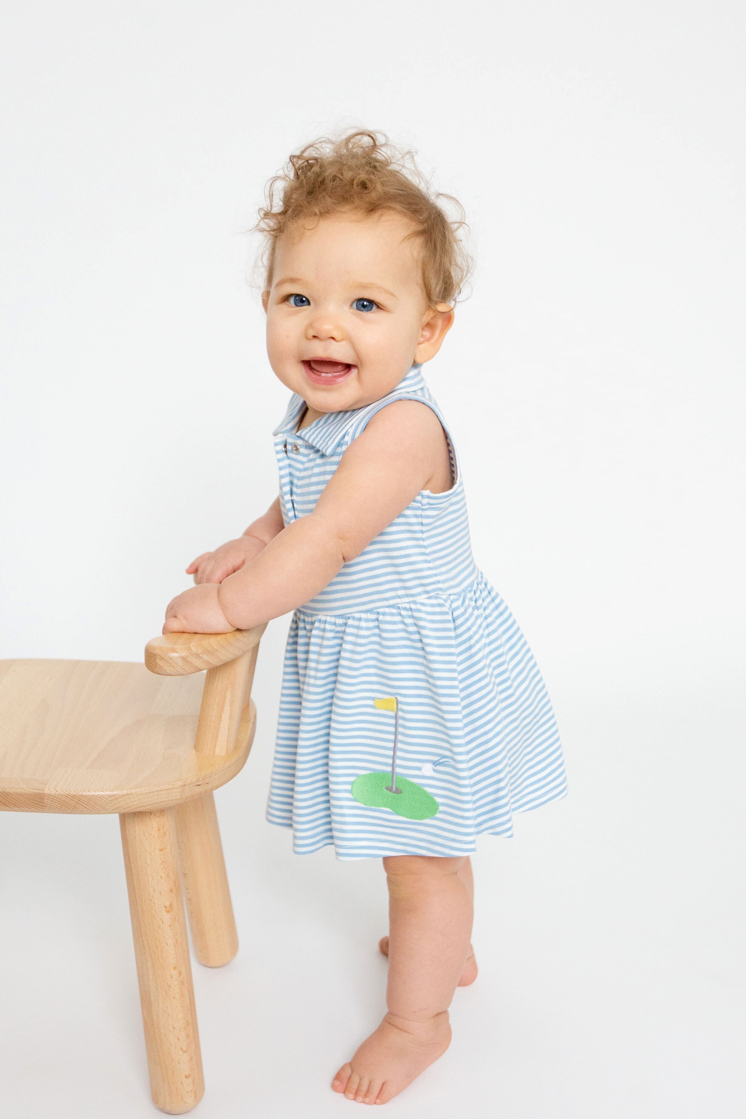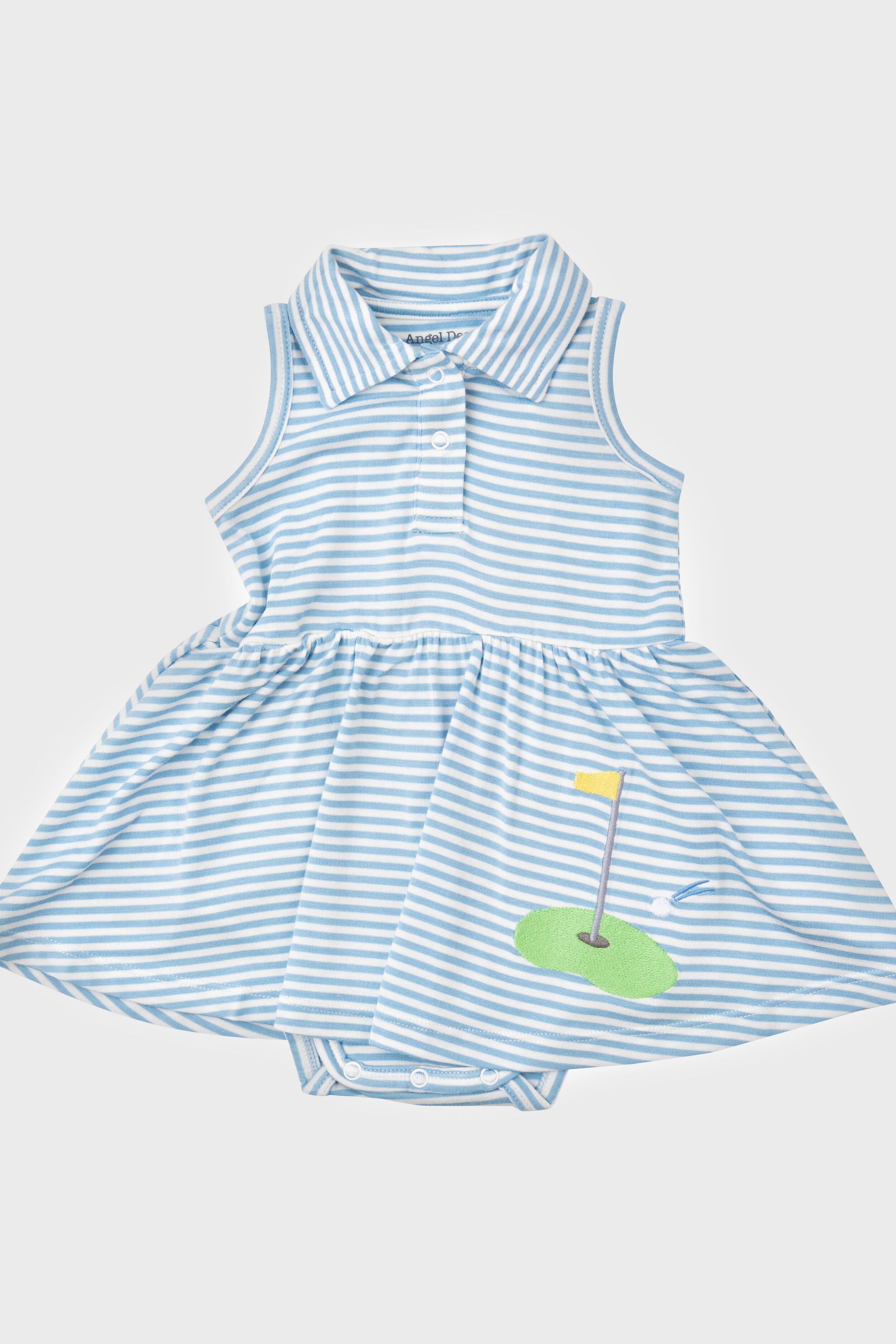 Unleash your little one's inner golfer with our Blue Stripe Golf Tank Bodysuit Dress. Crafted from soft. lightweight fabric that feels gentle against delicate skin. this adorable sleeveless style features a collared neckline. and an embroidered golf decal on the front adding a touch of fun to the outfit. The bottom ensures full coverage and easy diaper changes with convenient snap closures. Perfect for little golf enthusiasts or a day on the green with mommy or daddy!