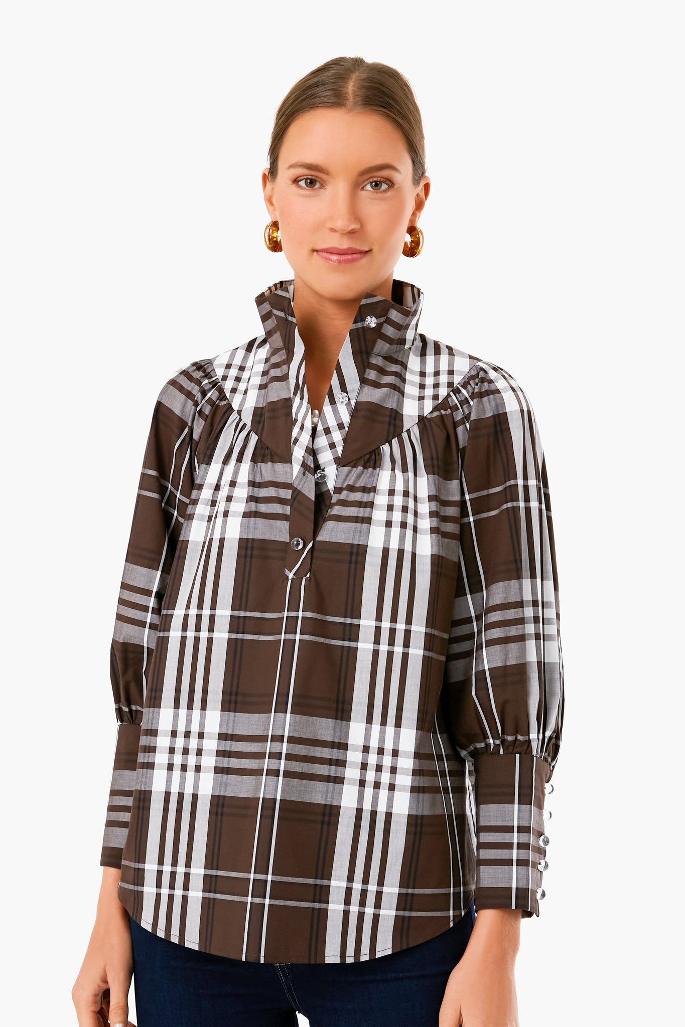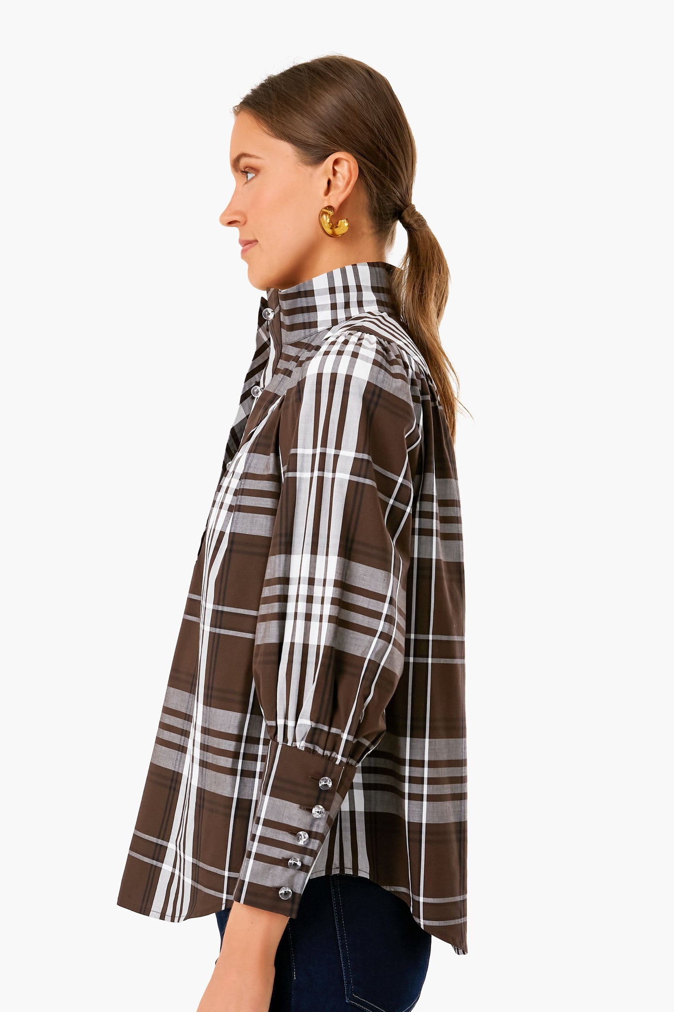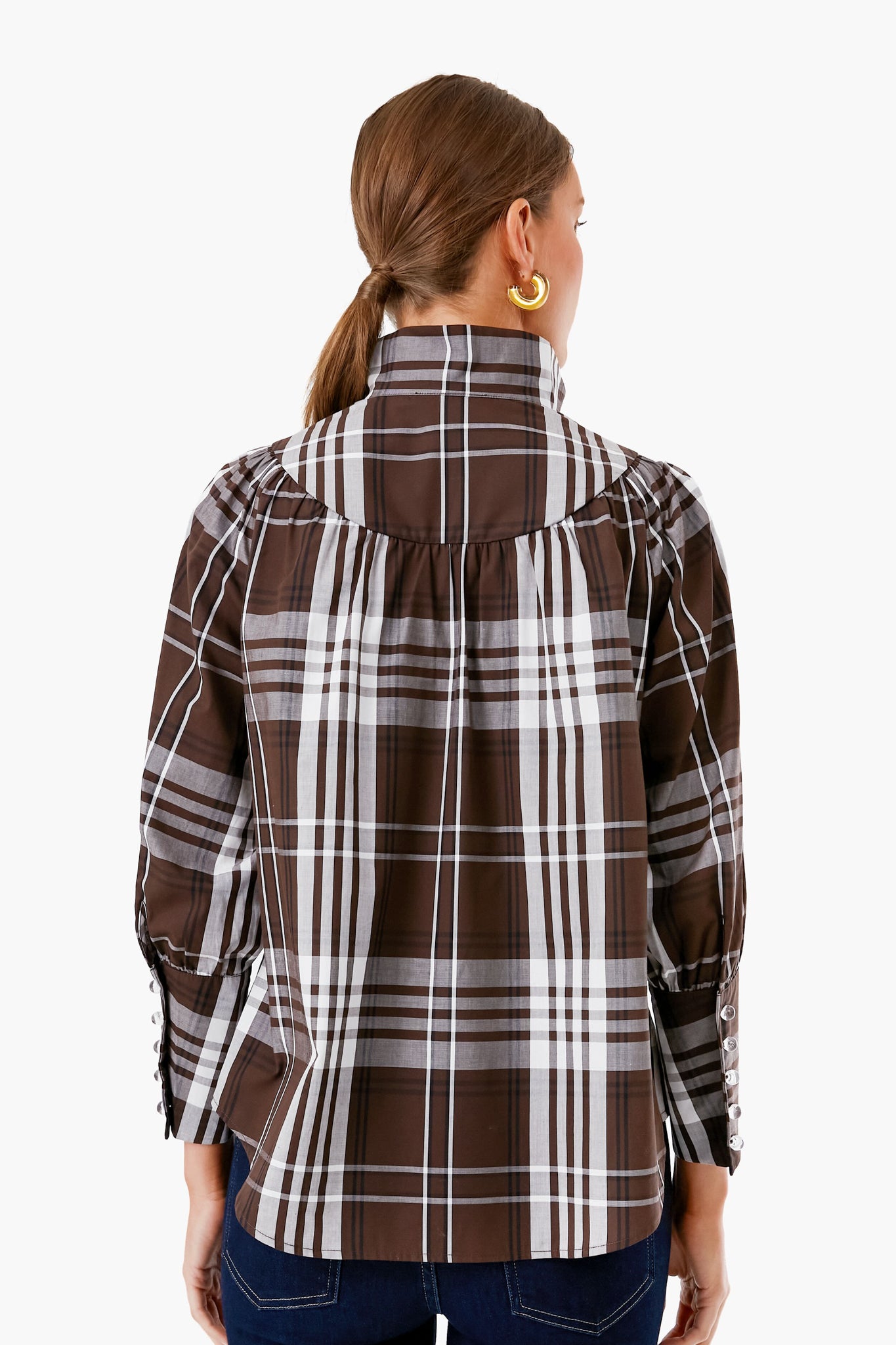 The Cedar Check Corrigan Blouse is decorated in a coffee-hued plaid pattern for the perfect fall to winter transition color palette. This updated classic features a stand collar with a three-quarter length button front placket and long cuffed sleeves for a chic. modern look. We love wearing this for an easy desk to drinks look. swapping from flats to heels and adding gold accessories for a dash of subtle glam.