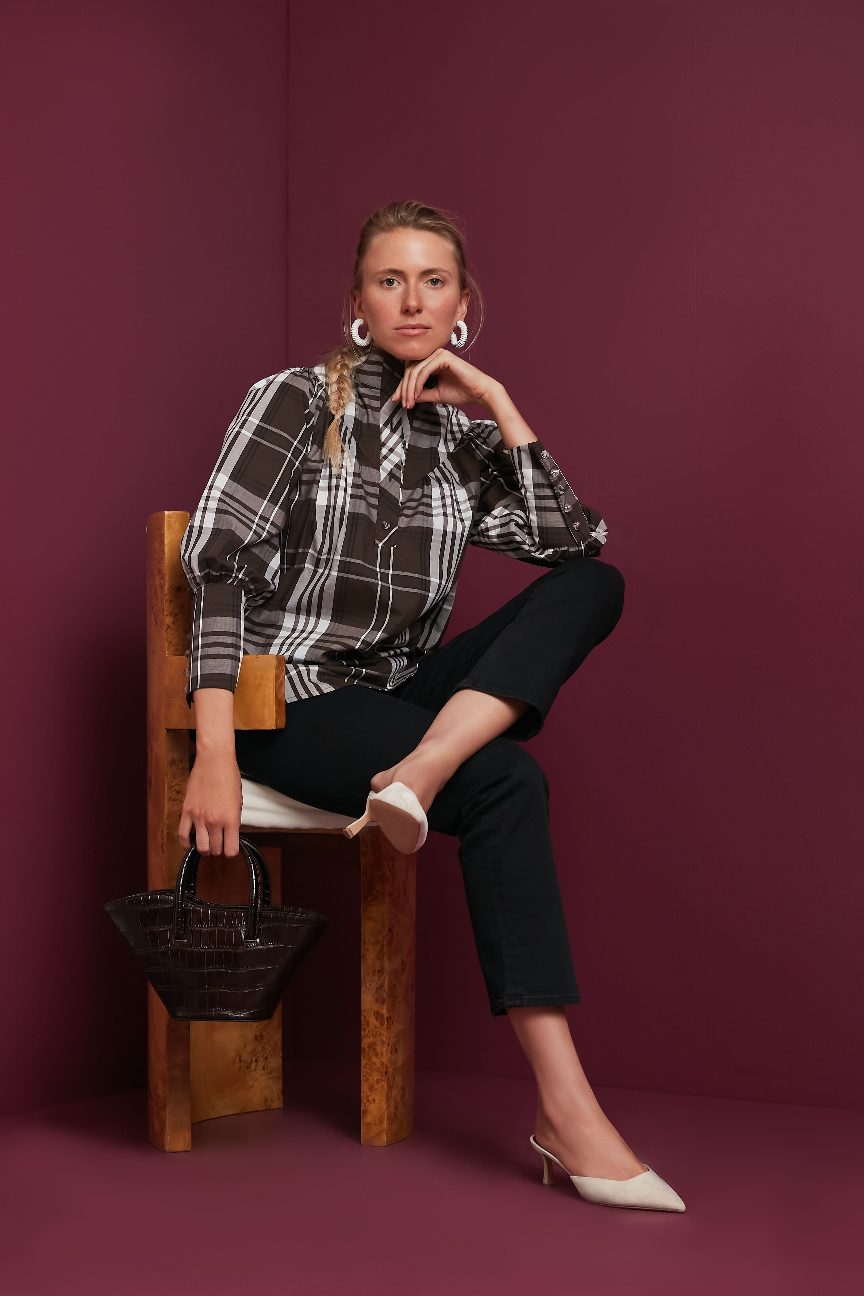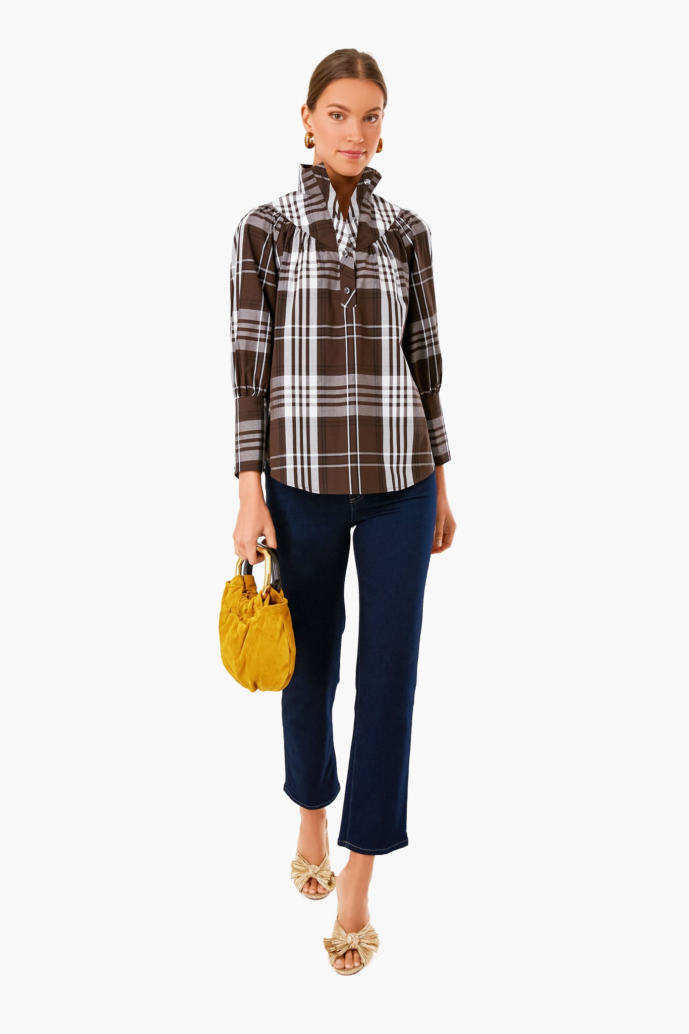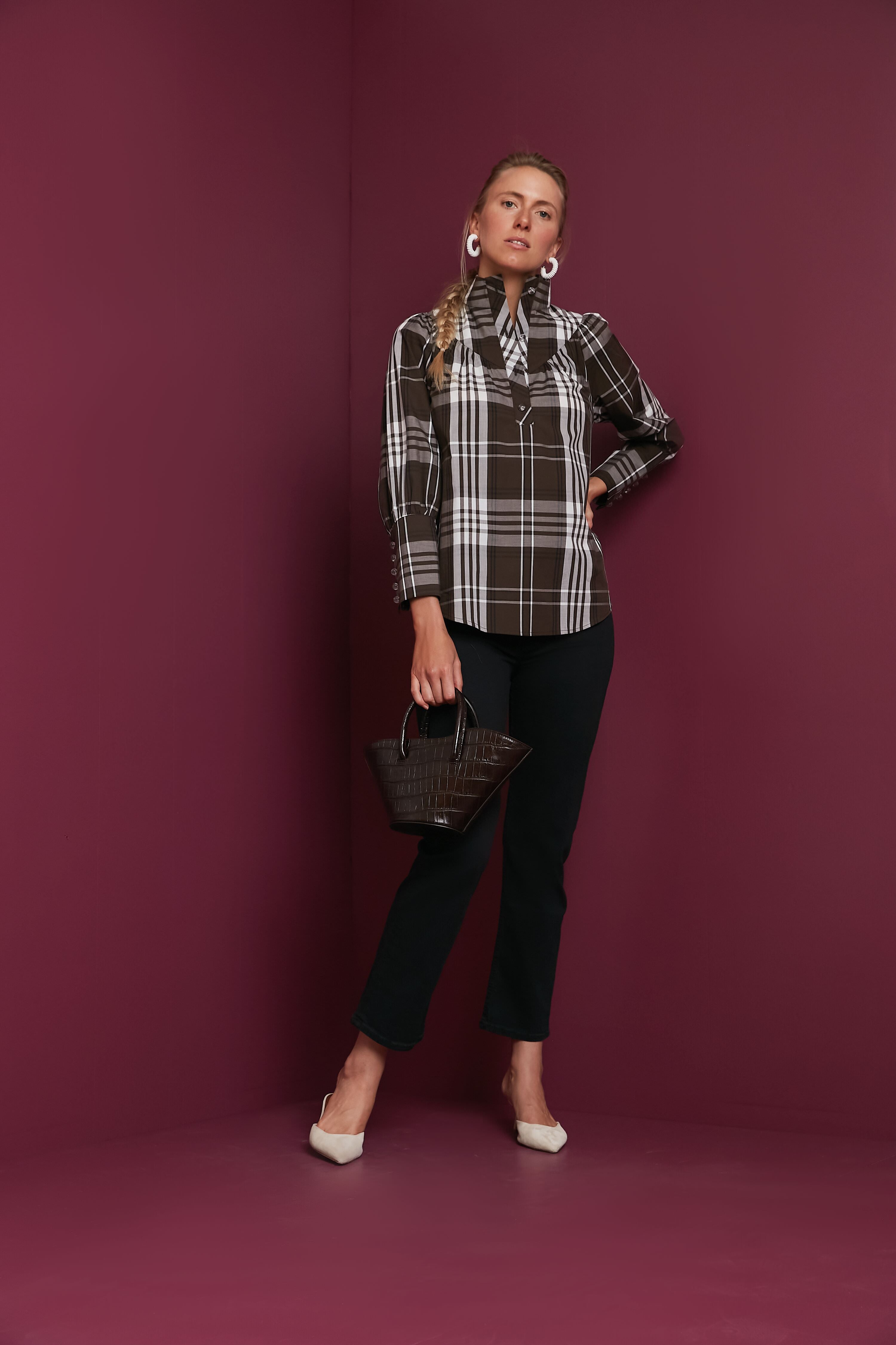 The Cedar Check Corrigan Blouse is decorated in a coffee-hued plaid pattern for the perfect fall to winter transition color palette. This updated classic features a stand collar with a three-quarter length button front placket and long cuffed sleeves for a chic. modern look. We love wearing this for an easy desk to drinks look. swapping from flats to heels and adding gold accessories for a dash of subtle glam.