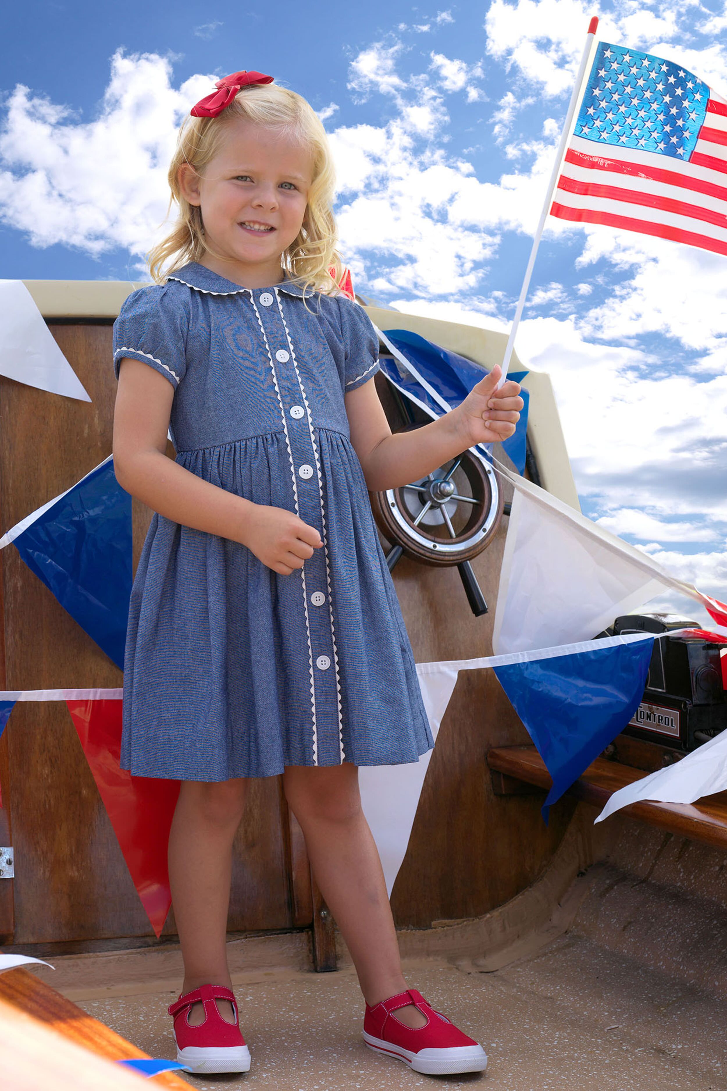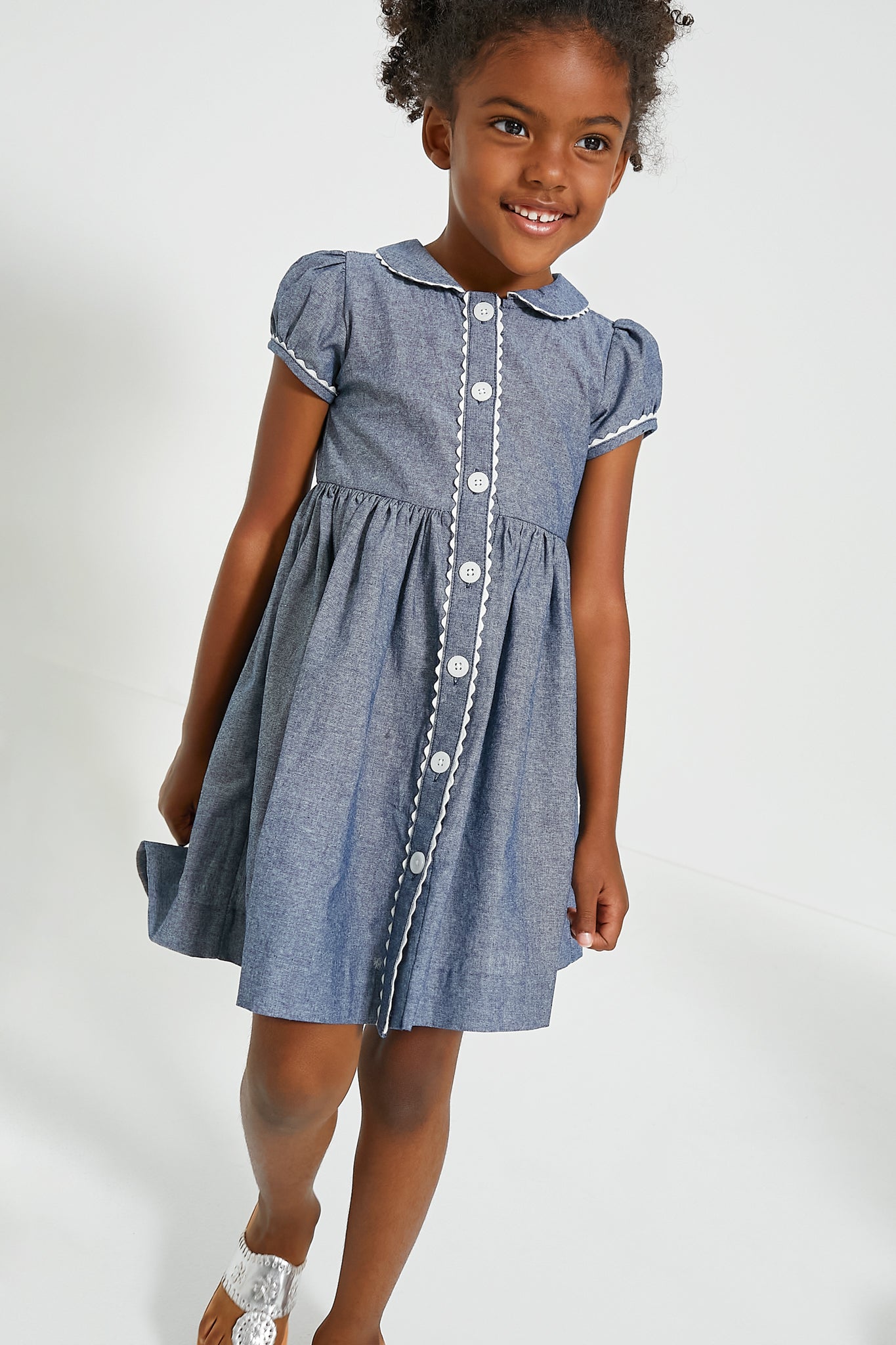The Chambray Button-Front Dress is going to be your little fashionista's favorite! Perfect for spring. summer. and can be worn into fall with tights and a cardigan. this puff sleeve number boasts a peter pan collar. button front placket. gathered skirt and is finished with contrasting ivory trimming and buttons for a timeless look. Perfect for family get-togethers and after school activities. your kiddo will look and feel their best in this mini!