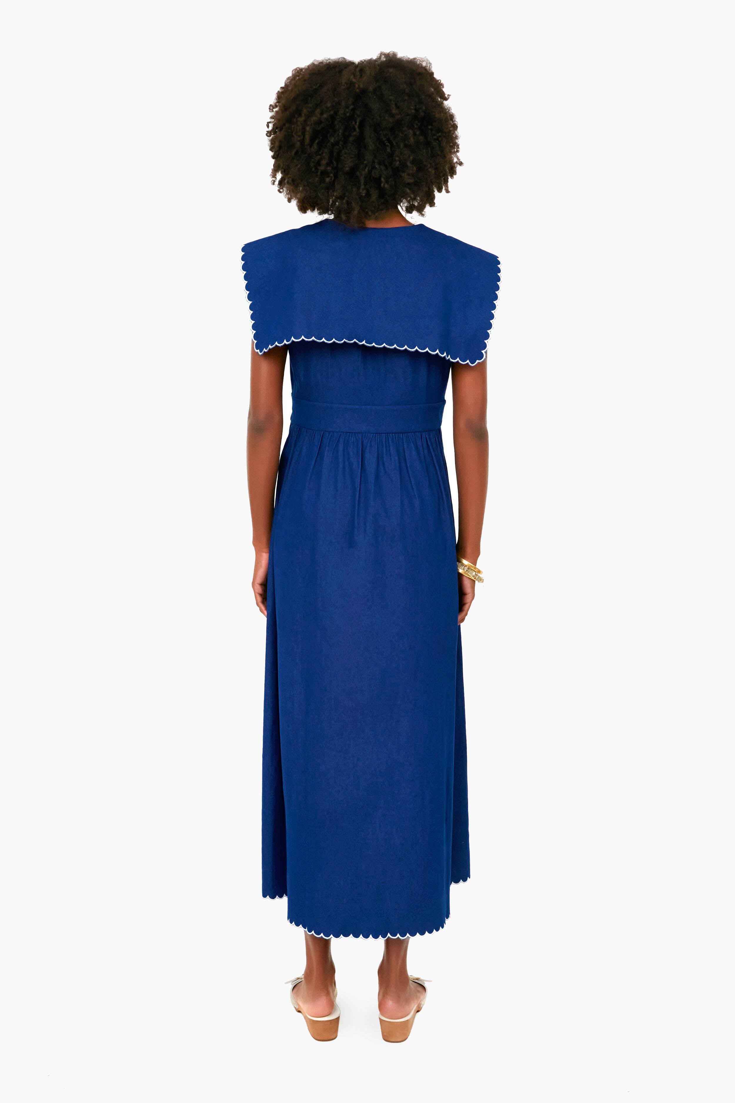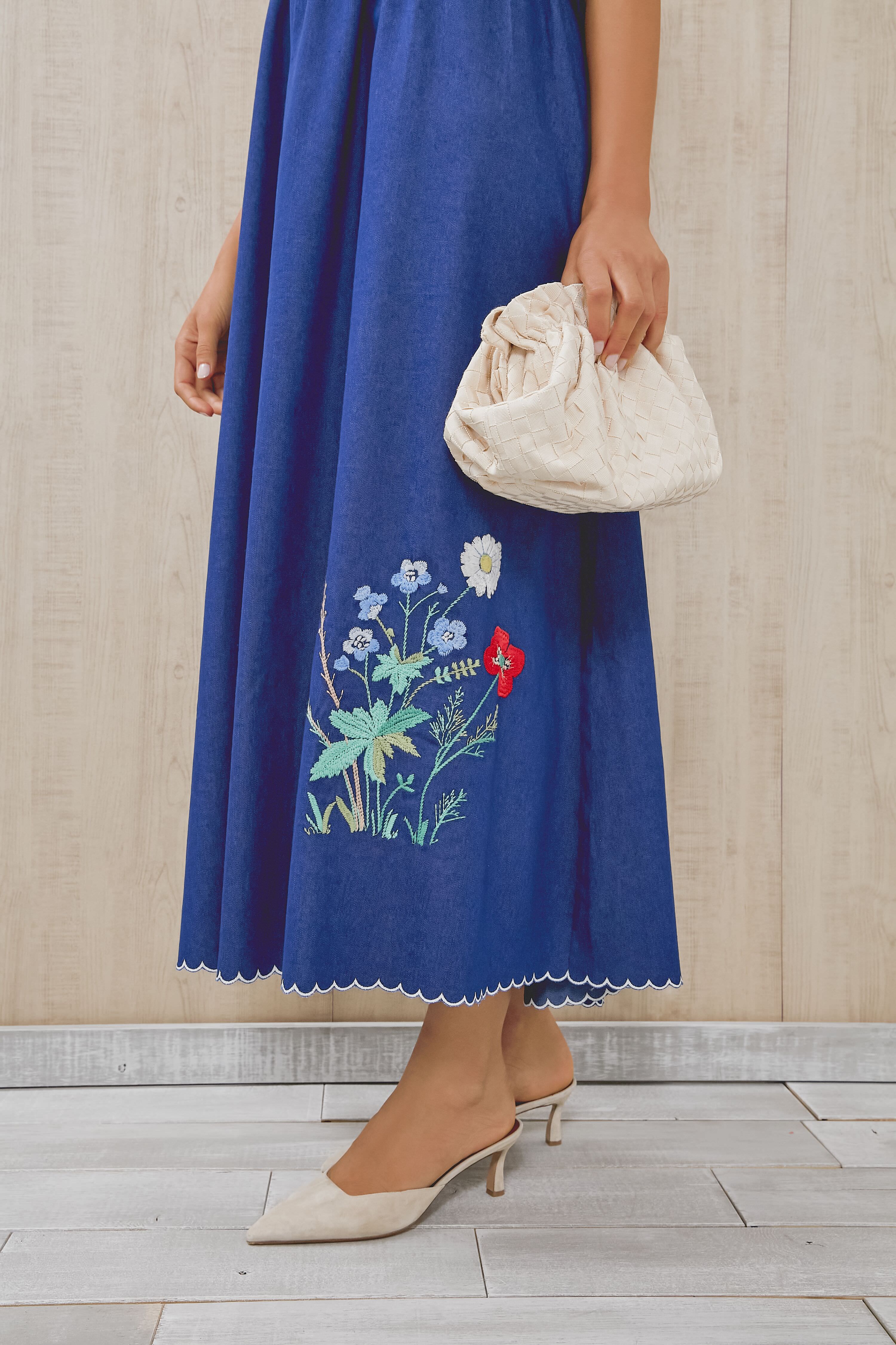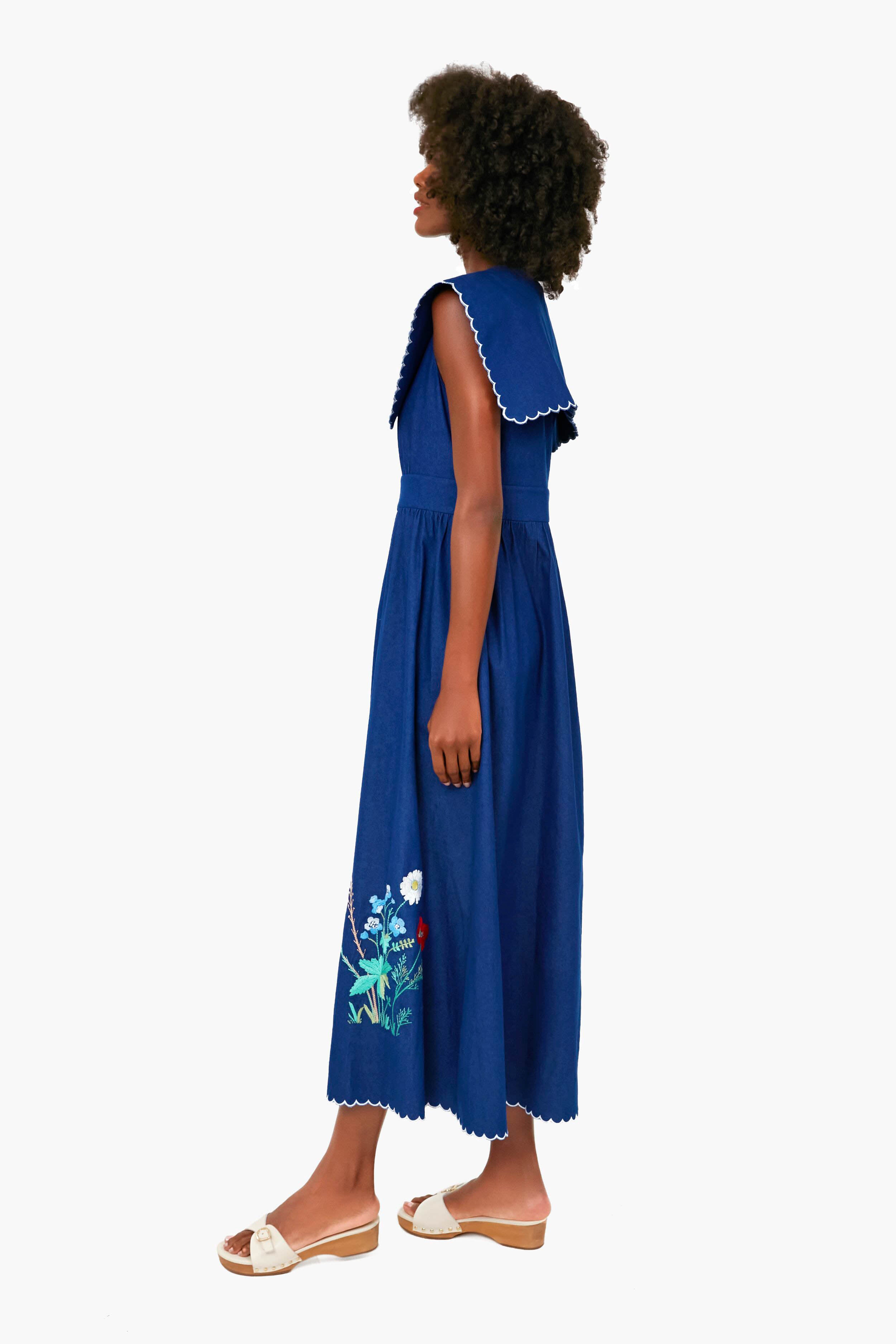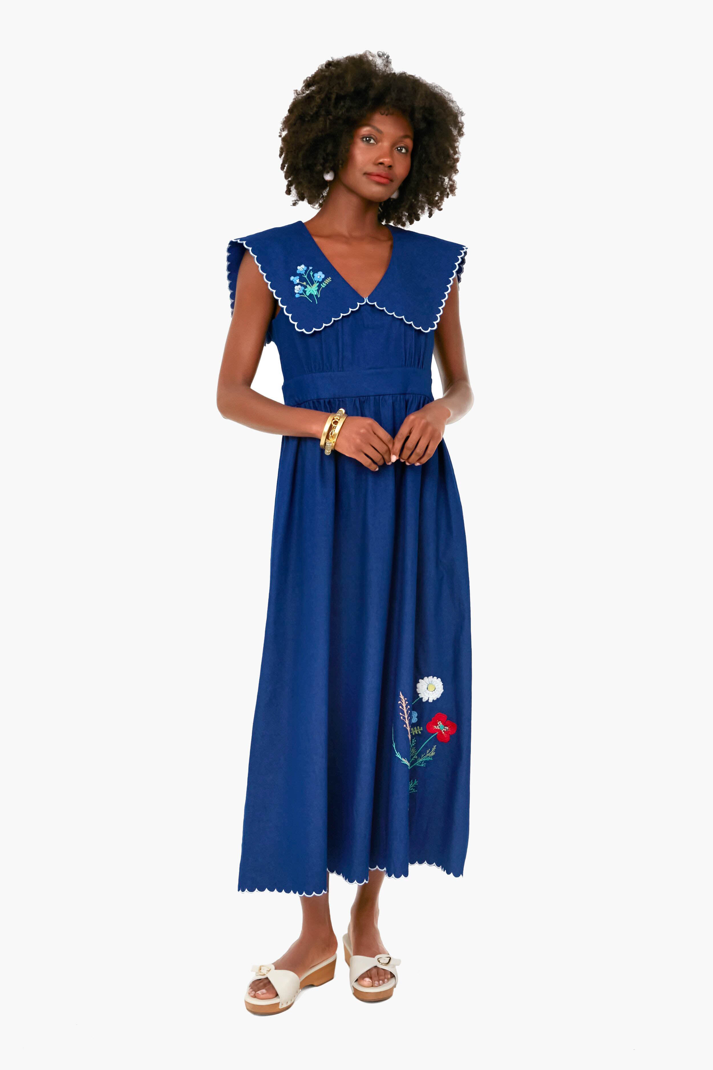Think blue skies and wide open spaces. the Davis Dress draws inspiration from fields of flowers and adds a dash of romance with its colorful embroidery and chambray fabric. This effortless. refined maxi is the perfect pick for spring dressing with its carefree silhouette and special details like the oversized collar and scallop trim. Style with easy sandals and a tote for an ideal warm weather look and throw a cardigan over your shoulders when the temps drop for those cooler days.