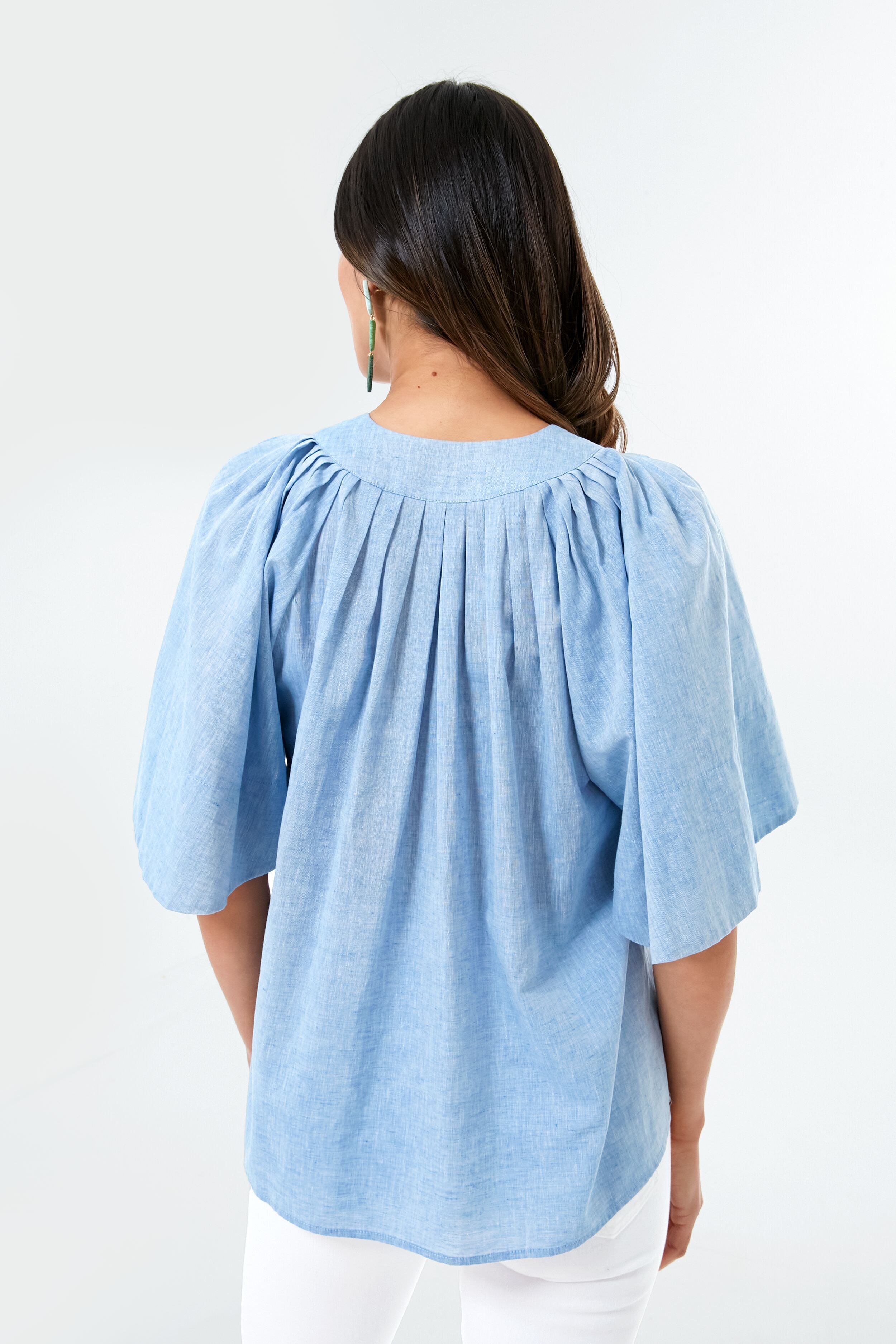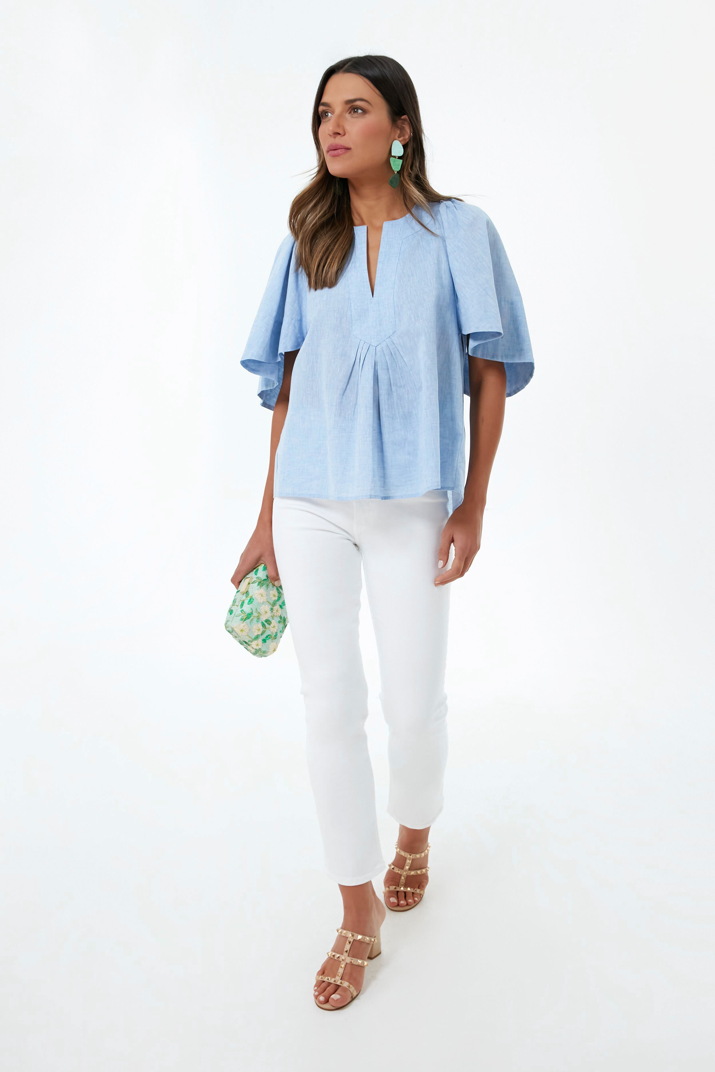 The Finley Flutter Sleeve Top is an effortlessly chic style staple. In a fresh chambray hue. this blouse has a flattering silhouette. oversized flutter sleeves. and a V-neckline that can be dressed up or down with a quick change of accessories. Pair with gold jewelry for everything from work to brunch this season.