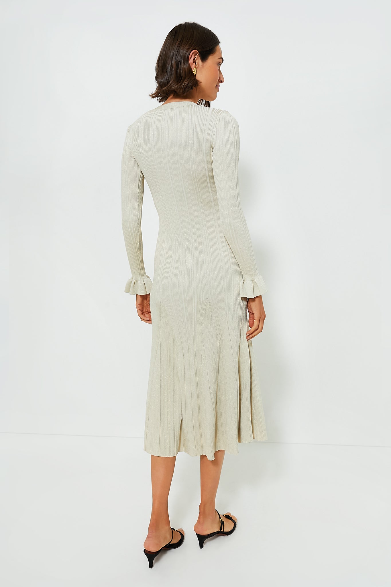 Cut from a cream metallic ribbed knit for a sculpted fit. this dress was made to flatter. Flirty ruffle cuffs adorn the long sleeves whilst a flared hem gives the midi skirt dynamic movement. Pair the Cream Metallic Ribbed Midi Dress with nude heels or sandals for a chic date night or dinner time look.