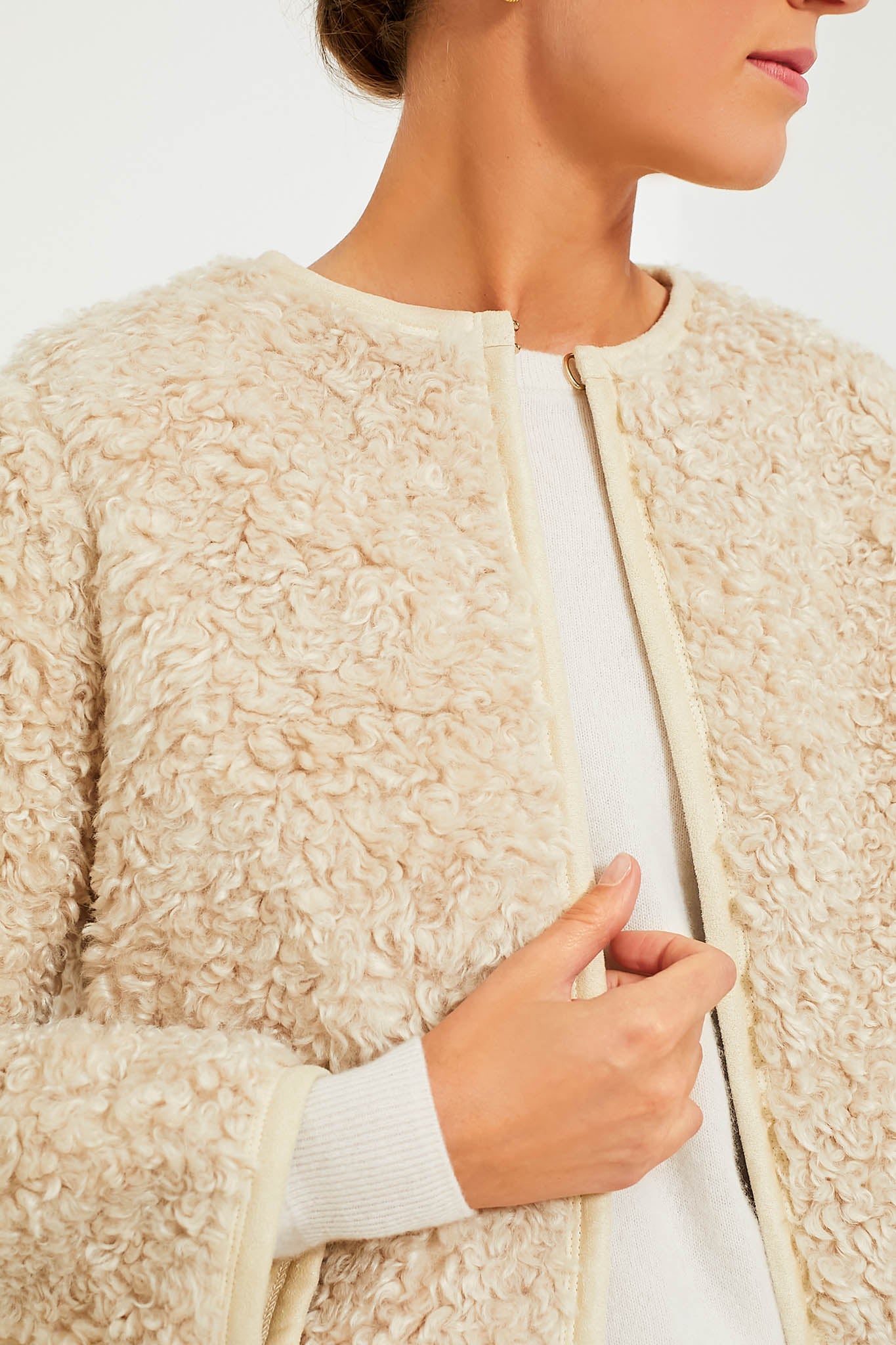 Crafted from a fuzzy. furry sherpa with a bit more weight and luxuriously lined that feels like suede. this Cameron Jacket promises to keep you warm and stylish from brunch to dinner and everything in between. With side pockets to stash all your essentials. we love to style it with denim and flats or skirt and heels!