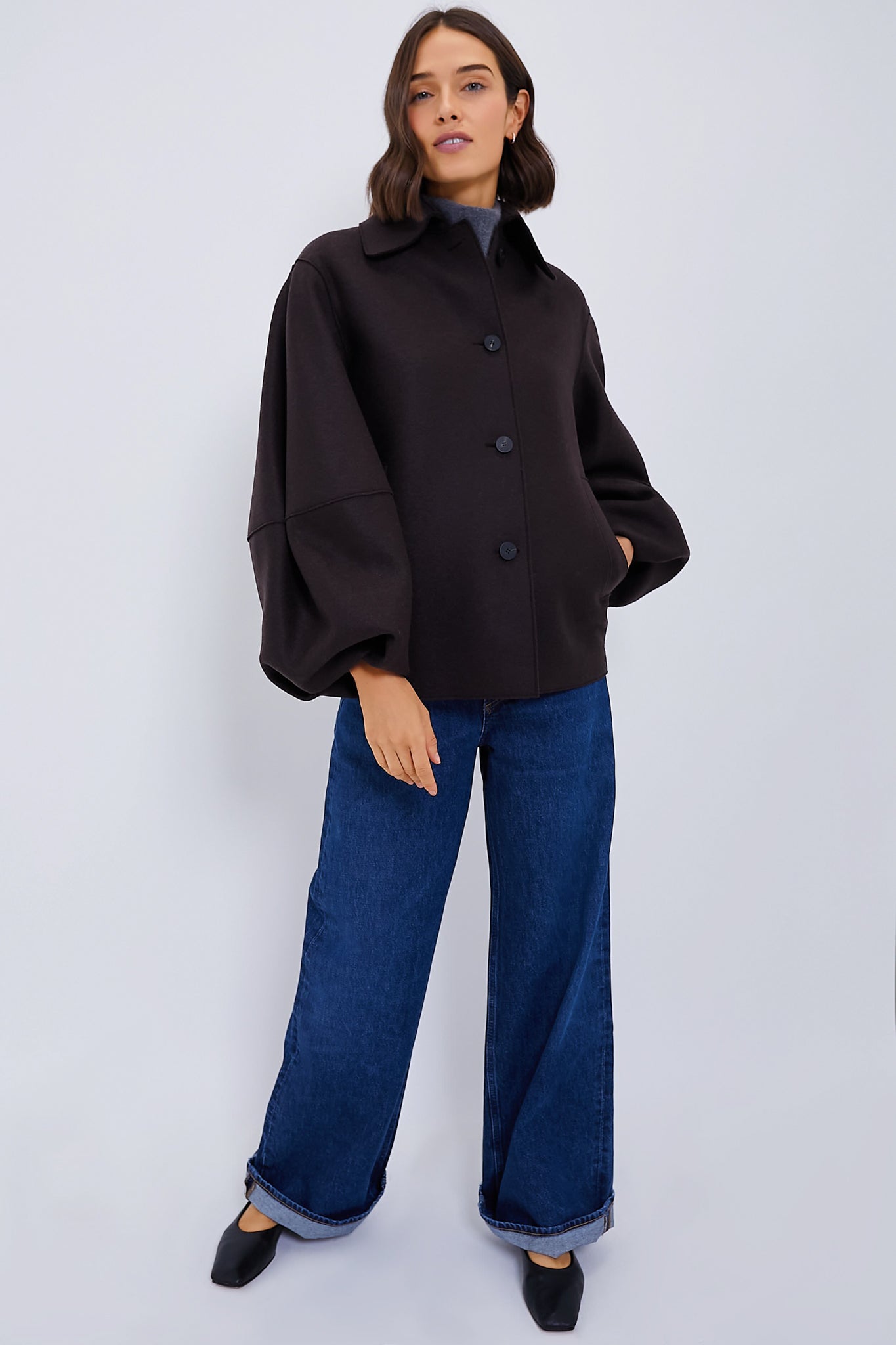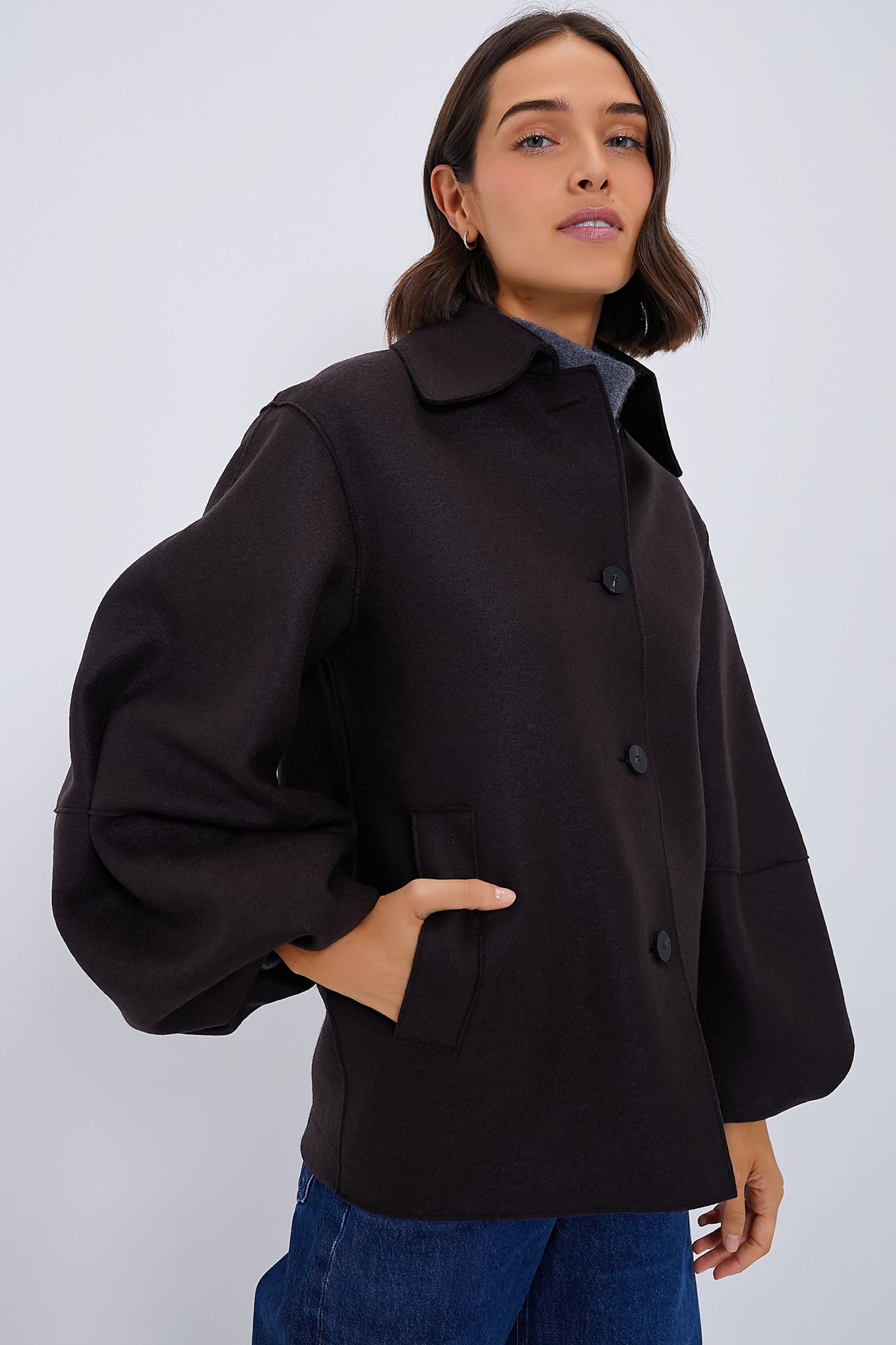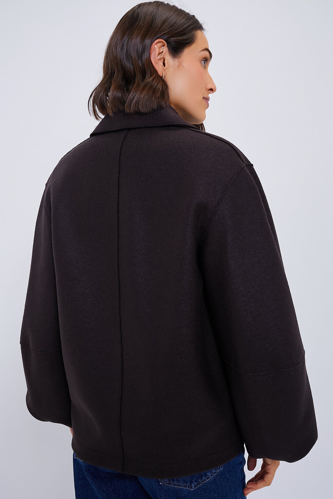 Taking your look up a notch is effortless when you have the Dark Brown Puffed Sleeve Pressed Wool Jacket. This timeless stunner featuring a boxy fit and gorgeous blouson sleeves will keep you stylish and cozy all season. Perfect for wearing everyday with denim and a tote bag. this is sure to become a favorite in your closet.