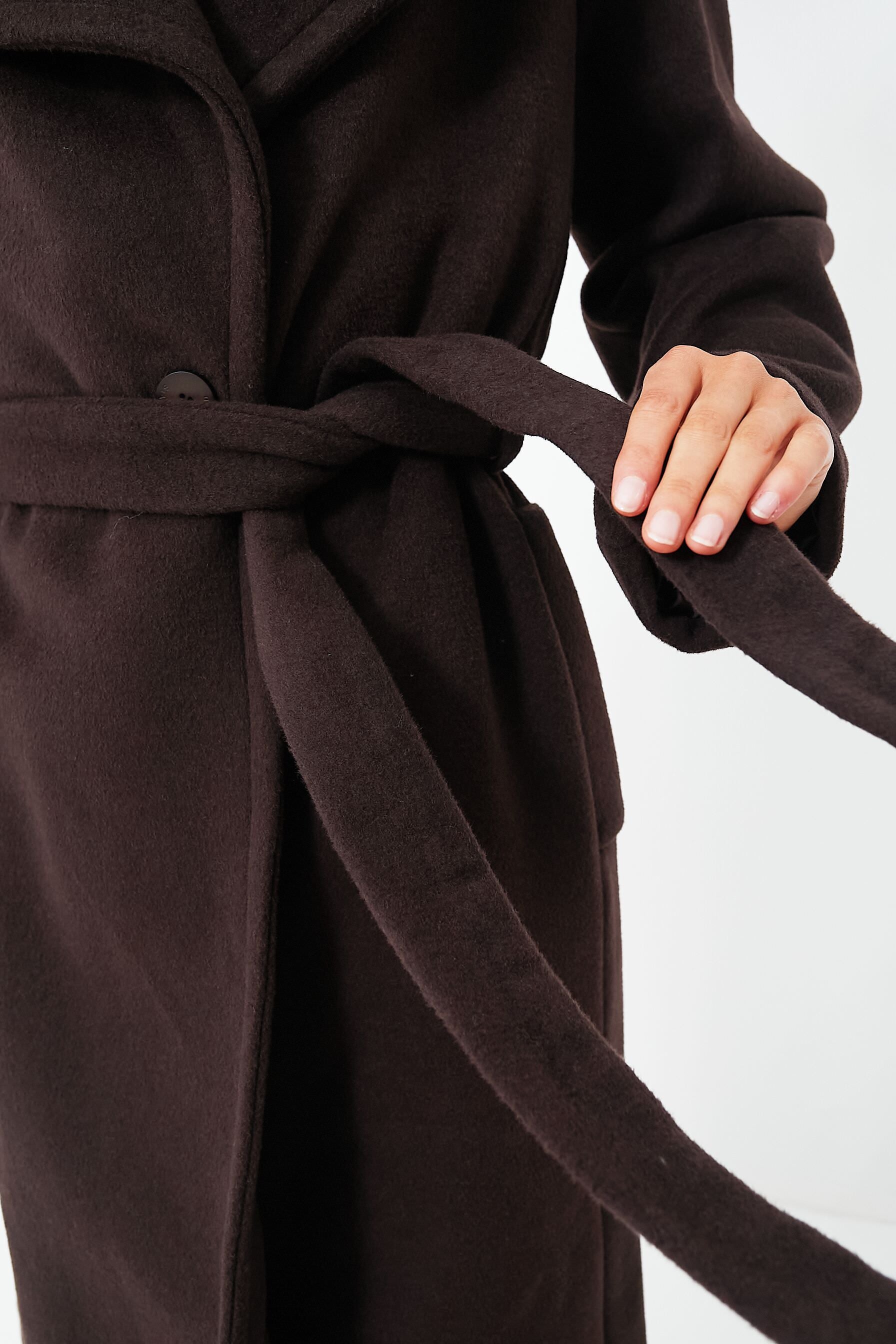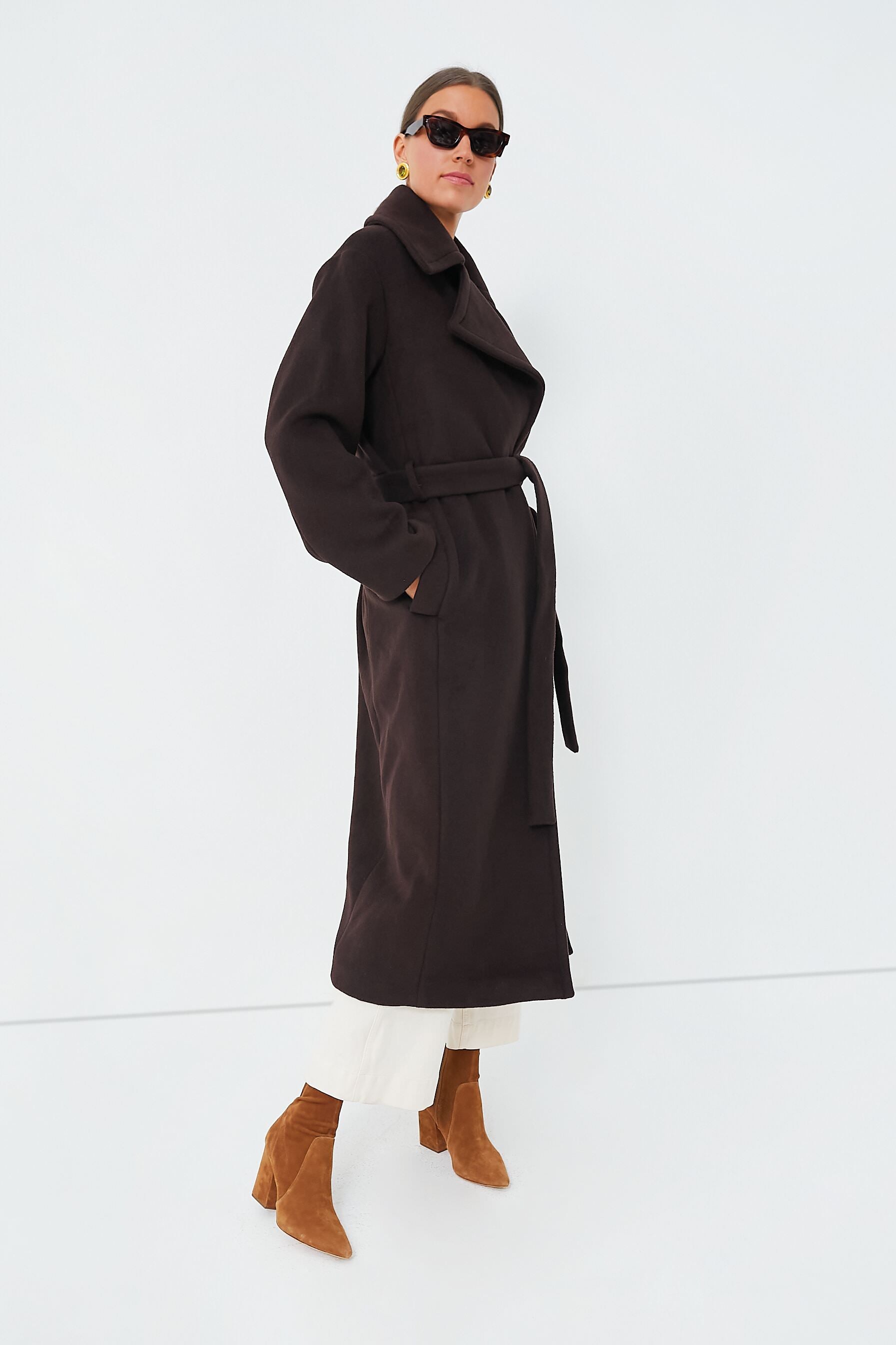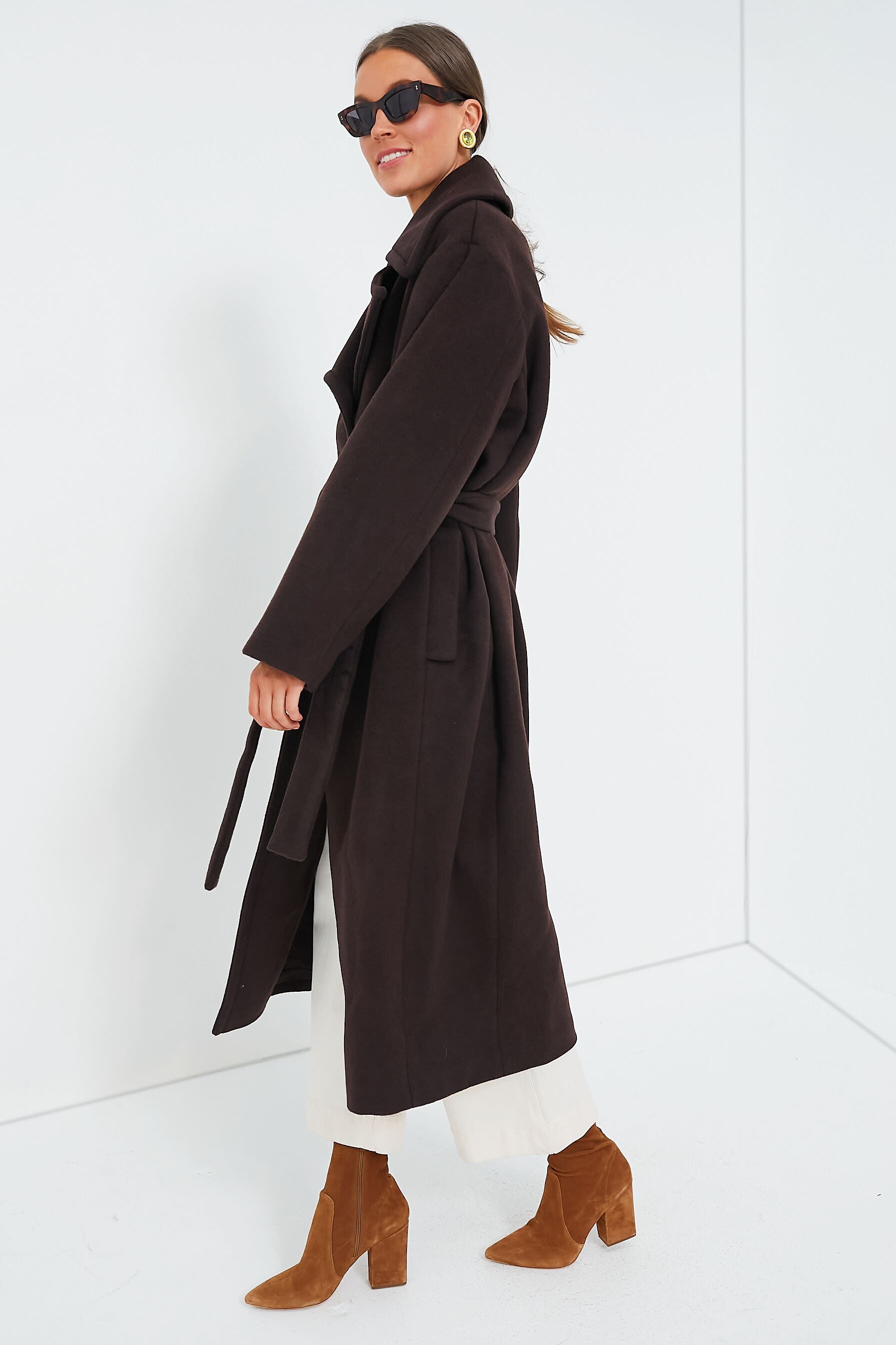 The Dark Chocolate Carver Coat boasts a rich brown hue on a classic silhouette. Featuring notched lapels. a self-tie belt that can be left loose or tied to cinch the waist. and a fabulous detachable oversized wrap scarf that adds an extra touch of elegance. this beauty is the most stylish way to stay warm. Whether you're headed to an event. to run errands. or head into the office. this piece has you covered. We are layering ours over midi dress and boots. or with a crisp button down and denim.