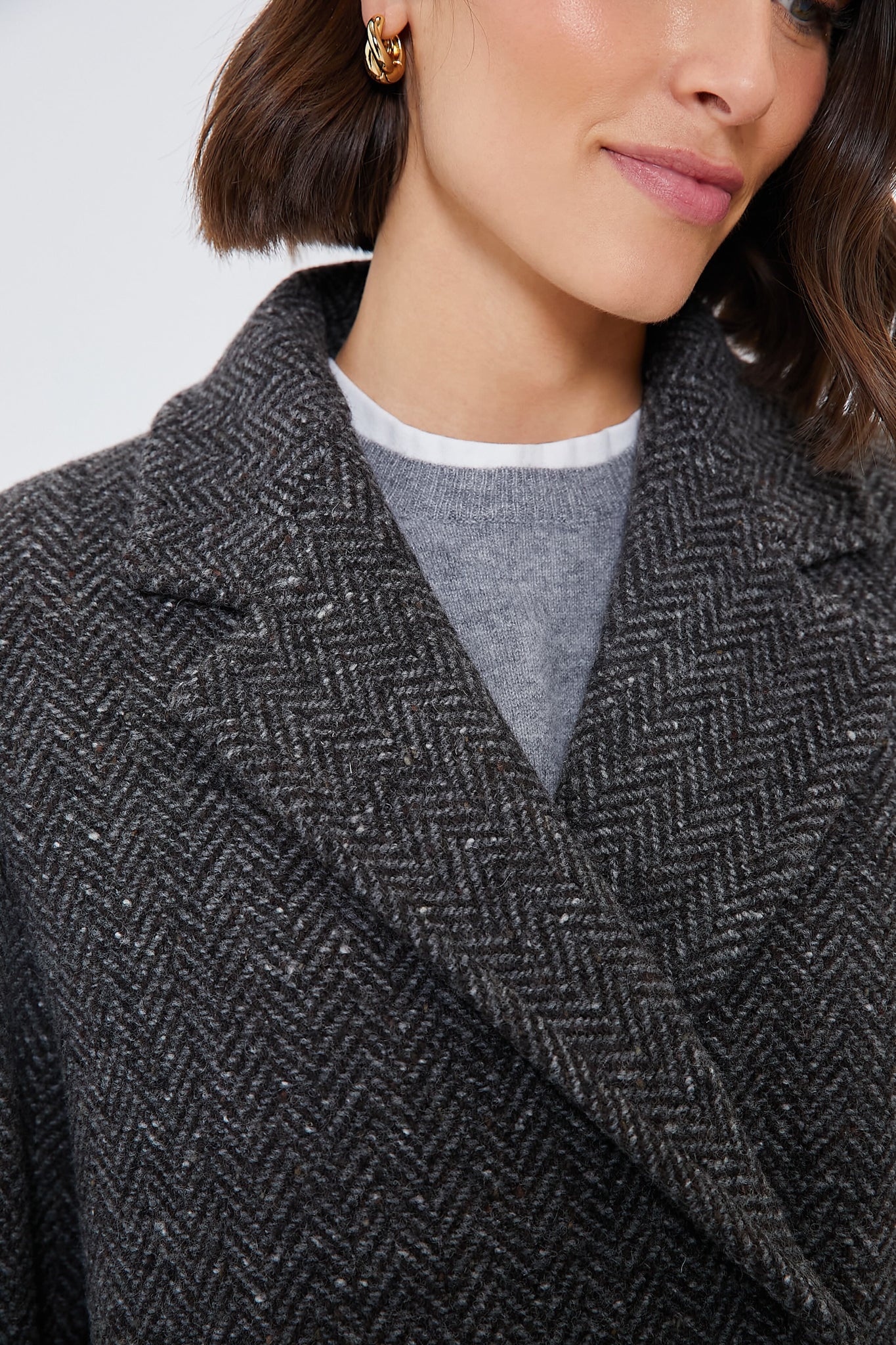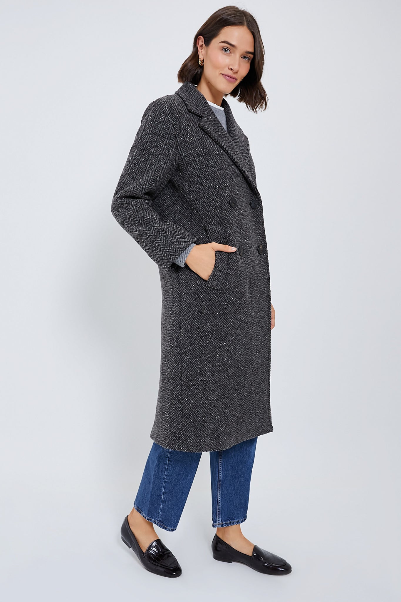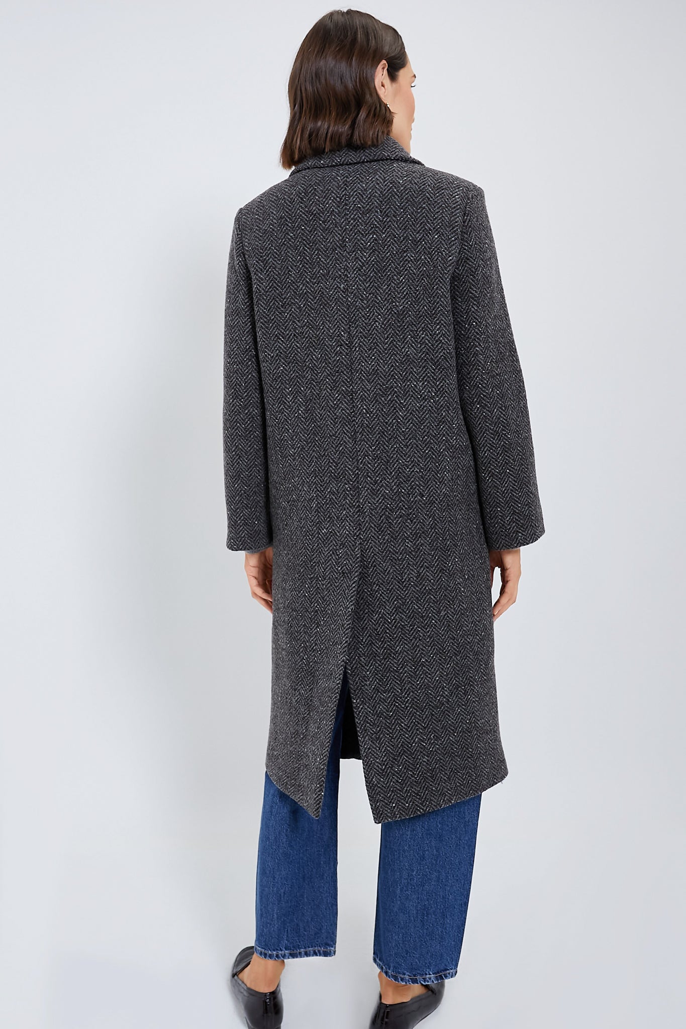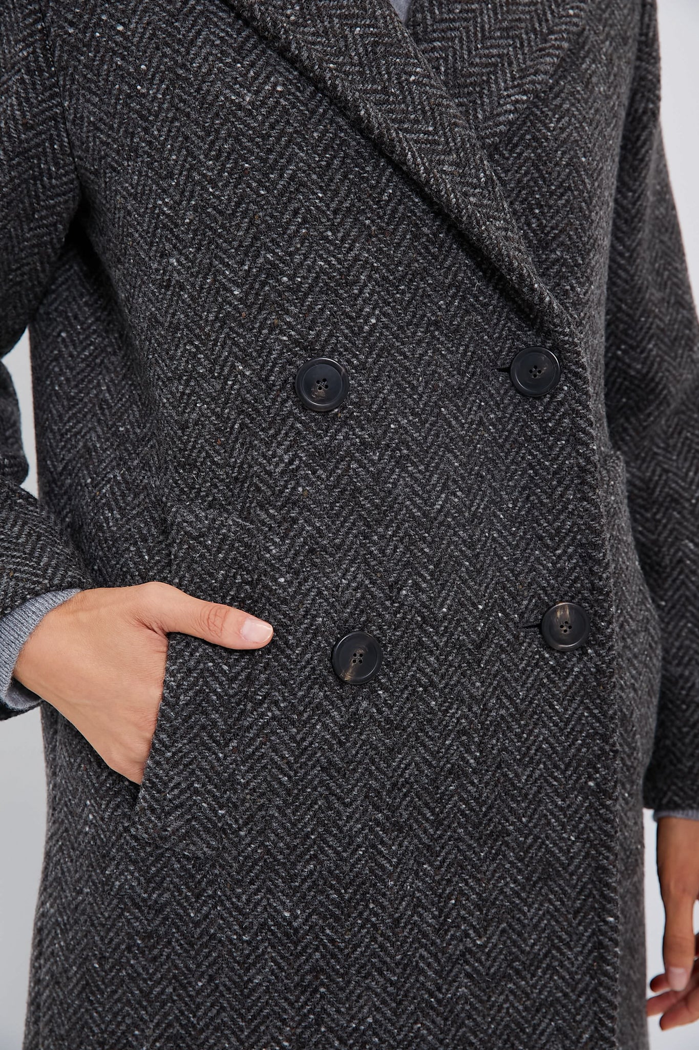 Crafted from fine pure wool tweed fabric. the Dark Grey Corinto Coat boasts a lapel collar. long set-in sleeves and welt side pockets. Offering a cocoon fit. this double-breasted midi has a central rear vent detail - for a look that's equally fashionable as it is functional. Style with go-to denim and sleek boots for an effortlessly chic outfit formula.