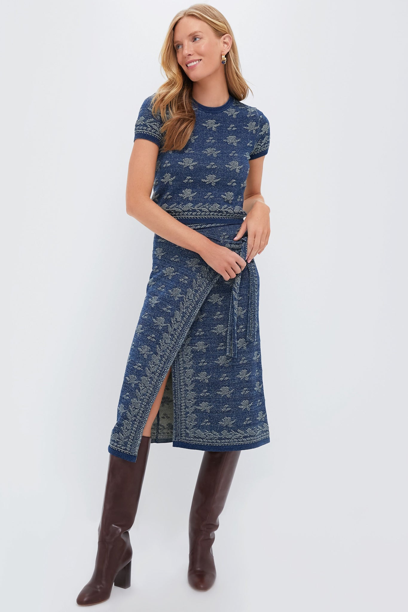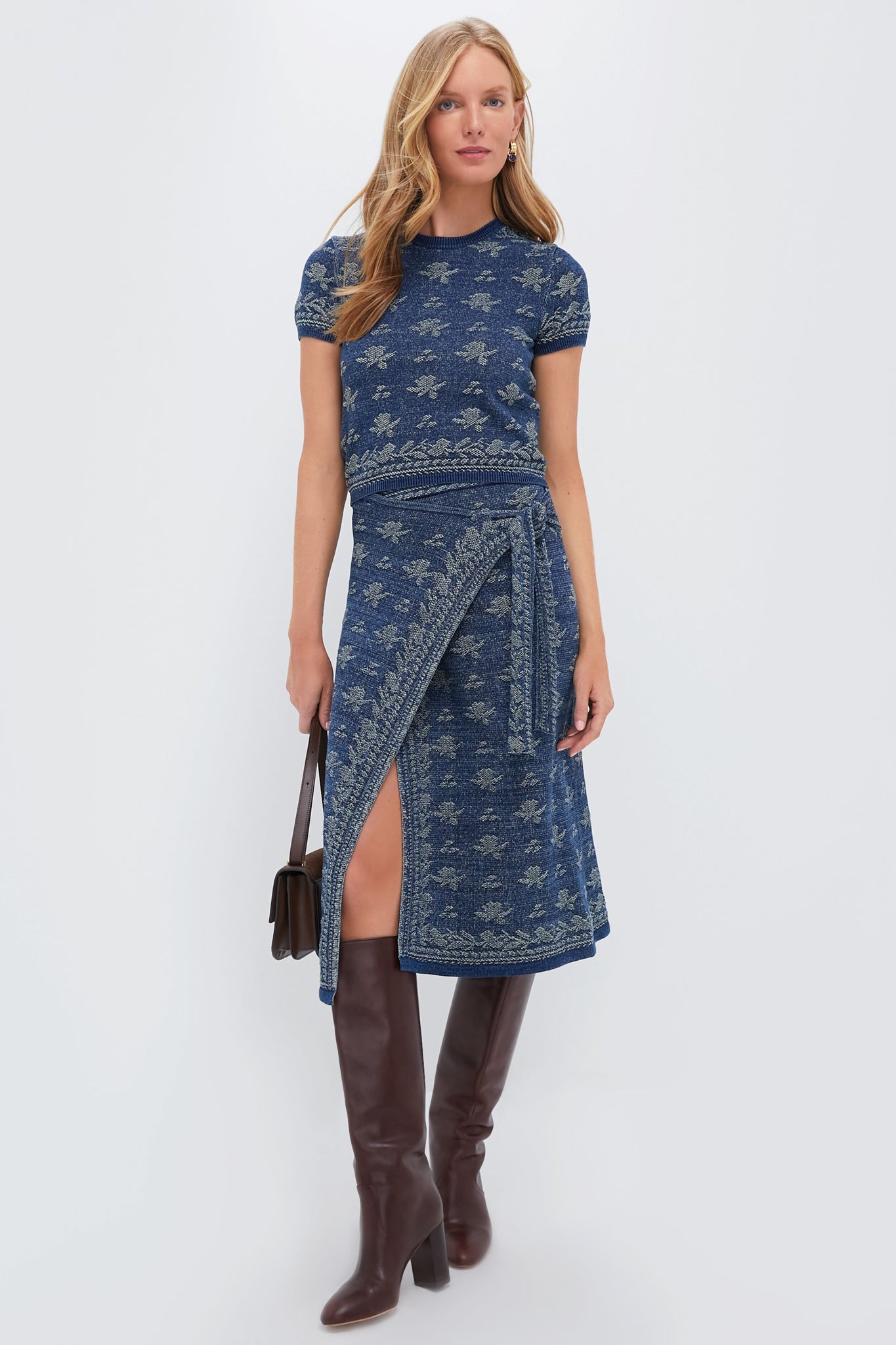 Elevate your wardrobe with the Dark Indigo Pullover. featuring a subtle yet striking printed design. Knit with cotton and dyed with true indigo for a rich saturation of color. pair it with a matching Dark Indigo Printed Wrap A-Line Skirt r and boots to channel bohemian sophistication.