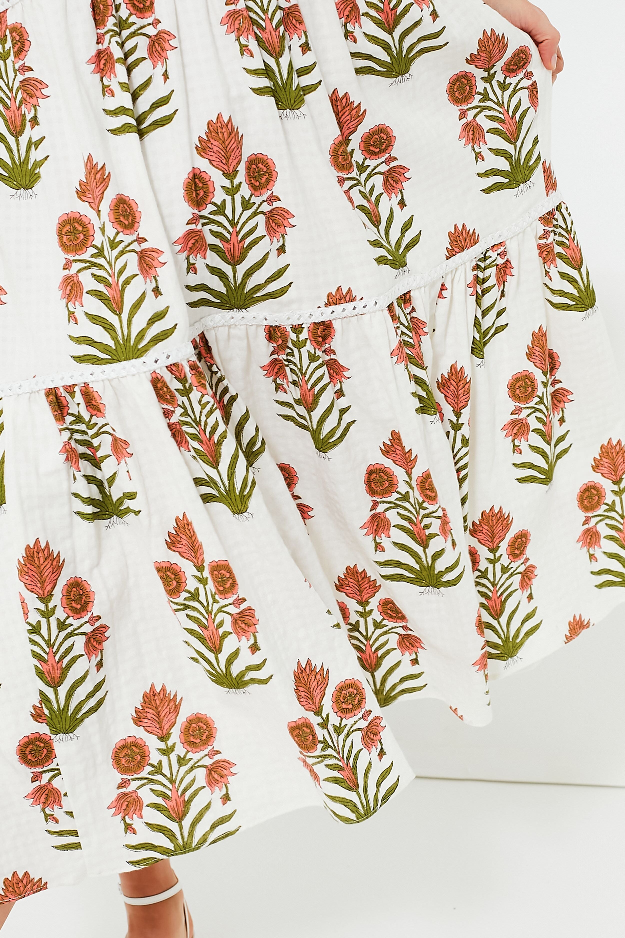 Botanical delights. this Desert Coral Sallyann Dress will put you on spring time (no garden needed). Cut from lightweight cotton and block printed with a gorgeous poppy field floral motif. this maxi features v-neckline. ruched bodice with flutter sleeves. and tiered skirt that adds adorable appeal to this breezy number. Style with wedges and a clutch for an al fresco dinner party. or with flat sandals and a tote for a ladies luncheon.
