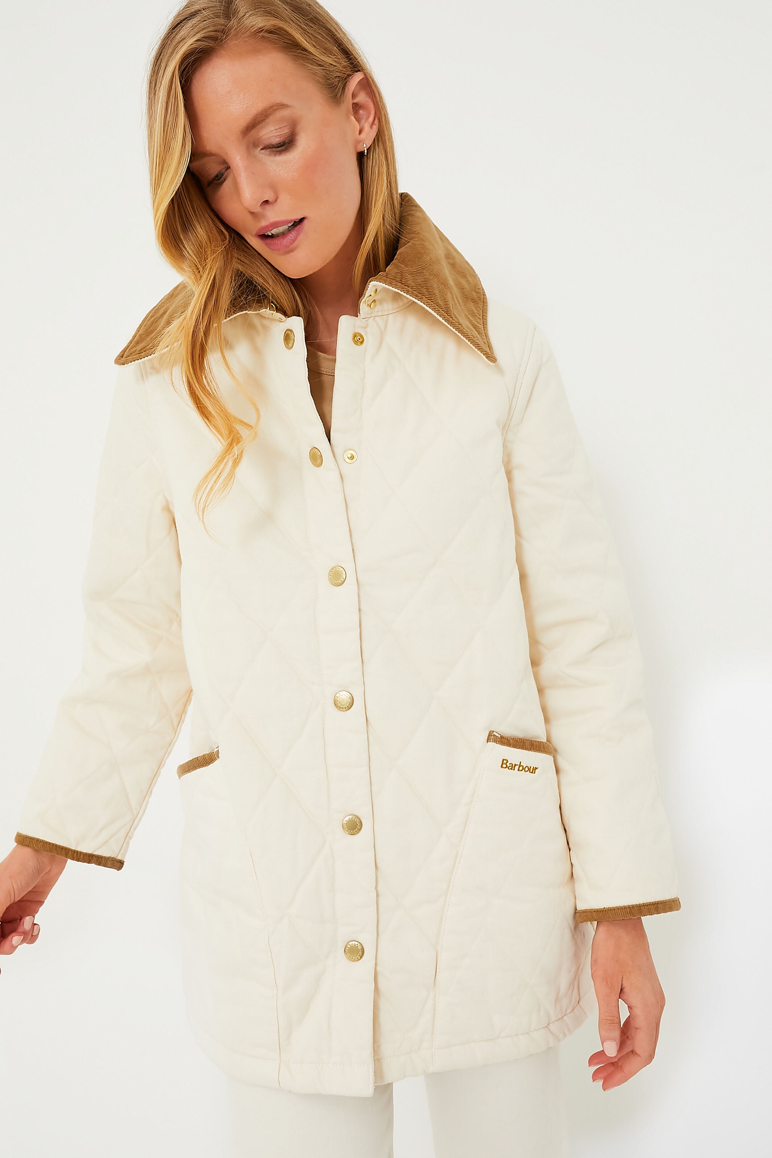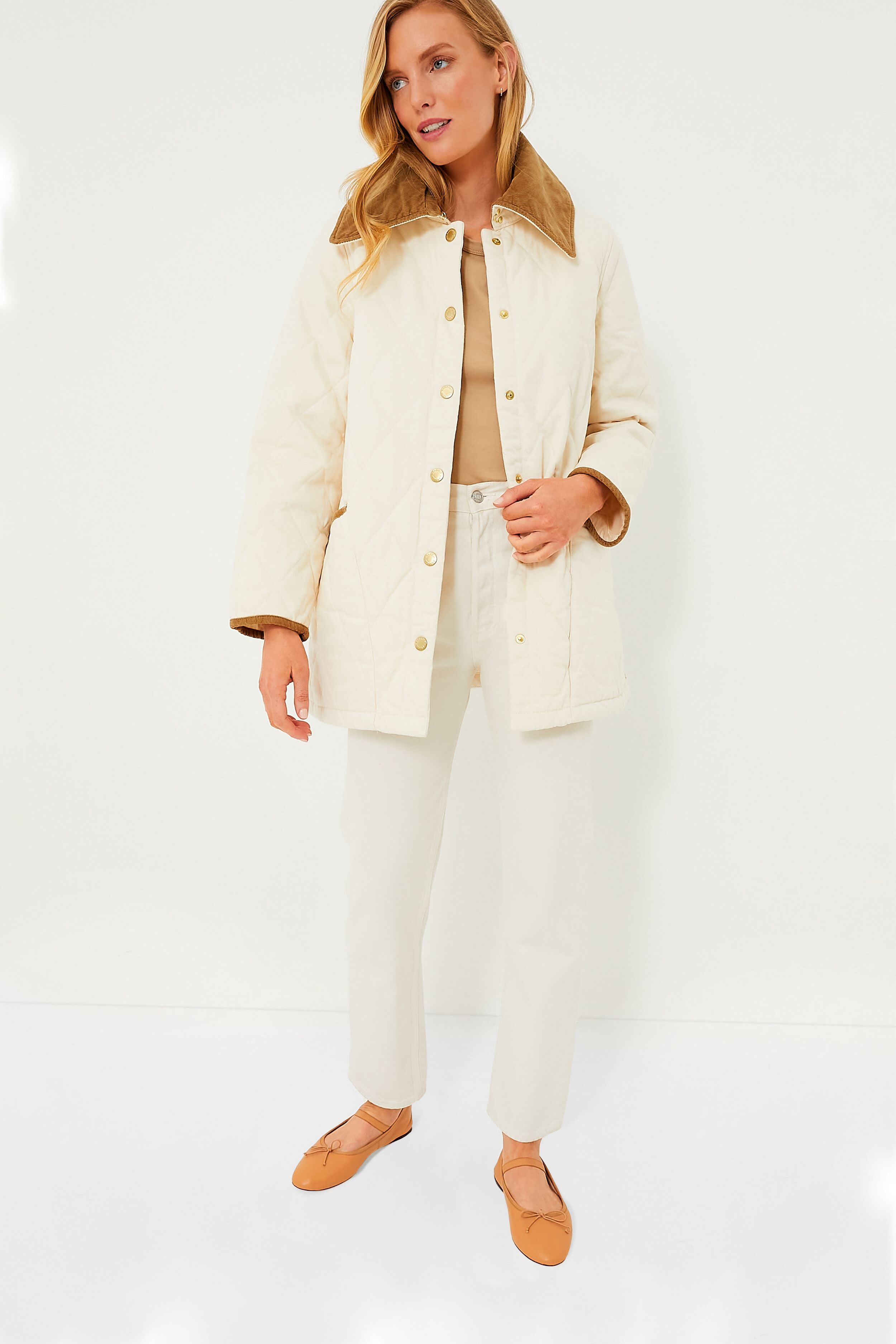 The Ecru Denim Modern Liddesdale offers a contemporary take on an outerwear classic. Boasting a relaxed fit with an oversized cord collar and trims. this quilted silhouette features practical side pockets. gold-tone buttons and complete with a gingham lining for a playful touch of print. Perfect for slightly chilly spring nights in the city or cold football games. we are wearing this piece with denim. boots. and a soft scarf for a stylish yet warm look.