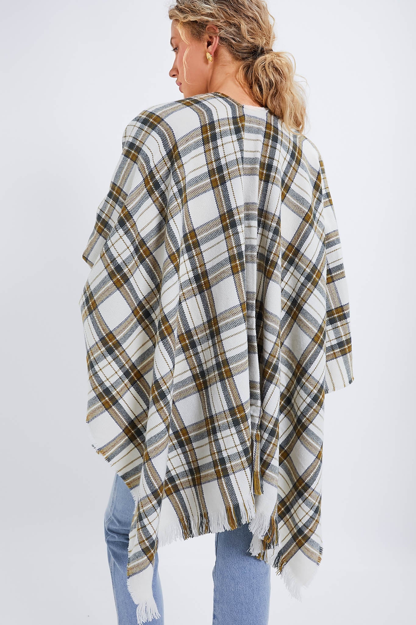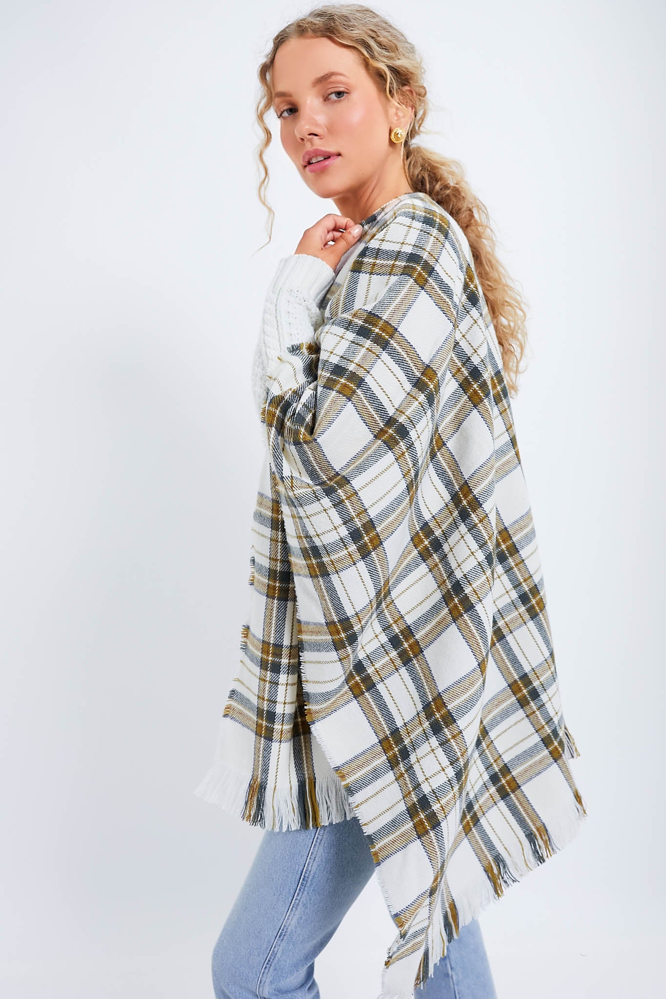In an exclusive cream tartan pattern. this is the highlight of your next dozen or so Saturdays and a cure-all for Sunday scaries. We are pairing it with a turtleneck and boyfriend jeans for a laid-back chic look. Perfect for throwing over your shoulders for dining al fresco or traveling in style. you will bring this along for every occasion.