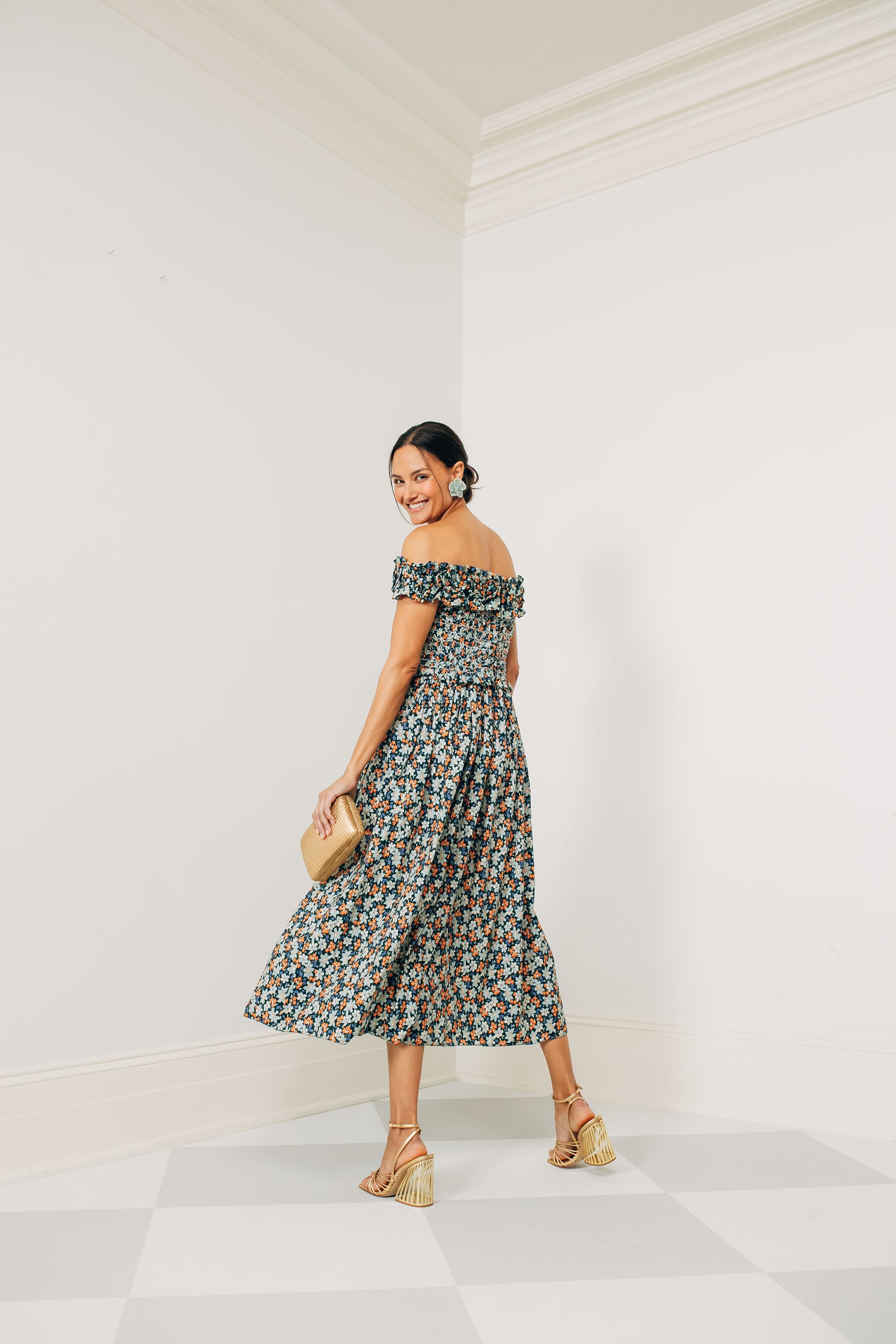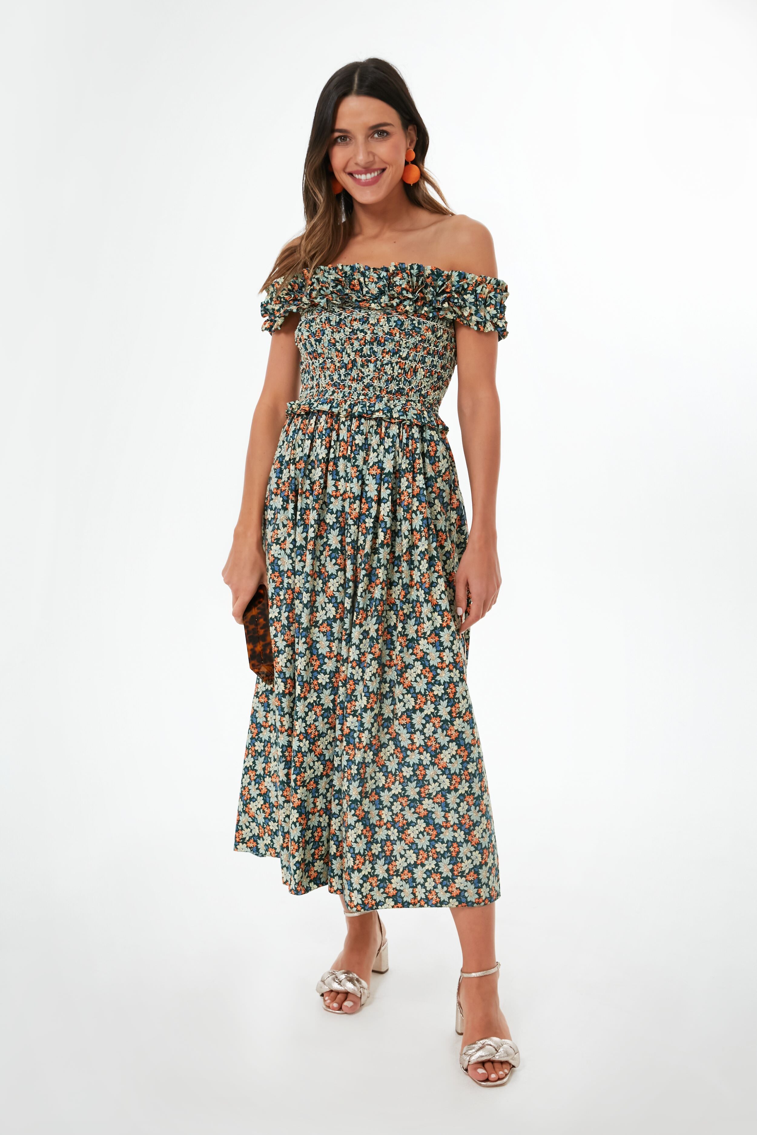There is no silhouette quite as idyllic and whimsical as the Forrest Peggy Floral Dress. With nature-inspired shades of deep green. creamy yellow. and brilliant orange that come together to create a fresh botanical print. this midi features an off the shoulder neckline with ruffle detailing and a smocked bodice that is equal parts romantic and super-comfortable. Add heeled sandals and a clutch for tropical escapes. garden parties. warm-weather weddings. you name it!