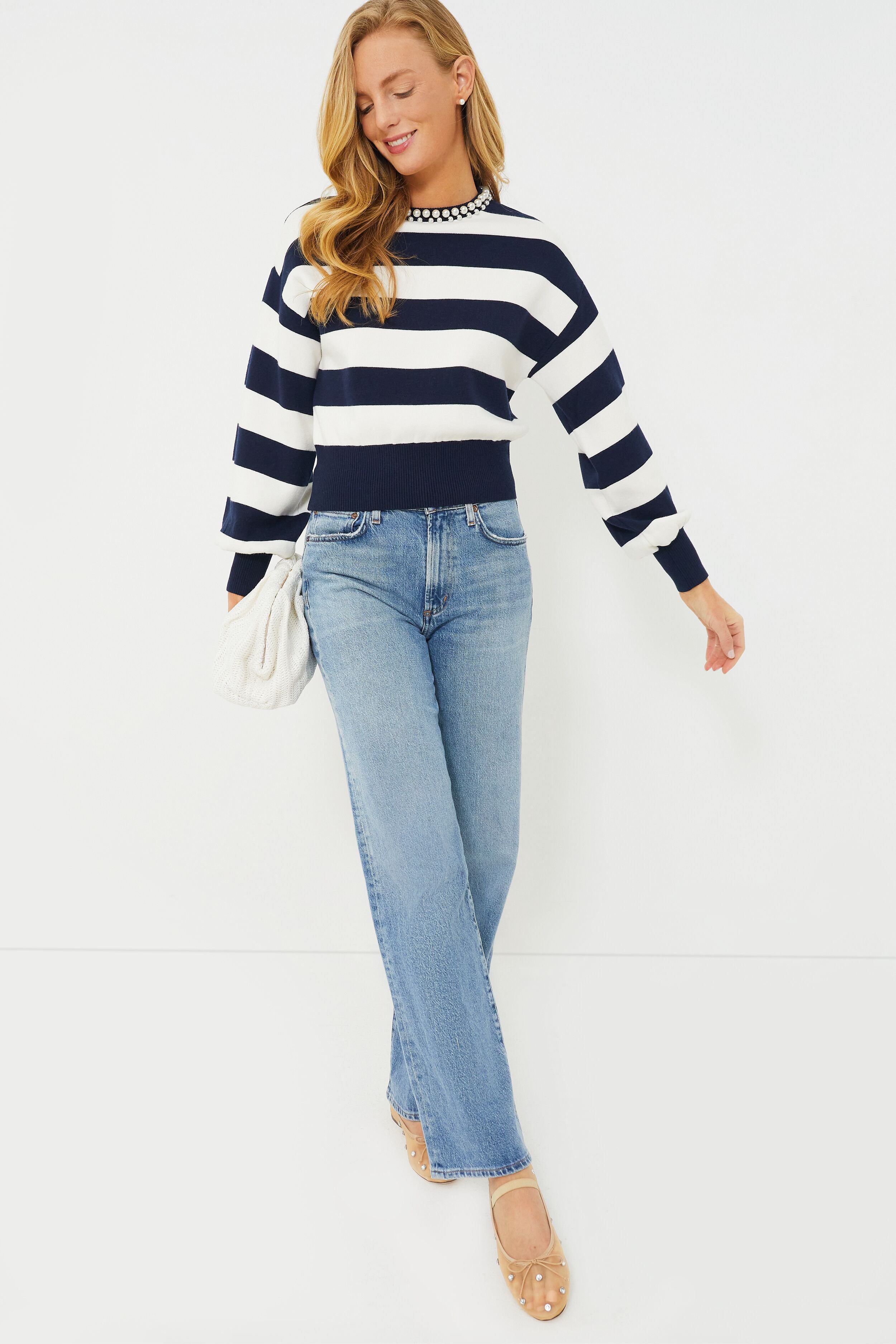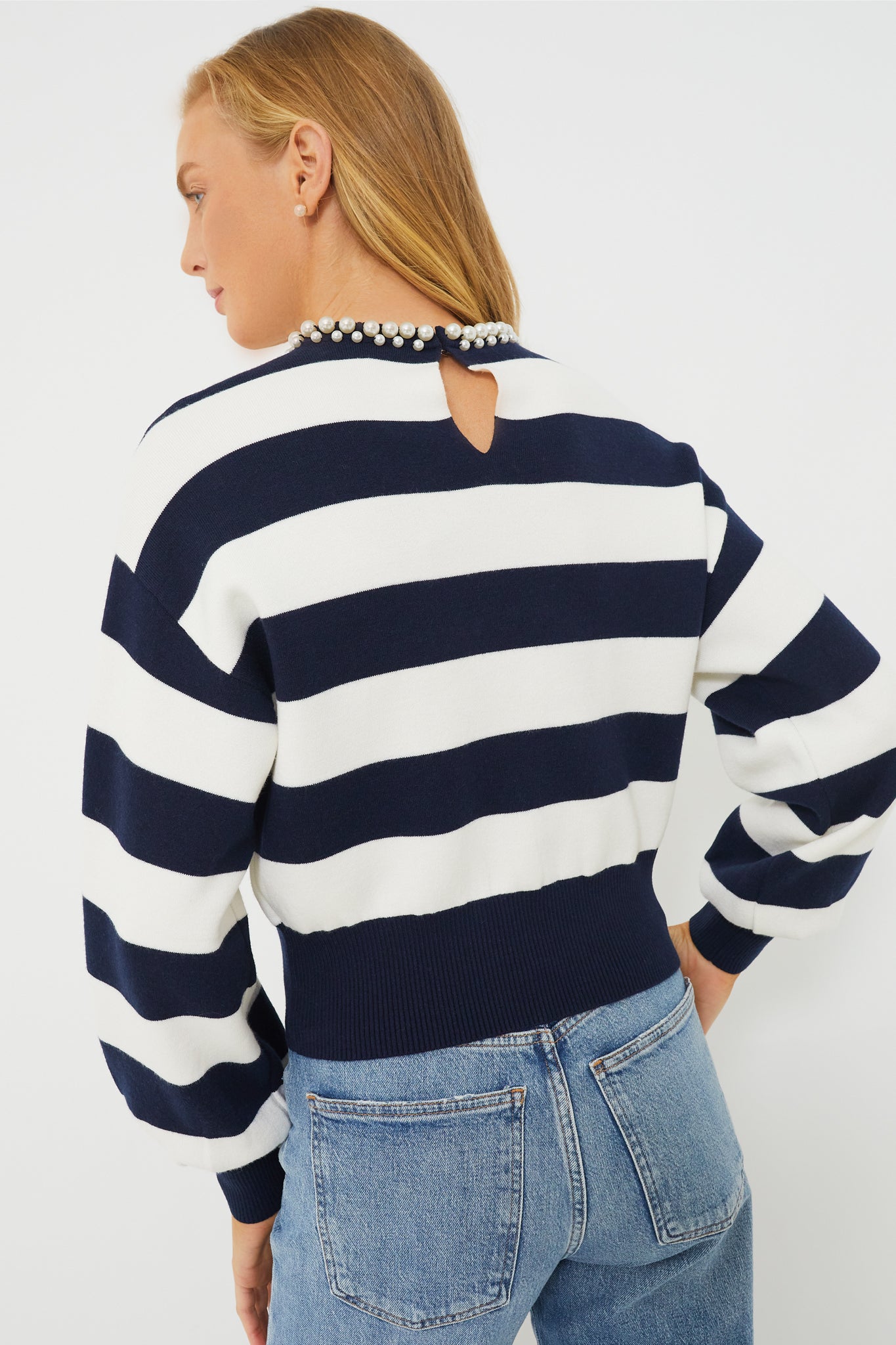The French Navy Awning Stripe Pearl Sweater is a tasteful and refined silhouette with a striking row of faux pearls along the collar. Featuring a slightly cropped style with long blouson sleeves. we are pairing this with the French Navy Awning Stripe Pencil Skirt for a chic matching set. or with black pants and gold stilettos for a dinner party look.