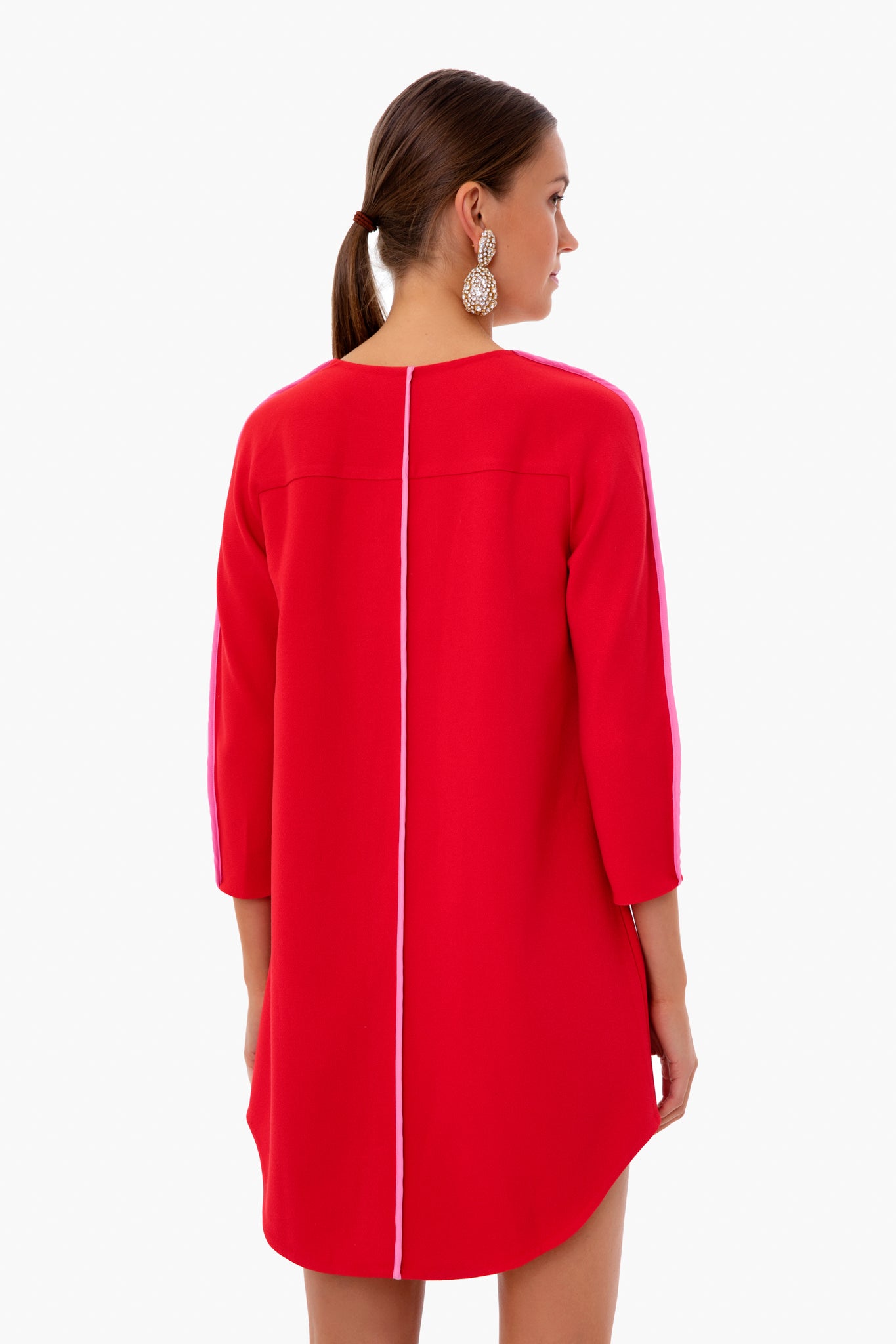 Clean lines. stretch crepe fabric and a shirttail hemline- the French Rose Seamed Shift Dress slips on in seconds but looks completely considered and put together. This dress takes your basic piece and pushes it to new levels with its sassy red hue and pink piping for a bright and fun play on a staple shift style. We are pairing this with statement earrings and heels for holiday parties and switching to sandals and sunnies for warm winter escapes!