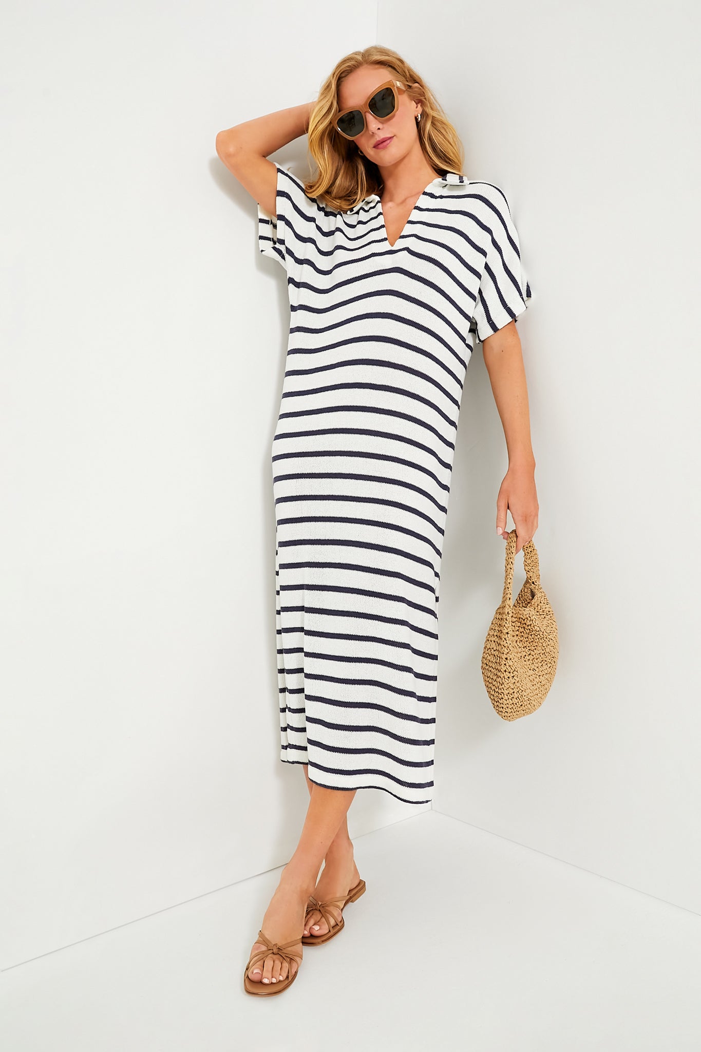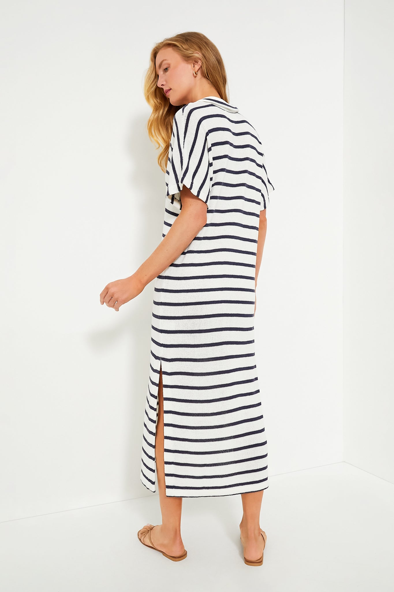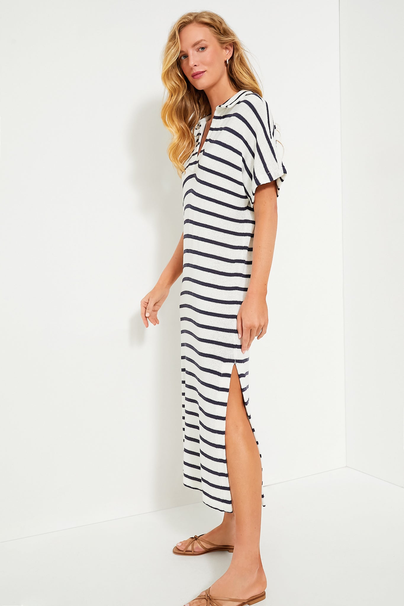Step out in style and comfort with the French Stripe Knit Maren Polo Dress. This easy throw-on style features collared neck. short sleeves and side slits for optimal movement and comfort. From busy days running errands to beachside strolls. this easy number pairs seamlessly with everything from sandals to sneakers.