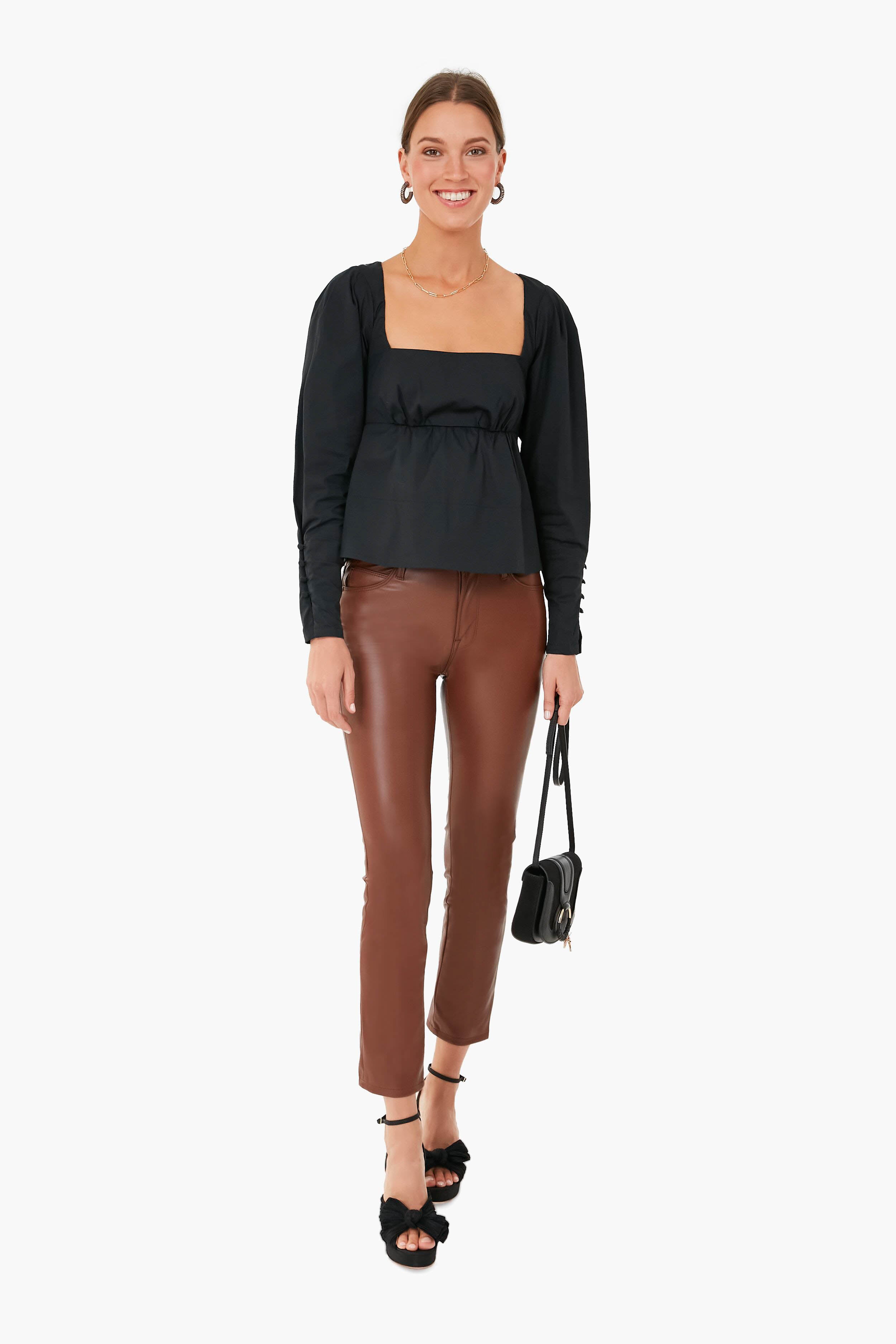 Cut from buttery-soft faux leather. the Friar Brown Mid Rise Dazzler Ankle is a fun switch-up for when you want something other than denim. Featuring a wearable slim cropped silhouette. these straight leg pants have a clean hem and pair well with boots. heels. and sneakers alike. We love to wear this style with a feminine blouse for a flirty look made for a night out on the town. or with a chunky knit for the perfect fall outfit.