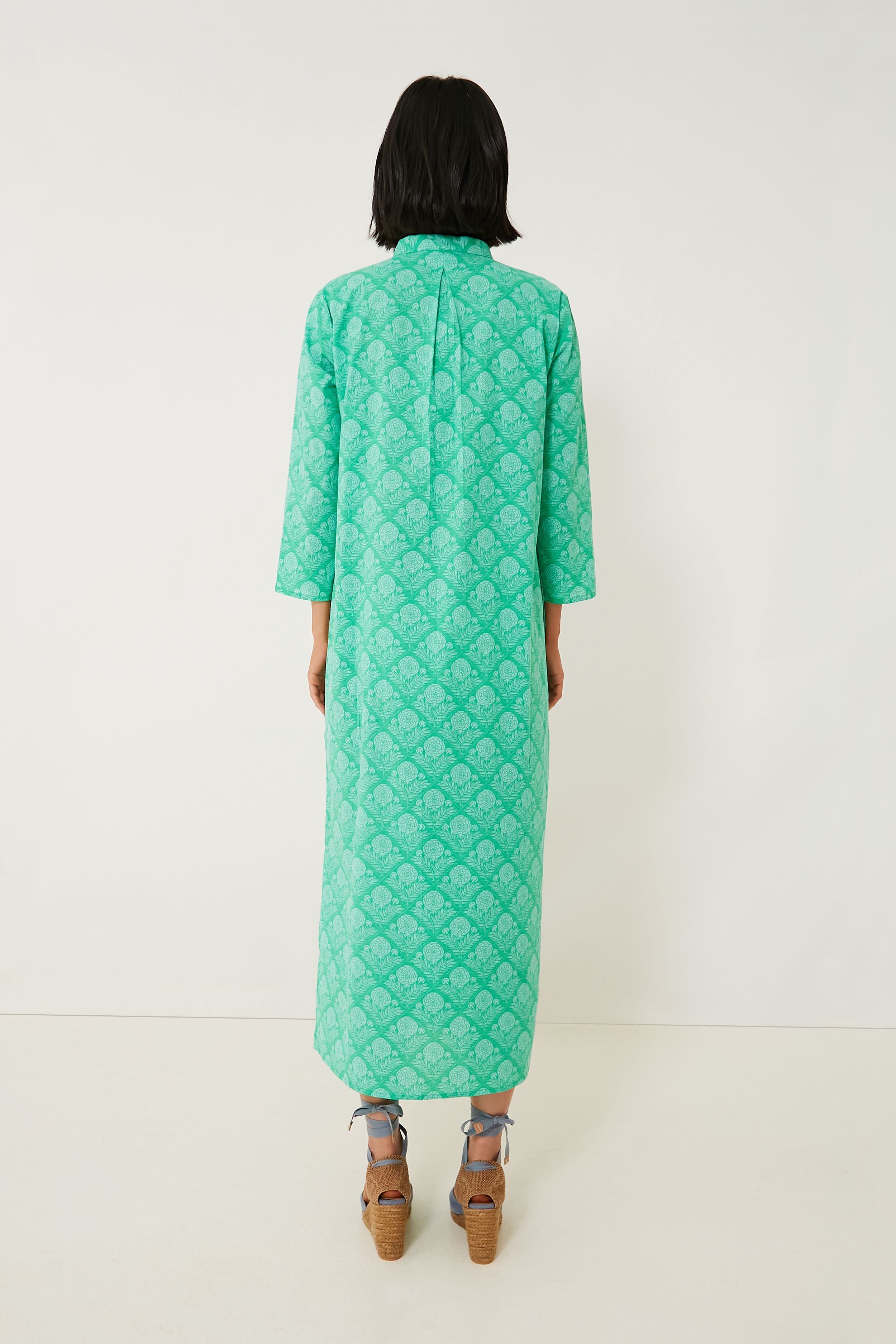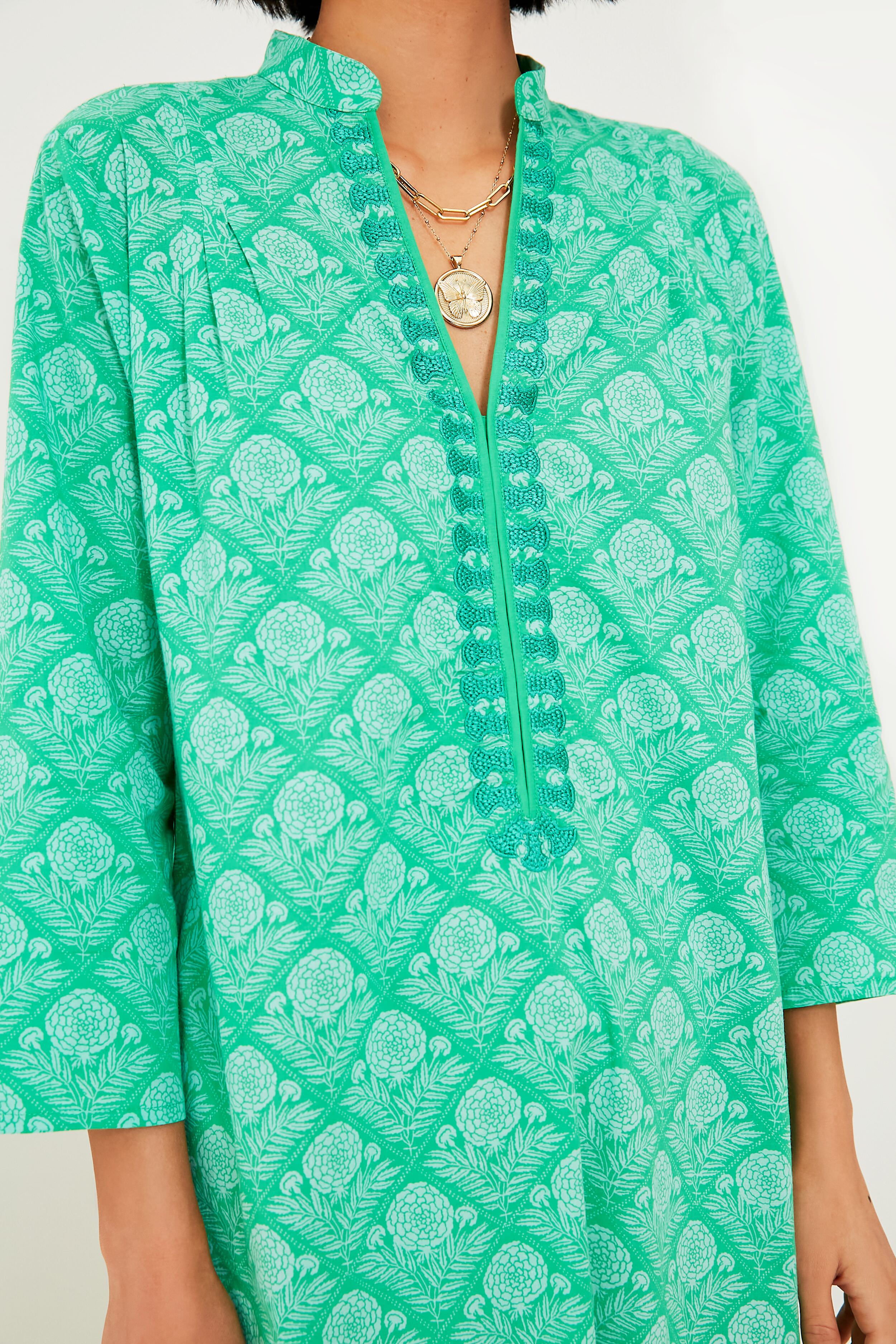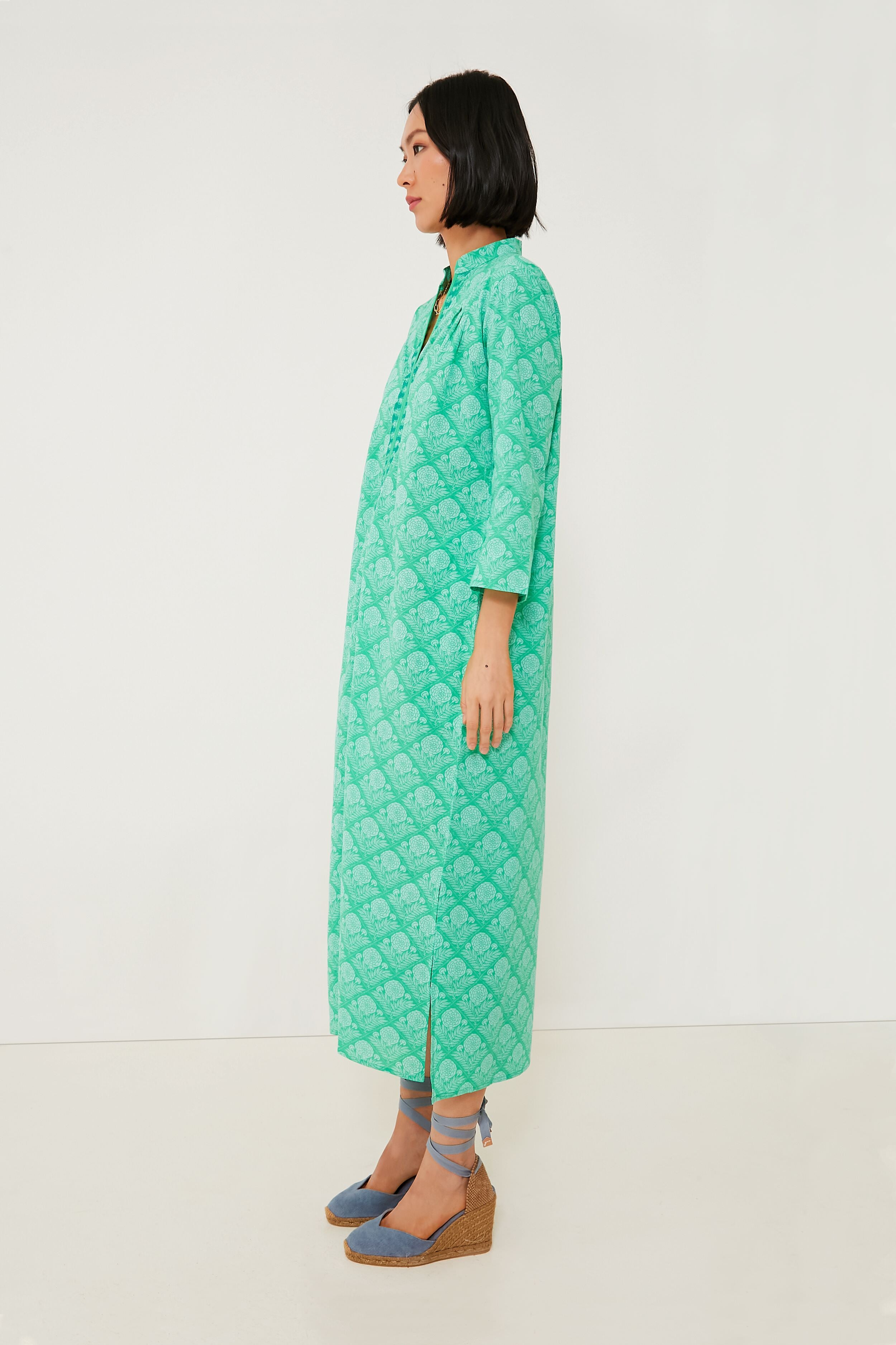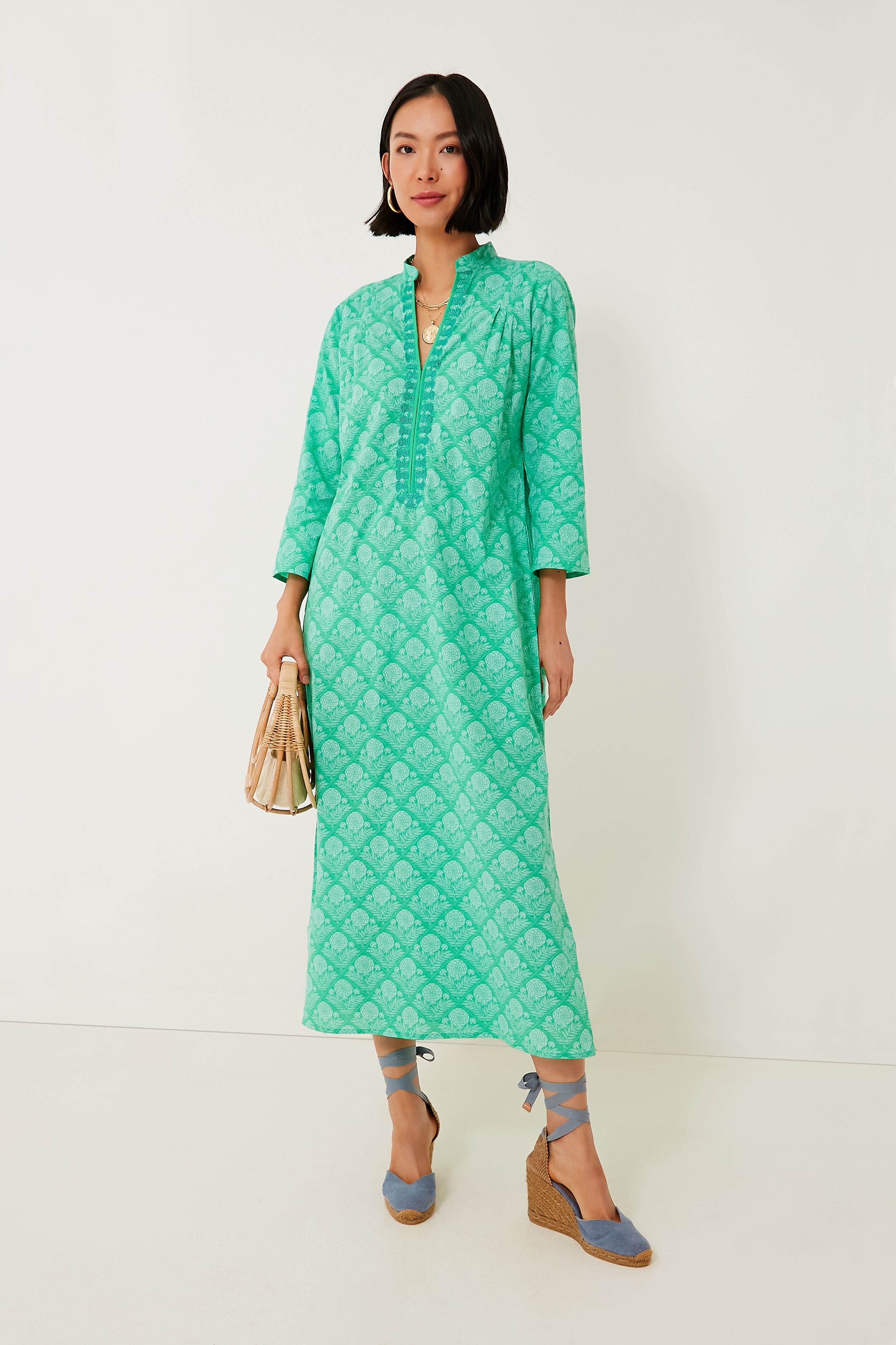 The Green Lauren Clorinda Long Kurta reminds us of fresh air and the twinkly blue sea. This flattering and comfortable caftan silhouette features a midi length hem. a band collar with a V-neckline. and three-quarter length sleeves for that beautiful. boho-chic look we all know and love. Timeless and ultra-breezy. this is a must-have for your next getaway — just pair with sunglasses and espadrilles for an effortless beach to bar look.
