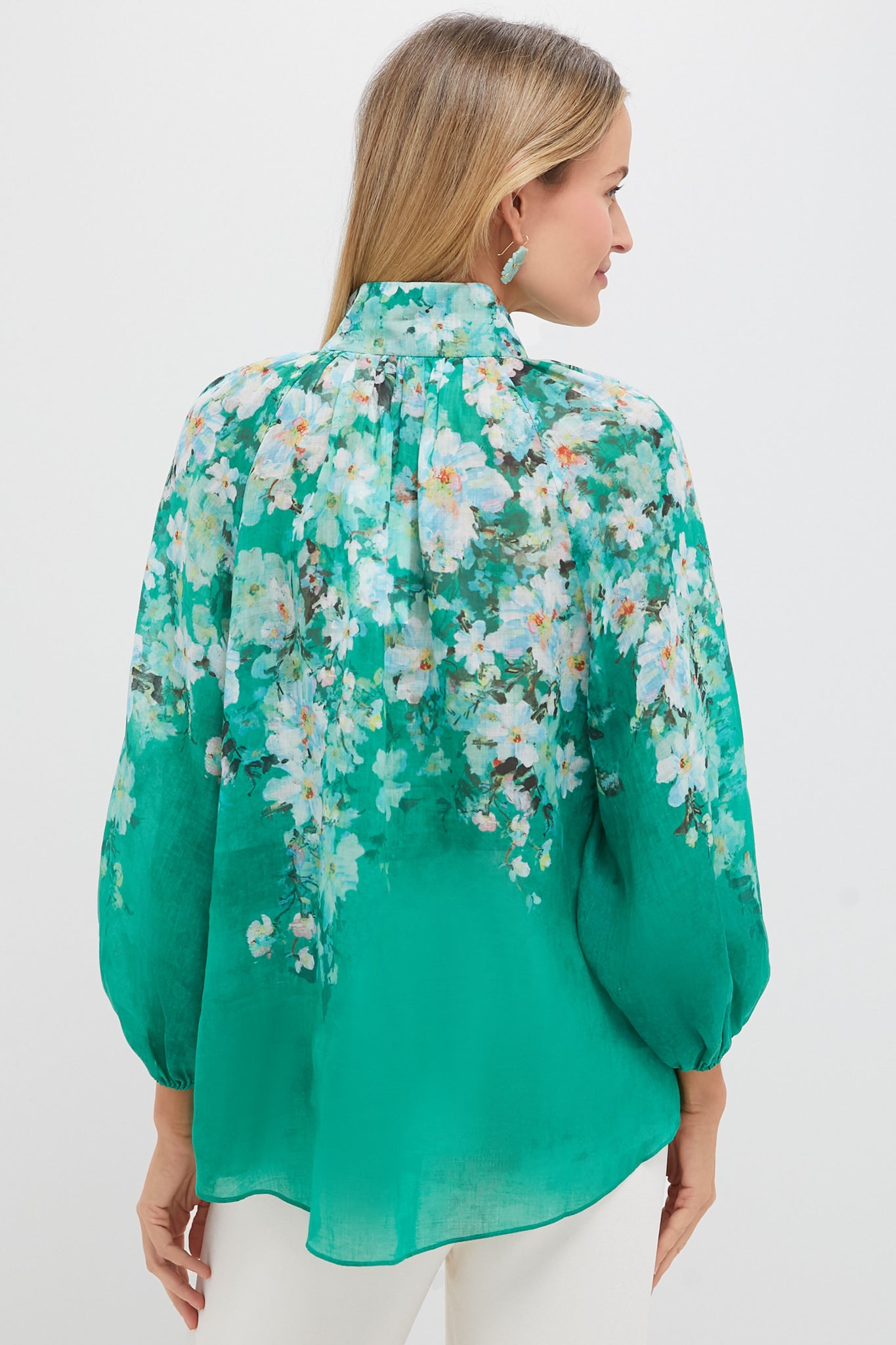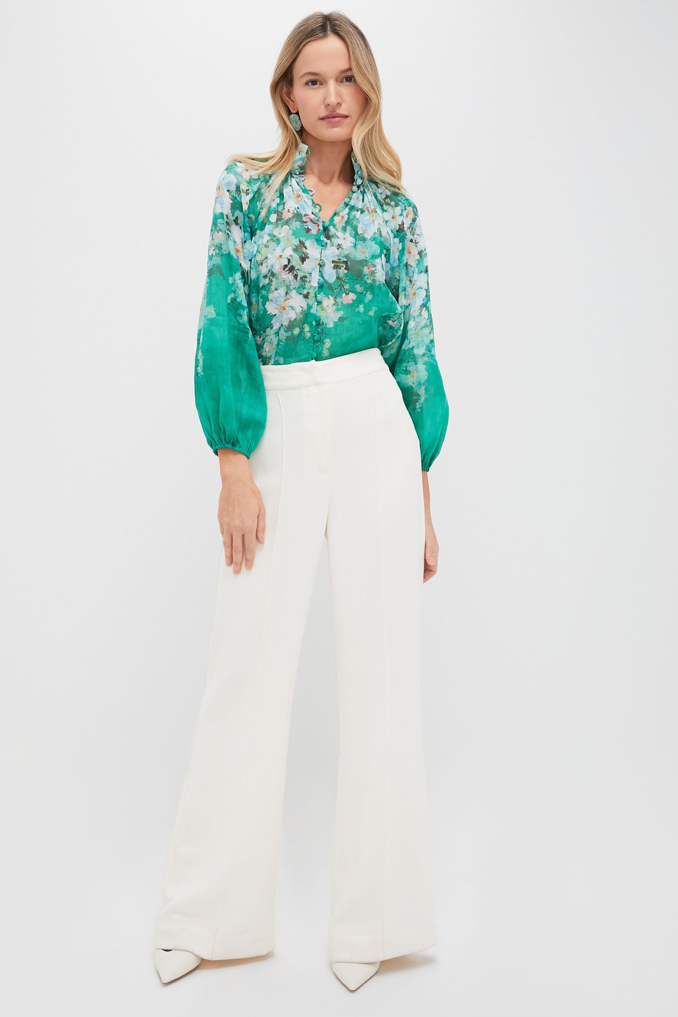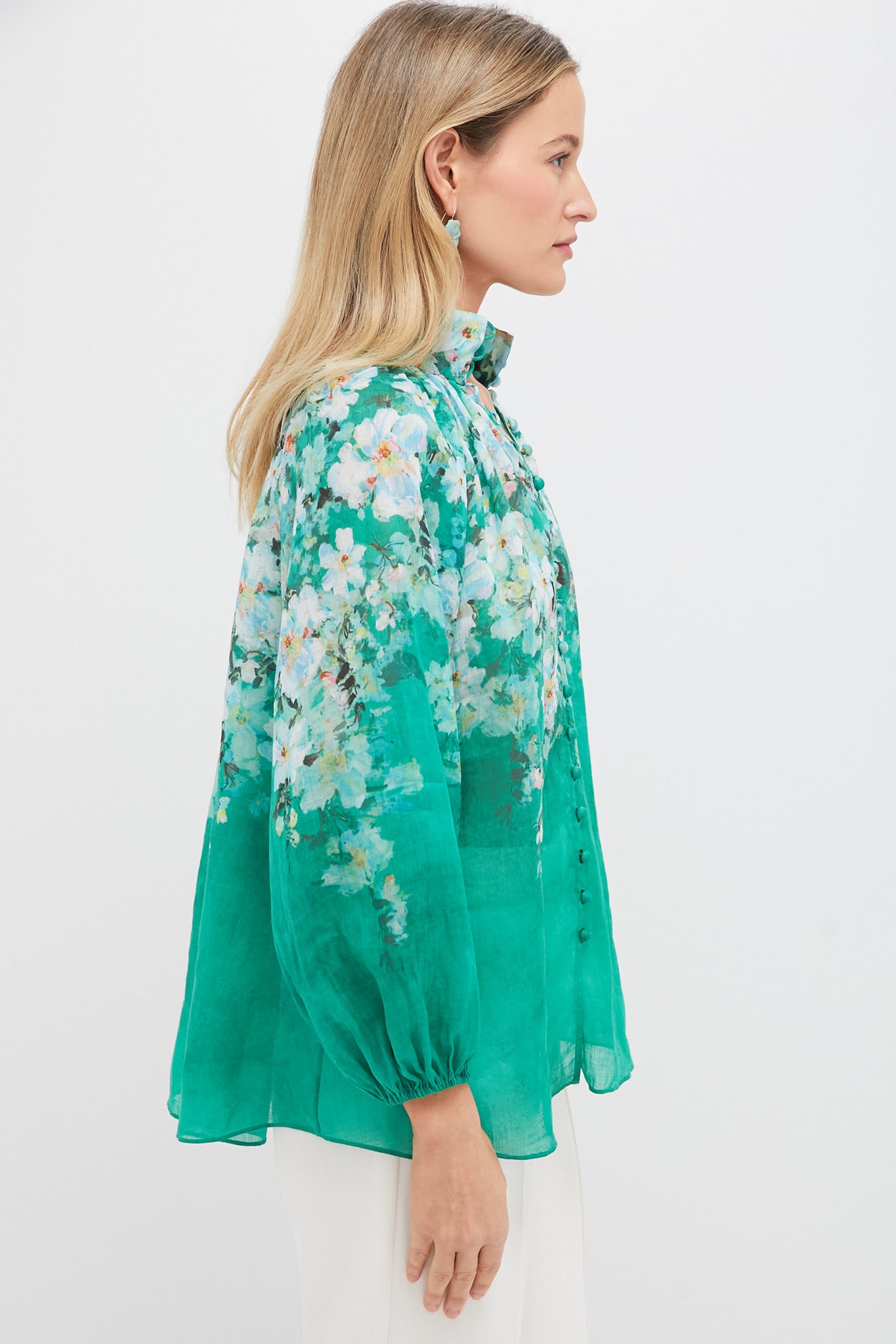 The Watercolour Floral Everley Billow Blouse features a high neckline. rouleau loops and buttons down the centre front. and a grouse floral pattern throughout. Perfect for afternoon lunch with the girls. celebratory occasions. or anything in between. style with white trousers. heels. and a woven handbag!