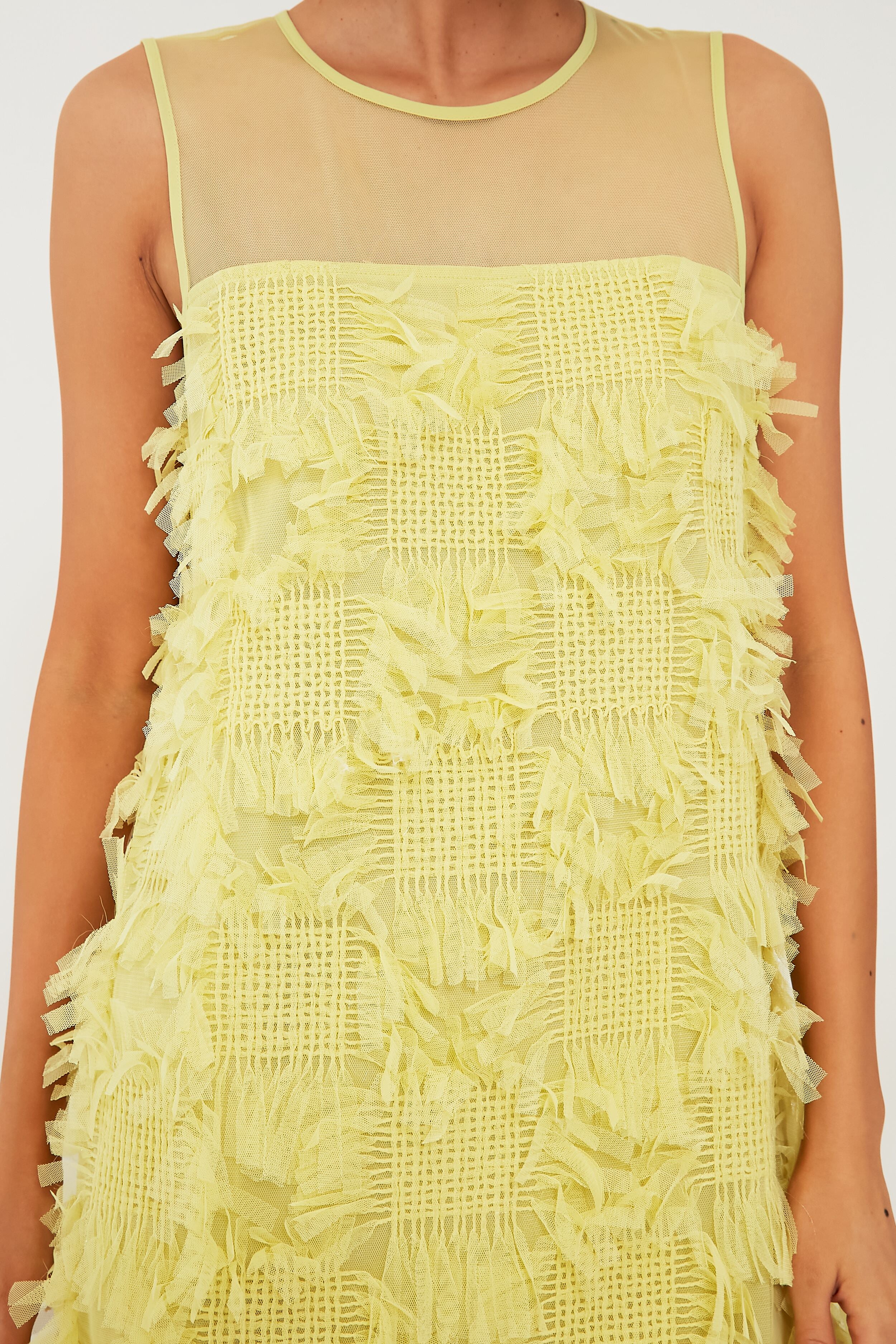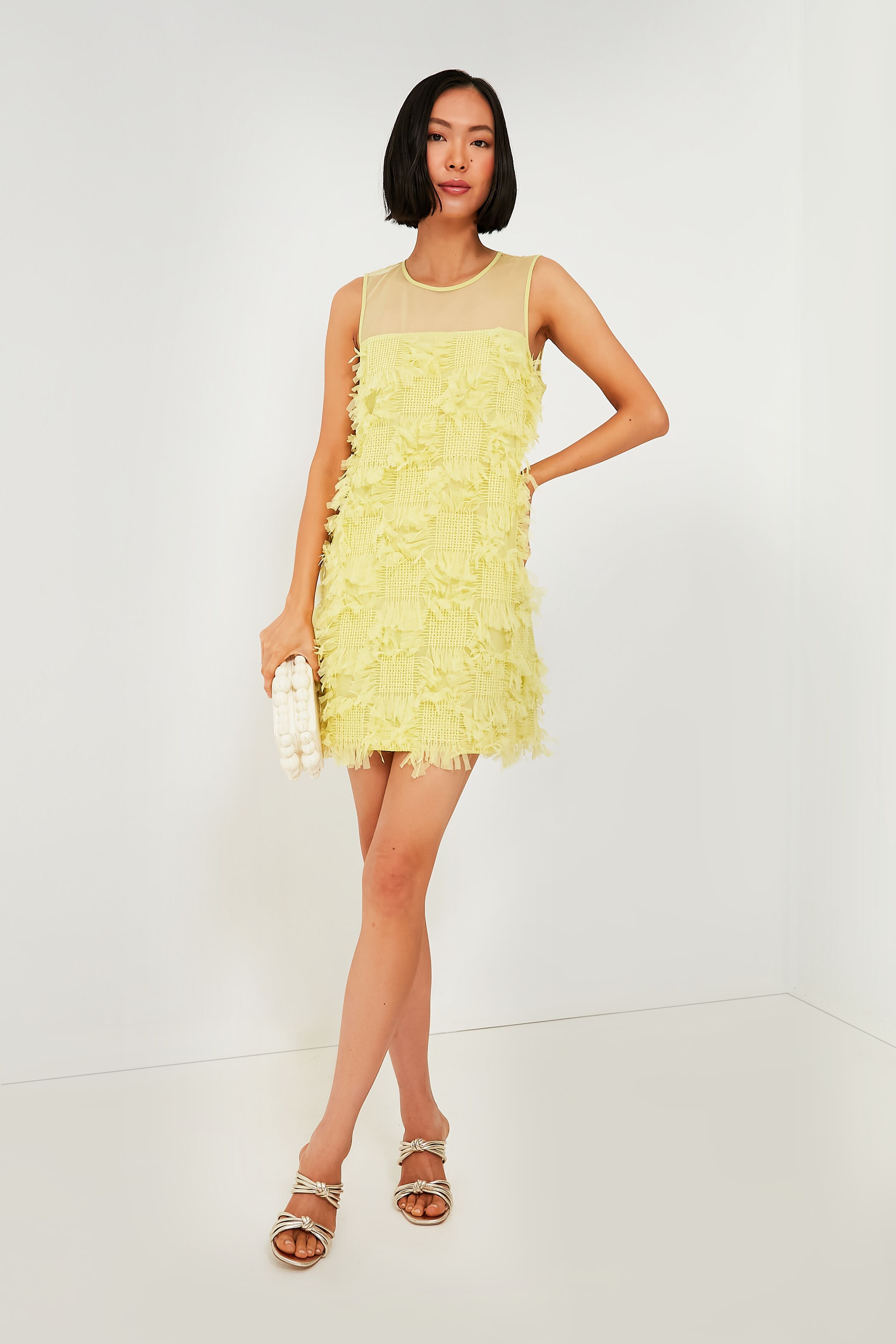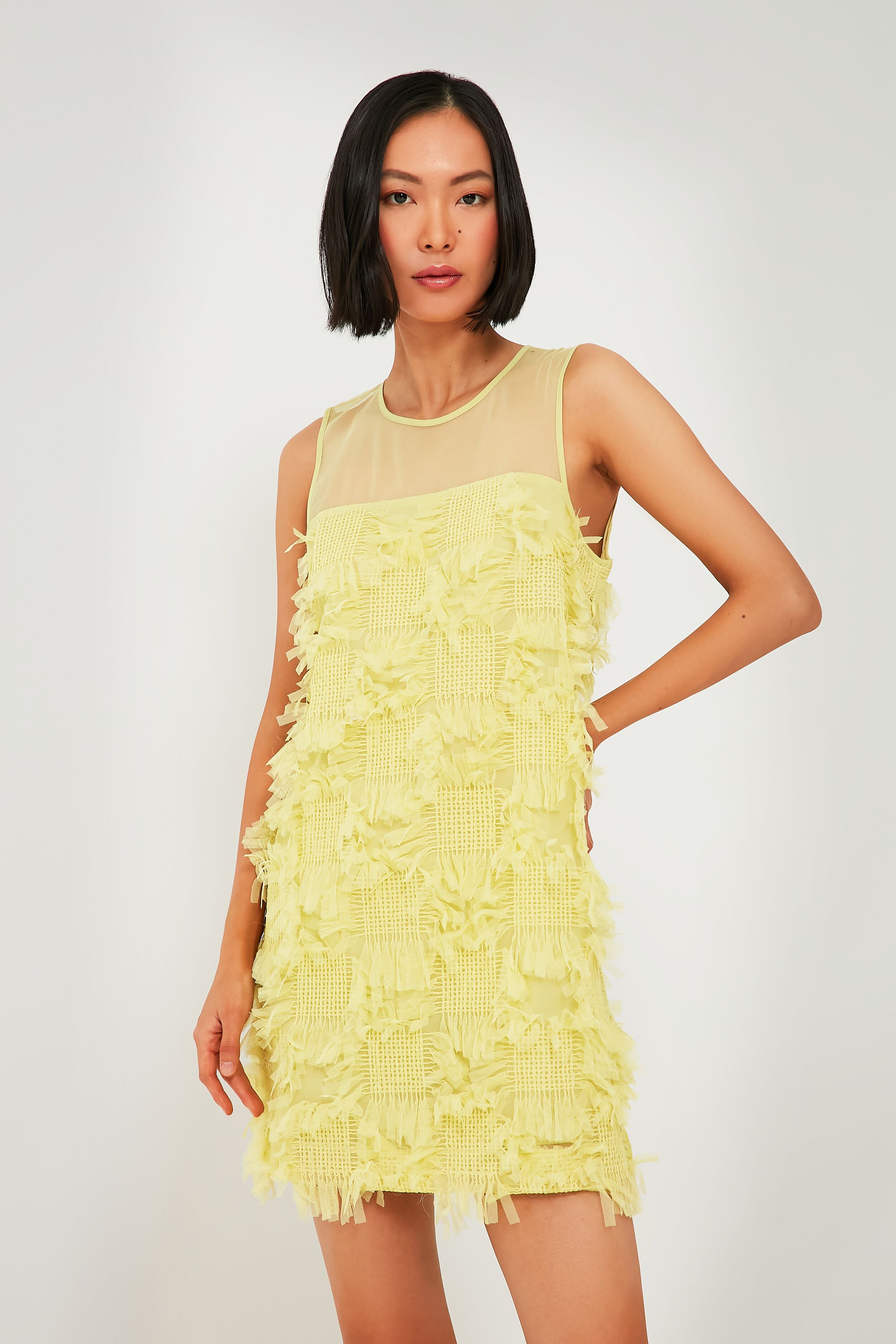 A sweet sheath with plenty of attitude to boot. we are really into the Jaune Yellow Alizeh Dress. Playing with multiple different textures in the form of a mesh upper bodice and a checked pattern with fun fringed edges. this silhouette just screams party time to us! Perfect for pairing with metallic heels. bright statement jewelry. or the matching cropped jacket. you're going to have so much fun styling this intriguing number for concerts. cocktail parties. and more this season.