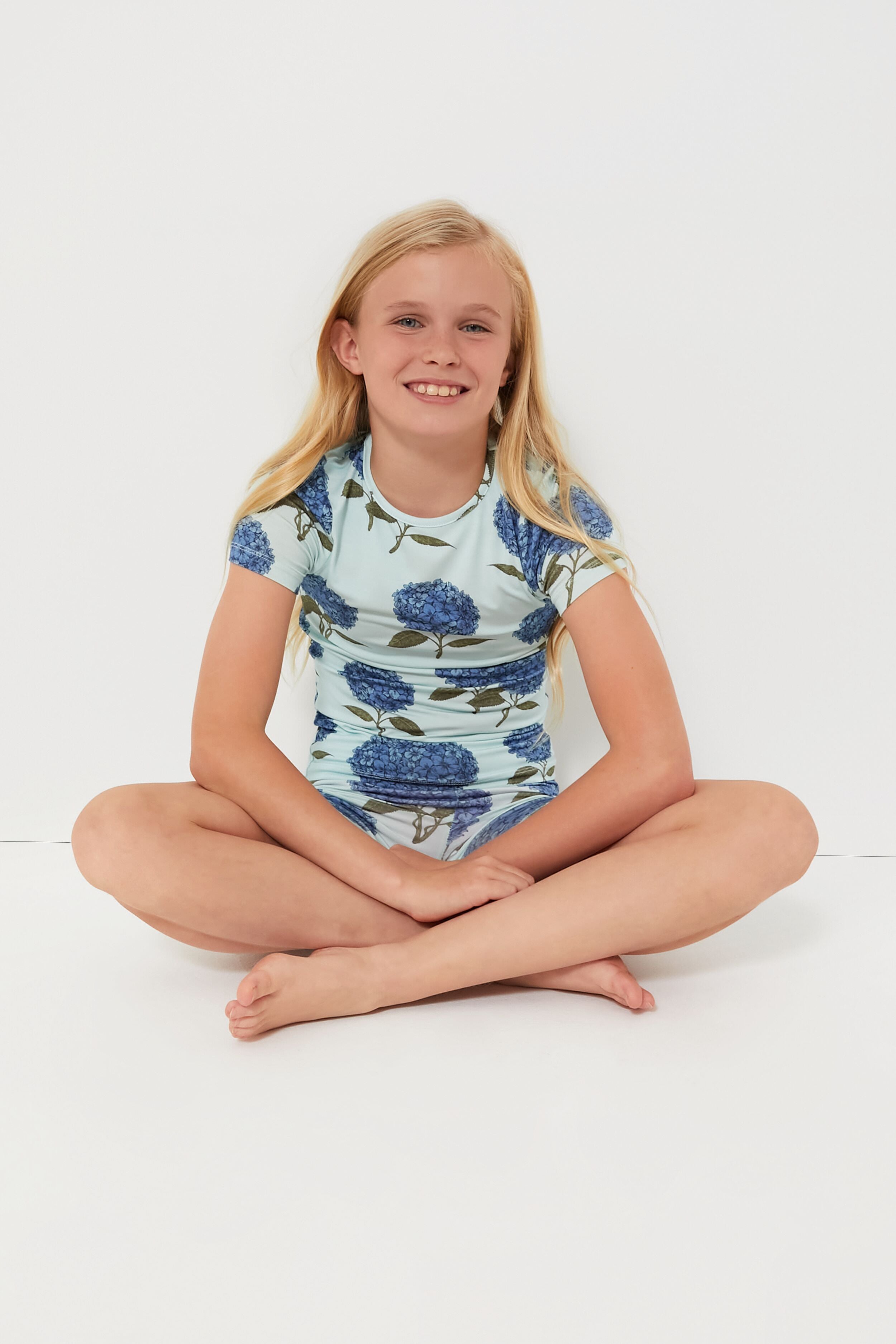 The Light Blue Hydrangeas Kids PJ Set is in full bloom! Made from a bamboo material that's soft like cotton with a smooth. silk-like texture. it is breathable and absorbent to keep littles cool in the summer and cozy in the winter. Fuss-free but super stylish. these short sleeved pajamas are sure to make bedtime easier for everyone involved.