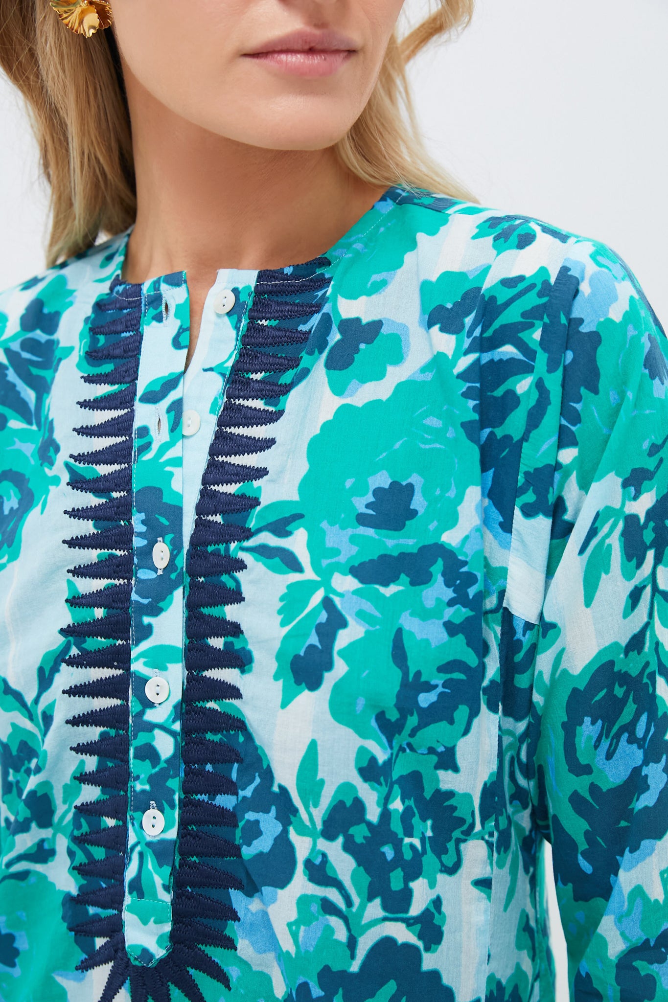 Step out in style in the Light Blue Petunia Long Kurta. Made from 100% cotton and featuring an embroidered collar. deep V cut with a button placket. and flirty side slits. this statement piece is a breezy show-stopper. Pair with sandals and a tote for strolling around the boardwalk. or dress up with espadrilles and earrings for dinner.