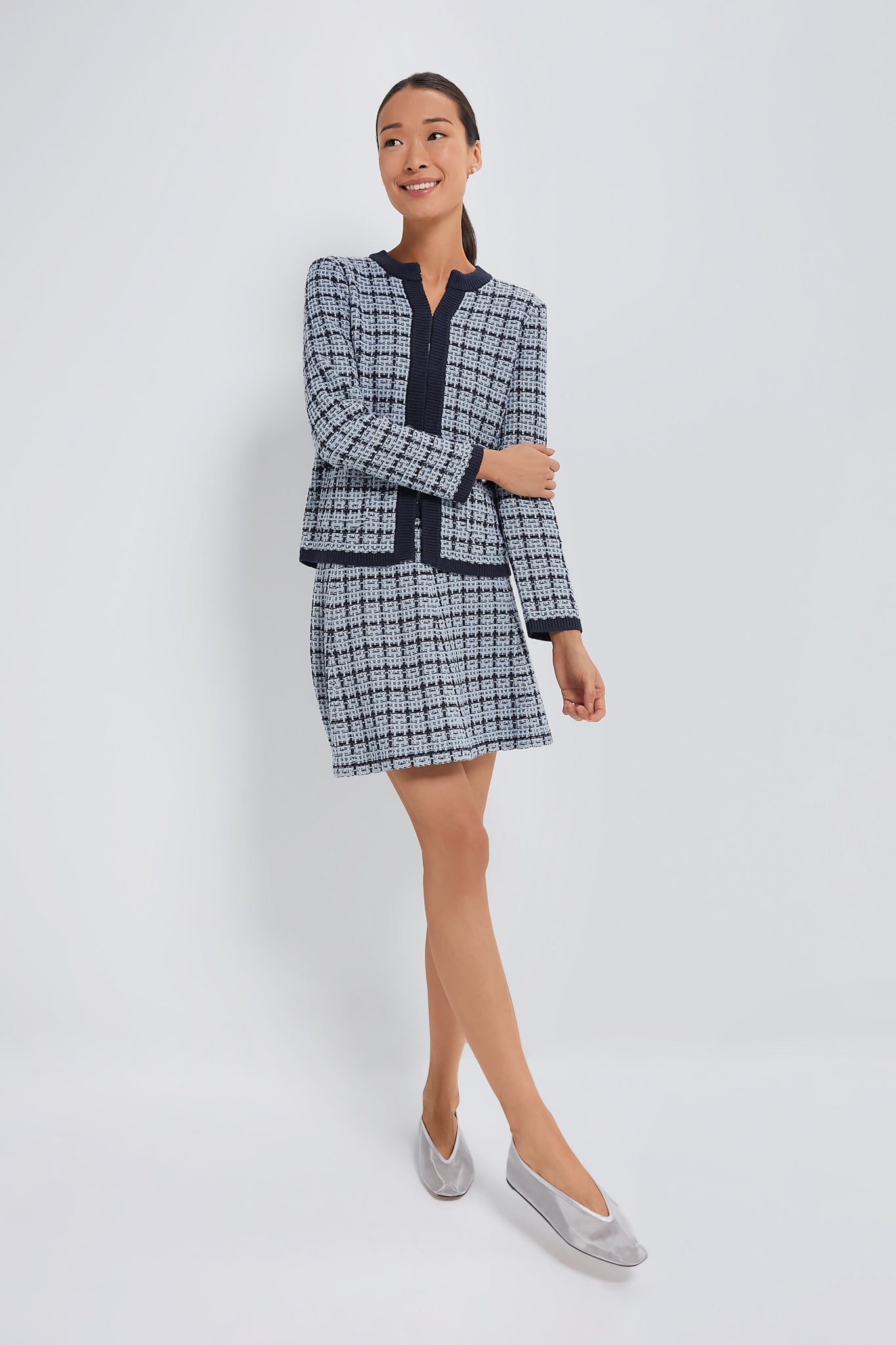 We adore the subtle metallic flecks. contrasting ribbed trim. and slightly boxy fit of the Light Chambray Braided Knit Jacket. Pairs perfectly with your favorite denim or wear it as a set with Light Chambray Pleated Knit Skirt to create the ultimate polished look.