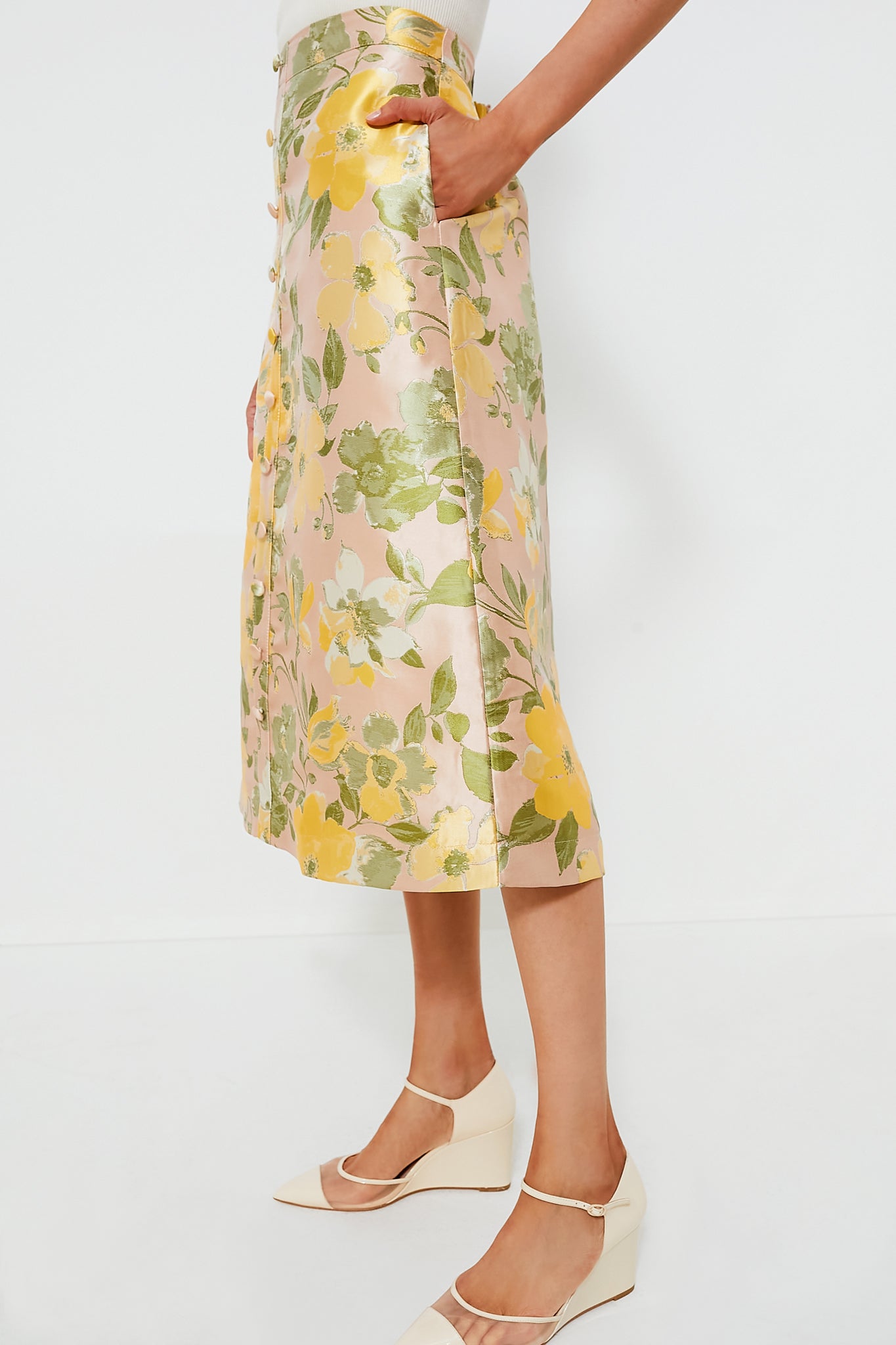 The Lotus Jacquard Adalyn Skirt is calling your name! With a bright and refreshing pattern. front button details. and side seam pockets. this piece can be transitioned from day to night. Pair as a matching set with the Lotus Jaquard Thea Blouse and white heels for a bridal shower or with a fitted white blouse and clutch for dinner and drinks.