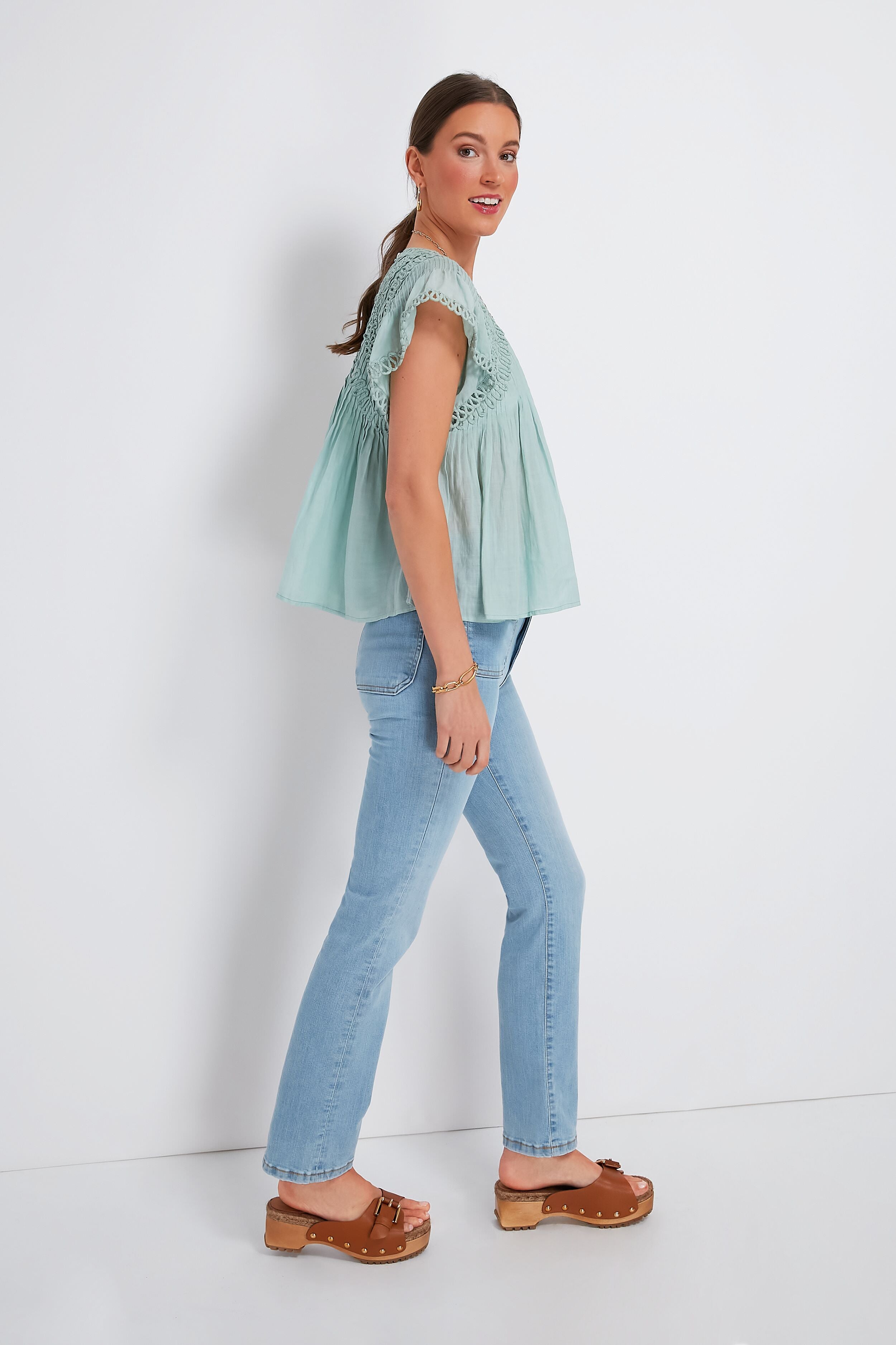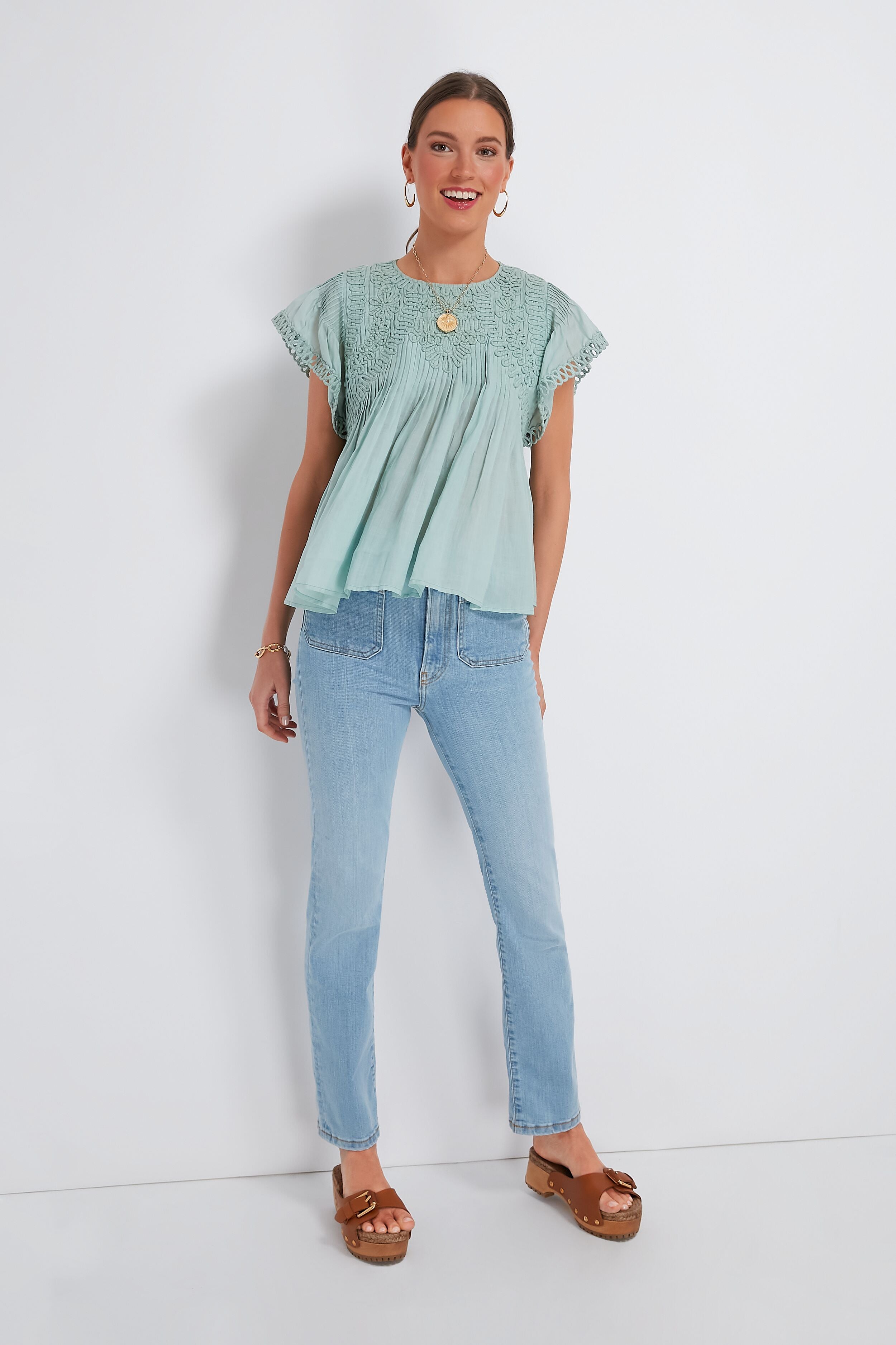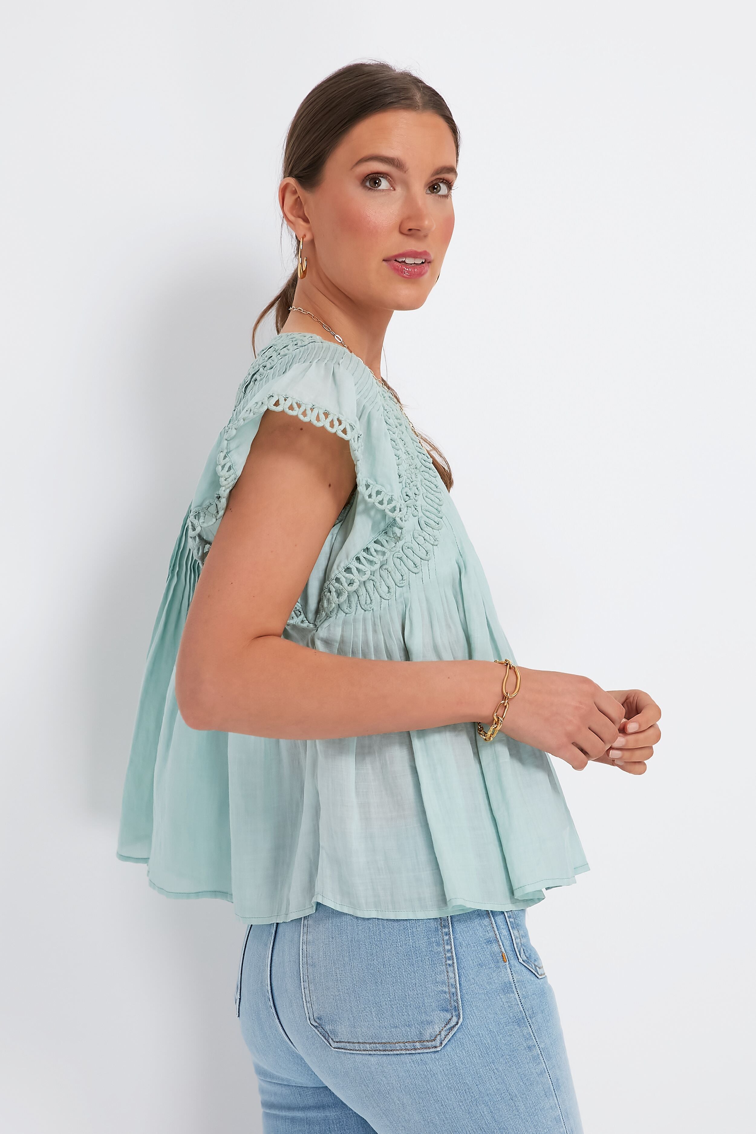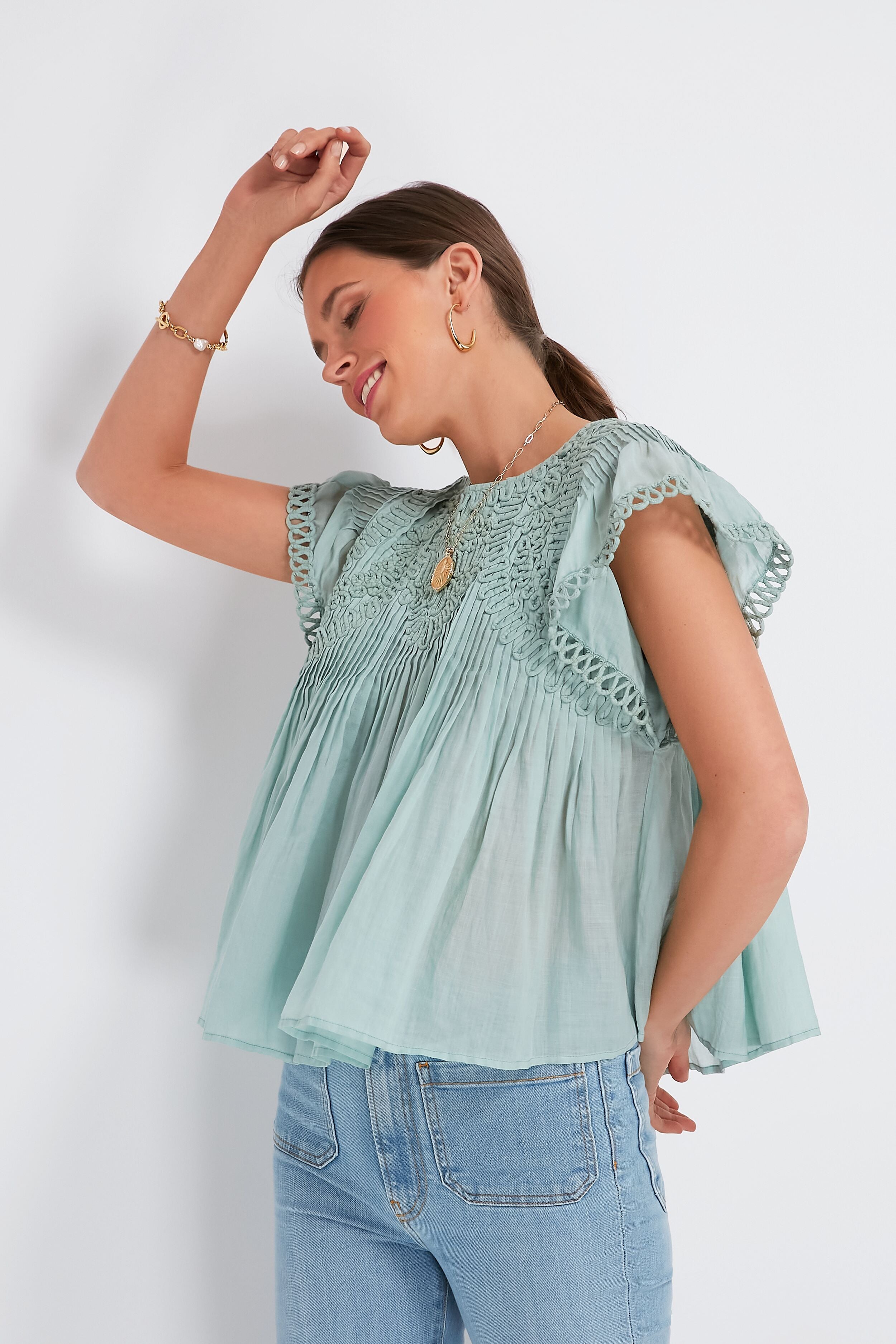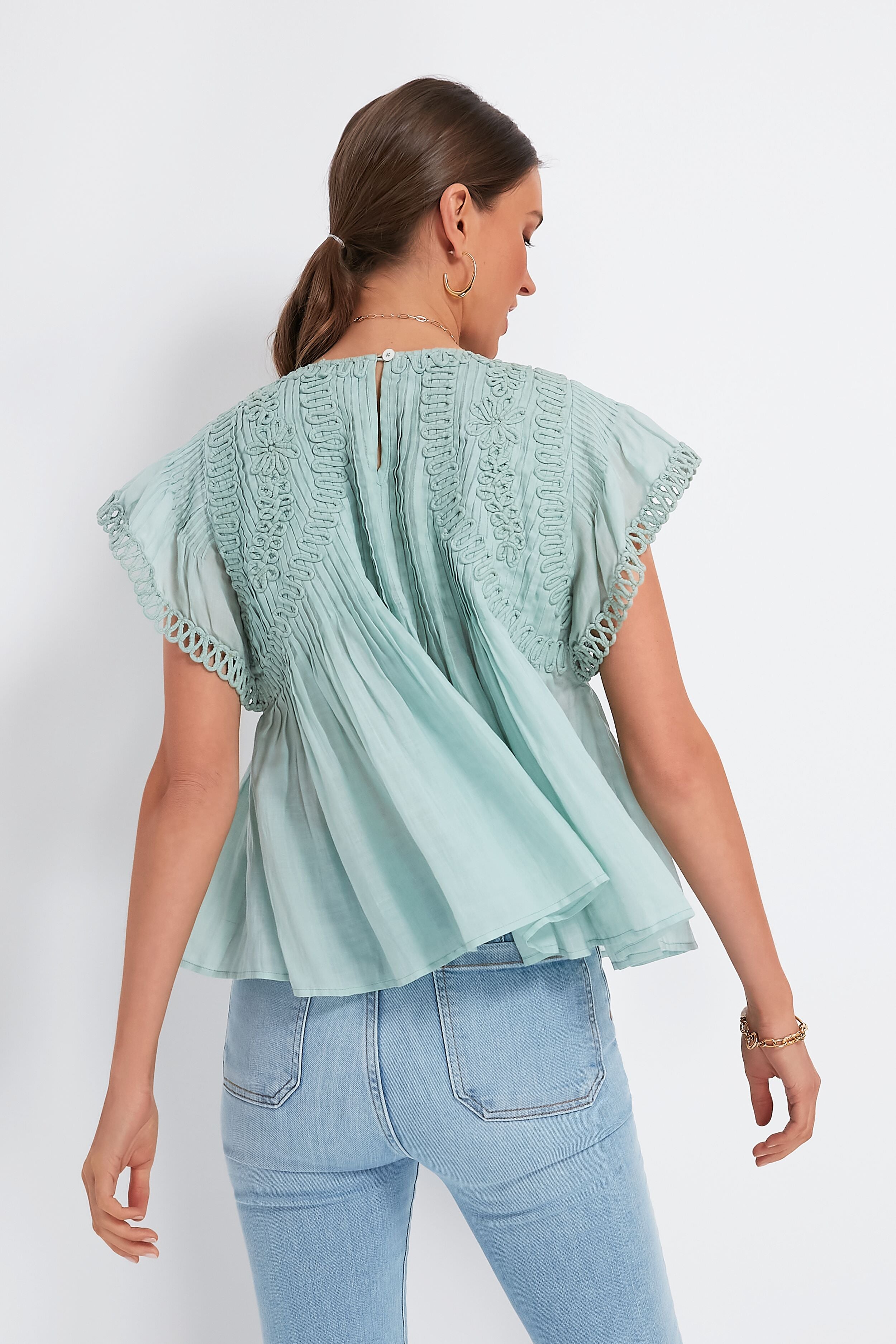 The Mint Frida Top is intricately gathered with stunning textural elements that show its attention to detail. Embellished trim at the flutter sleeves. piped embroidery detailing. and pintucking throughout this silhouette add some polish to its relaxed. breezy shape cut from lightweight ramie. As comfortable as it is chic. this blouse looks fabulous when paired with denim for park picnics. or with shorts and sandals to explore sunny vacation towns.