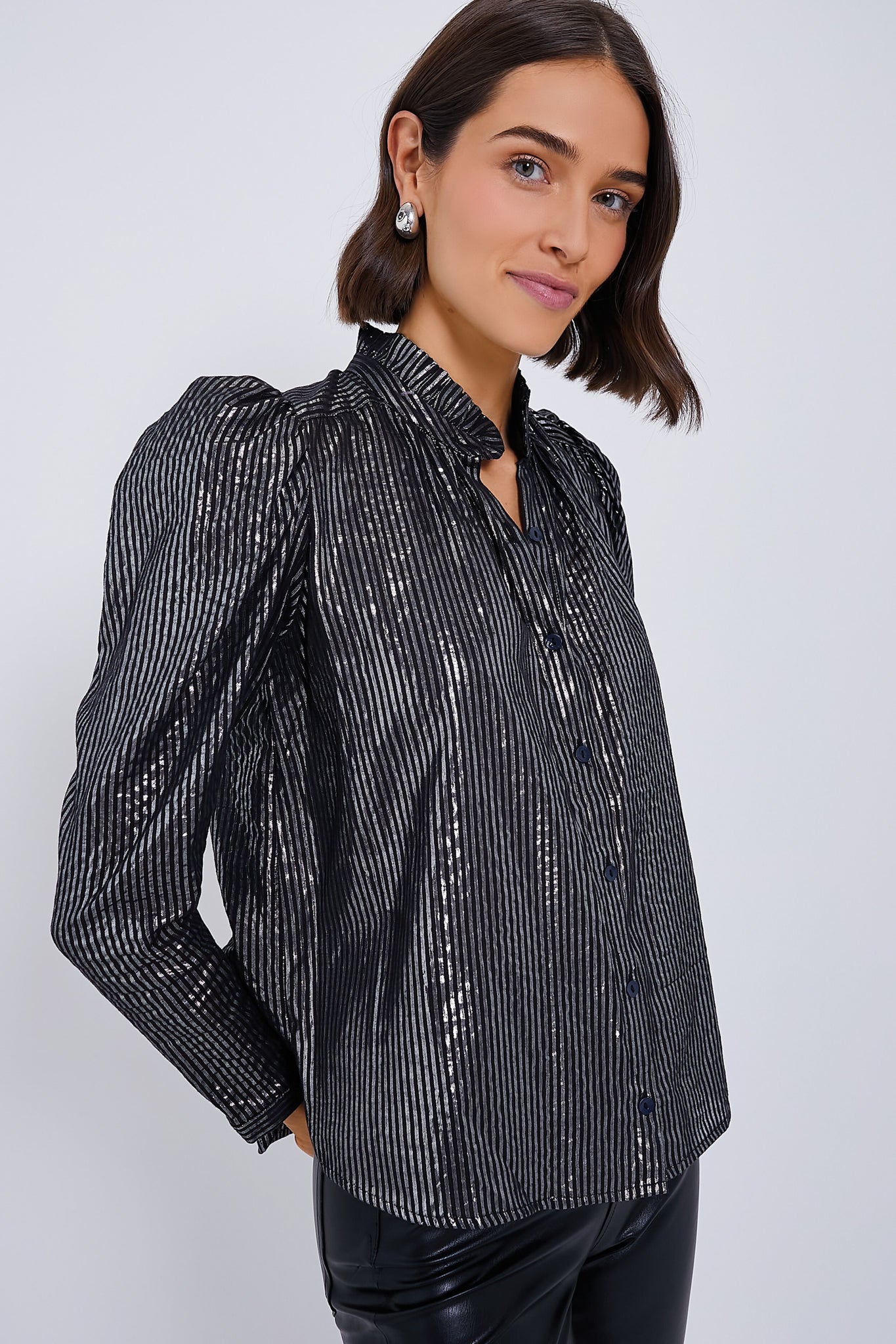 Shiny with a '70s disco flair. the Moonlight Artemis Blouse is full of feminine details like ruffled stand collar. subtle puff shoulders. mother of pearl buttons down the placket. and a floaty fit that all come together to create an understated but elegant top. Pair it with trousers for an elevated ensemble or a midi skirt for a chic date-night 'fit.