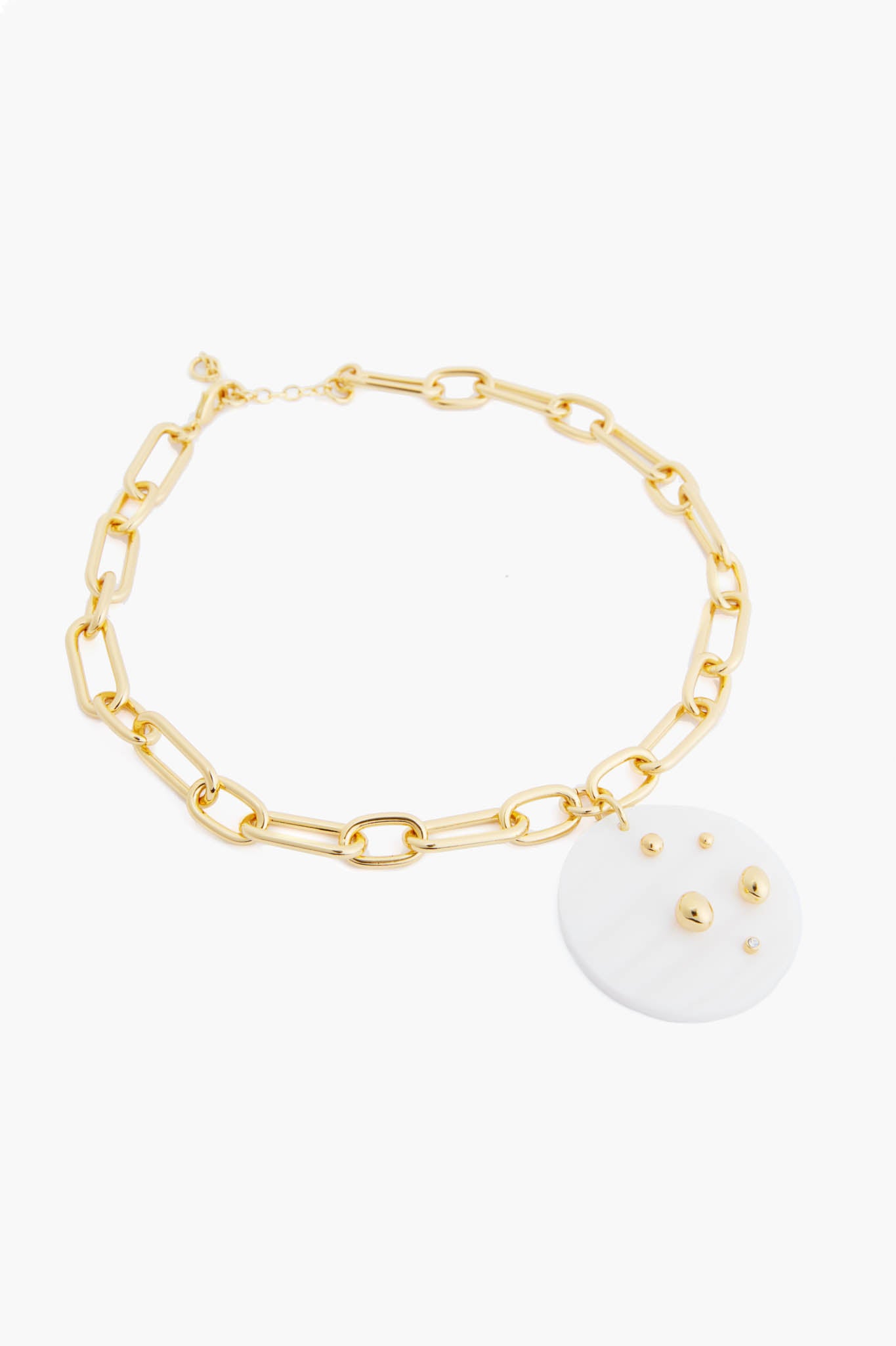 Classic with a twist. the Mother of Pearl Cecily Necklace combines our favorite design elements: pearl and gold chain link. This statement making piece has a two inch extender so you can customize the length depending on the neckline. Perfect for summer weddings and evening picnics. we are pairing it with a classic LBD to let this stunner shine!