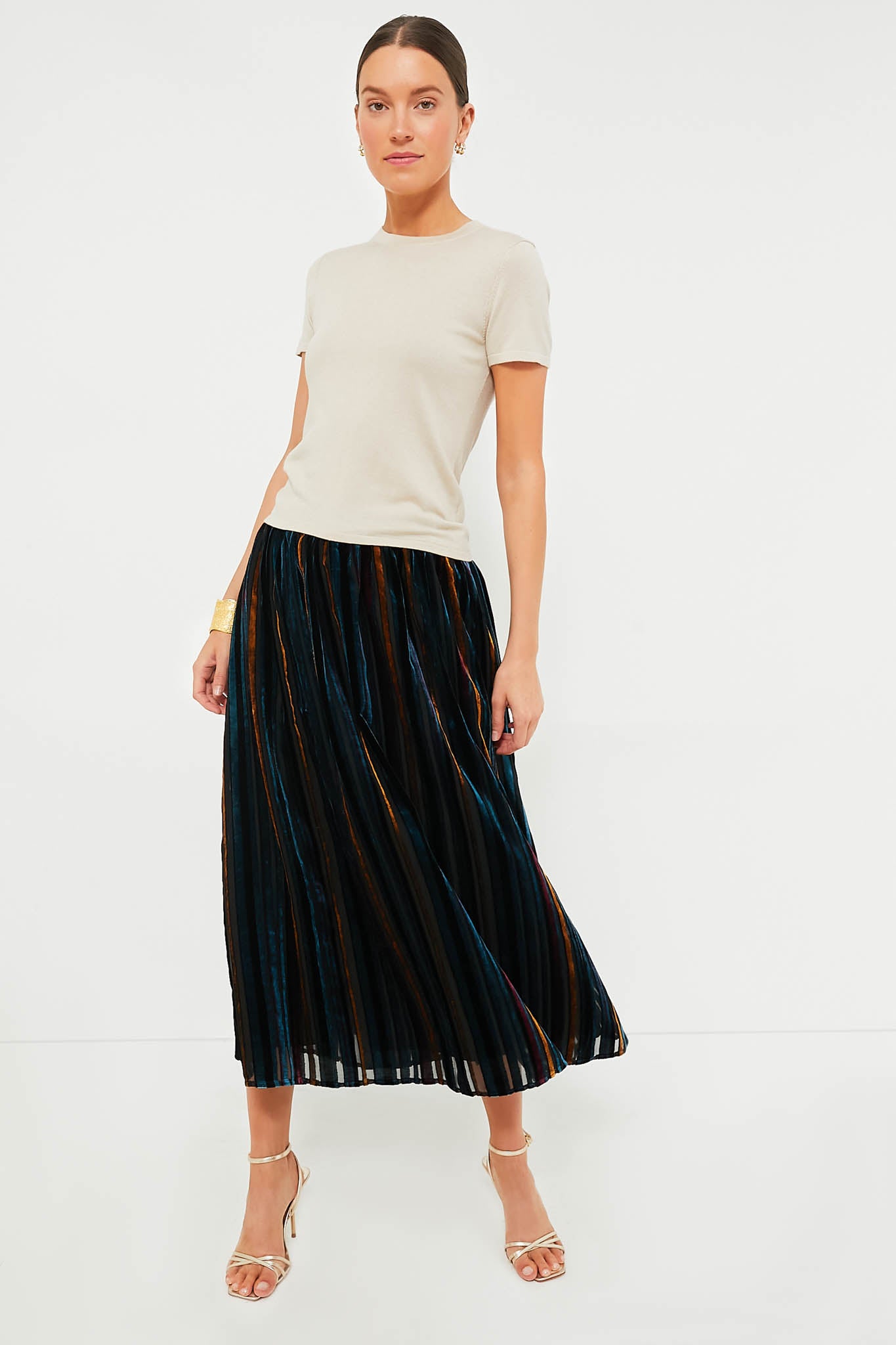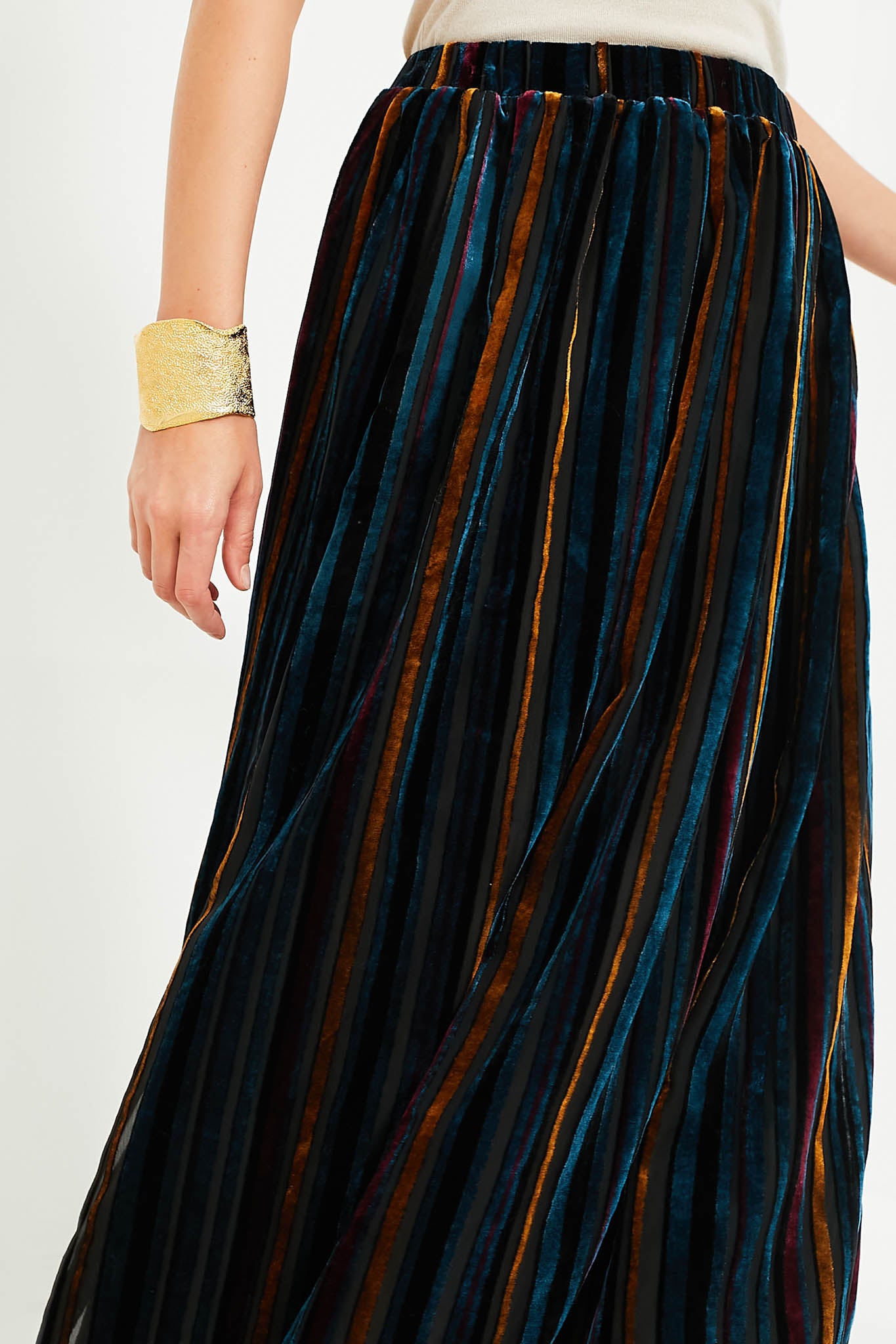 The Alba Skirt is like nothing in your closet- with a sheer black overlay with colorful velvet stripes and an elastic waistband. this midi is as striking as it is easy. Pair with a black bodysuit and heels or a turtleneck and boots!